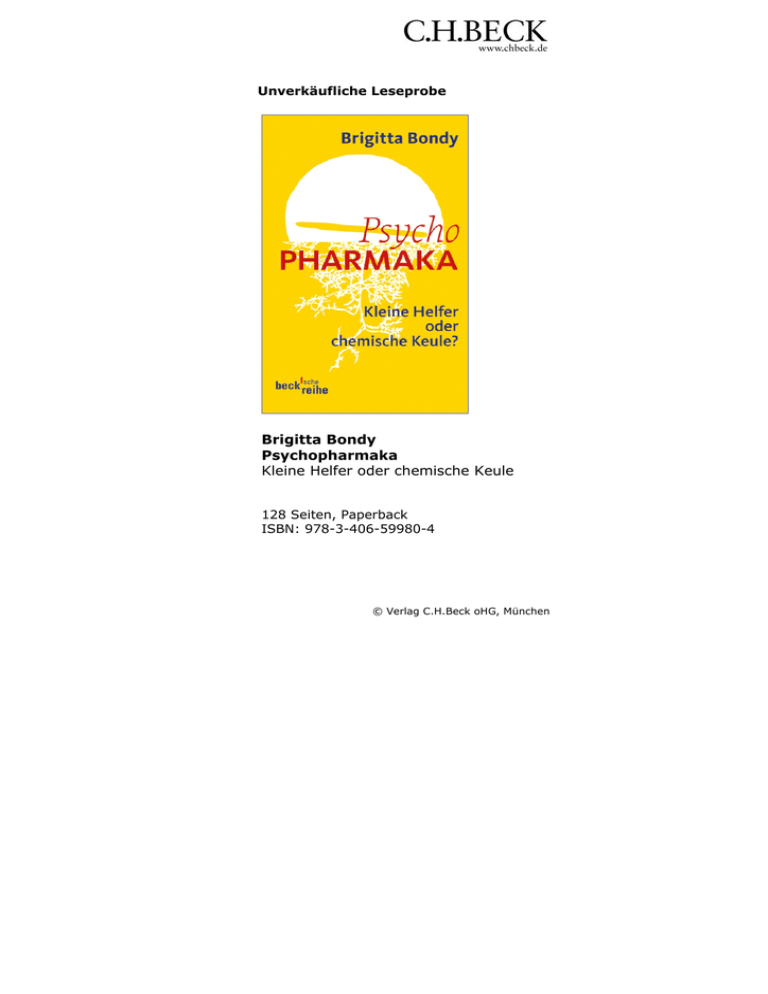 Unverkäufliche Leseprobe Brigitta Bondy Psychopharmaka Kleine Helfer oder chemische Keule 128 Seiten, Paperback ISBN: 978-3-406-59980-4 © Verlag C.H.Beck oHG, München Grundlagen der Wirkmechanismen der Psychopharmaka Die Bausteine des Gehirns sind die Nervenzellen. Sie besitzen die gleichen Gene und sind nach denselben Prinzipien gebaut wie andere Körperzellen auch, doch weisen sie einige Besonderheiten auf. Jede Nervenzelle besteht aus dem Zellkörper, den Zellfortsätzen (Dendriten) und der Nervenfaser. Der Zellkörper enthält den Zellkern und den biochemischen Apparat für die Bildung von Enzymen und von anderen lebenswichtigen Substanzen. Die Dendriten sind dünne Fortsätze des Zellkörpers, mit denen die Nervenzelle ankommende Signale aufnimmt. Auch die Nervenfaser ist ein Ausläufer der Nervenzelle, nur erheblich länger als die Dendriten. Sie dient als Leitungsbahn für Signale, die zu den anderen Nervenzellen übertragen werden. So ausgestattet, kann die Nervenzelle Botschaften von Tausenden von Nervenzellen empfangen und auf andere übertragen. Dabei treten die Zellfortsätze der Nervenzellen nicht durch direkten Kontakt miteinander in Beziehung, sondern durch die Wirkung chemischer Botenstoffe, der Neurotransmitter. Diese werden von den Nervenzellen selbst produziert und am Ende der Nervenfaser, wo diese sich zu einem kleinen Endknöpfchen verdicken, in Bläschen, den Vesikeln, gespeichert. Das Endknöpfchen der Nervenfaser und die Zellhaut (Membran) des an ihn angrenzenden Dendriten bilden gemeinsam die Synapse. Die Die Übertragung der Signale im Gehirn Die Übertragung der Signale im Gehirn 23 grundlagen der wirkmechanismen der psychopharmaka 24 beiden Nervenzellen, die sich in der Synapse treffen, haben keinen direkten Kontakt, sondern sind durch einen dünnen Zwischenraum, den synaptischen Spalt, voneinander getrennt. Die Mehrheit des Gehirngewebes wird nicht von den Nervenzellen und deren Fortsätzen gebildet, sondern von Stützgewebe, den Gliazellen. Sie füllen den Raum zwischen den Nervenzellen und ihren Fortsätzen aus, stützen das zarte Netzwerk und sind wichtig für die Ernährung der äußerst anfälligen Nervenzellen. Gliazellen sorgen für den reibungslosen Ablauf des normalen Stoffwechsels, indem sie die ständig anfallenden Stoffwechselschlacken und Abbauprodukte von Nervenzellen über die Blutgefäße abtransportieren lassen. Gliazellen haben aber nicht nur die Funktion als «Hausmeister des Gehirns», sie greifen selbst modulierend in die Funktion der Nervenzellen ein und sind auch bei der Übertragung von Signalen von Bedeutung. Nervenzellen haben auch eine weitere Besonderheit: Anders als die meisten Körperzellen können sie sich nach Abschluss der embryonalen Entwicklung nicht mehr teilen. Das bedeutet, dass der bis zur Geburt gebildete Vorrat an Nervenzellen ein Leben lang reichen muss. Zwar ist das Gehirn mit ausgezeichneten Reparaturmechanismen ausgestattet, welche kleine Schäden ausgleichen können, doch die Wirkung größerer Giftmengen, darunter auch die des Alkohols, lassen sich meistens nicht mehr reparieren. Zum Glück ist der Vorrat an Nervenzellen so groß, dass beim Untergang einiger Zellen noch keine wesentlichen Funktionsstörungen auftreten. Erst wenn ein gewisses Maß überschritten ist, werden Veränderungen offensichtlich, beispielsweise Vergesslichkeit oder psychische Auffälligkeiten. Die Informationsausbreitung von einer Nervenzelle zur nächsten geschieht an den Synapsen. Beim Eintreffen eines Signals entlassen einige Vesikel spezifische Botenstoffe (Neurotransmitter) in den schmalen Spalt zwischen der Membran der Endknöpfchen und der Membran des angrenzenden Dendriten, den synaptischen Spalt. Die Moleküle passieren den mit Flüssigkeit gefüllten schmalen Spalt und werden von Rezeptoren, speziell für jeden Botenstoff gebauten Eiweißstrukturen, gebunden. Dabei ändert sich die Struktur des Rezeptors, und diese Änderung führt zu weiteren Reaktionen in der benachbarten Nervenzelle. So wird die Information von einer Nervenzelle zur nächsten weitergeleitet. Da jede Nervenzelle mit Tausenden Nervenzellen in Verbindung steht, breitet sich dieser Mechanismus im weiteren Verlauf mit steigender Intensität über das gesamte Gehirn aus. Die freigesetzten Botenstoffe müssen den synaptischen Spalt jedoch auch wieder verlassen. Dies geschieht dadurch, dass sie über spezielle Eiweißstrukturen, die Transportproteine, wieder in die freisetzende Nervenzelle aufgenommen werden. Dort angekommen, werden sie entweder gespeichert oder durch spezifische Enzyme abgebaut. Dieser Vorgang beendet das Signal, da nun kein Botenstoff mehr im synaptischen Spalt zur Verfügung steht. Nach unseren heutigen Kenntnissen sind bei den meisten psychischen Erkrankungen Störungen im Stoffwechsel und im Gleichgewicht der Botenstoffe sowie in deren Interaktion mit den Rezeptoren ein wichtiger Bestandteil der Pathophysiologie. Durch Veränderungen der Produktion und damit des Angebotes an Botenstoffen, durch Veränderungen der Dichte oder Empfindlichkeit der Rezeptoren sowie durch Veränderungen der Proteine und Strukturen, die das Signal innerhalb der nächsten Nervenzelle weiterleiten, kommt es zum Ungleichgewicht in der Signalübertragung des Gehirns und damit zu psychischen Störungen wie Veränderungen der Emotionalität oder der kognitiven Funktionen. Es ist das Ziel der Behandlung mit Psychopharmaka, diesen «gestörten Stoffwechsel» auszugleichen und das durch die Botenstoffe eingeleitete Signal von einer Nervenzelle zur nächsten entweder zu verstärken oder zu reduzieren. Angriffspunkte der Psychopharmaka Angriffspunkte der Psychopharmaka 25 grundlagen der wirkmechanismen der psychopharmaka 26 Wenn Medikamente in das Gehirn gelangen, greifen sie auf verschiedene Weise in den Prozess der chemischen Übertragung ein. Alle Neurotransmitter werden mit Hilfe von speziellen Enzymen aus Vorstufen in den Nervenzellen gebildet. Bereits bei diesem Schritt 
