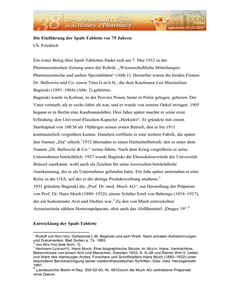 Die Einführung der Spalt-Tablette vor 75 Jahren Ch. Friedrich Ein erster Beleg über Spalt-Tabletten findet sich am 7. Mai 1932 in der Pharmazeutischen Zeitung unter der Rubrik: „Wissenschaftliche Mitteilungen. Pharmazeutische und andere Spezialitäten“ (Abb.1). Hersteller waren die beiden Firmen Dr. Ballowitz und Co. sowie Titus G.m.b.H., die dem Kaufmann Leo Maximilian Baginski (1891–1964) (Abb. 2) gehörten. Baginski wurde in Kolmar, in der Provinz Posen, heute in Polen gelegen, geboren. Der Vater verstarb, als er sechs Jahre alt war, und er wurde von seinem Onkel erzogen. 1905 begann er in Berlin eine Kaufmannslehre. Drei Jahre später machte er seine erste Erfindung, den Universal-Flaschen-Kapseler „Herkules“. Er gründete mit einem Startkapital von 100 M als 19jähriger seinen ersten Betrieb, den er bis 1911 kontinuierlich vergrößern konnte. Daneben eröffnete er eine weitere Fabrik, die später den Namen „Eta“ erhielt.11912 übernahm er einen Heilmittelbetrieb, den er unter dem Namen „Dr. Ballowitz & Co.“ weiter führte. Nach dem Krieg vergrößerte er seine Unternehmen beträchtlich. 1927 wurde Baginski die Ehrendoktorwürde der Universität Brüssel zuerkannt, wohl auch als Zeichen für seine inzwischen beträchtliche Anerkennung, die er als Unternehmer gefunden hatte. Ein Jahr später unternahm er eine Reise in die USA, auf der er die dortige Produktwerbung studierte.2 1931 gründete Baginski die „Prof. Dr. med. Much AG“, zur Herstellung der Präparate von Prof. Dr. Hans Much (1880–1932), einem Schüler Emil von Behrings (1854–1917), der ein bedeutender Arzt und Dichter war.3 Zu den von Much entwickelten Arzneimitteln zählten Hormonpräparate, aber auch das Abführmittel „Dragee 19“.4 Entwicklung der Spalt-Tablette 1 Rudolf von NOLTING: Geheimrat L.M. Baginski und sein Werk. Nach privaten Aufzeichnungen und Dokumenten. Bad Soden a. Ts. 1993. 2 von NOLTING [wie Anm. 1]. 3 Hermann LENHARTZ: Hans Much. Eine biographische Skizze. In: MUCH, Hans: Vermächtnis. Bekenntnisse von einem Arzt und Menschen. Dresden 1933, S. 9–38 und Rainer W IRTZ: Leben und Werk des Hamburger Arztes, Forschers und Schriftstellers Hans Much (1880–1932) unter besonderer Berücksichtigung seiner medizintheoretischen Schriften. Diss. med. Herzogenrath 1991. 4 Landesarchiv Berlin A Rep. 250-02-00, Nr. 691Durch die Much AG vertriebene Präparate ohne Datum. Zur Herstellung der Spalt-Tablette soll Baginskis seinen Tablettenmeister mit der Frage angeregt haben: „Sagense mal Meester, könn’se en Loch in ne Tablette machen, oder ne Kerbe oder sonst wat, det man im Dunkeln fühlen kann, wat es is.“ So entstand die „Tablette mit dem Spalt“, wie sie später genannt wurde. Baginski kam auf die Idee, eine solche Tablette herzustellen, als er einem Handwerksmeister zusah, der einen Spalt in Bleche stanzte. Später hat er diesen Handwerksmeister an seinem großen Erfolg teilhaben lassen.5 Die Rezeptur stammt von dem Chefarzt, Prof. Dr. med. J. Ferrua, Professor der Allgemeinen Pathologie (Abb. 3). Seine Identität ließ sich nicht ganz eindeutig klären. Vermutlich handelt es sich bei ihm um den ehemaligen spanischen Marinearzt und außerordentlichen Professor der Pathologie in London, Josef (José) Ferrúa.6 Dieser entwickelte sein Kombinationspräparat, nach dem Prinzip des schweizerischen Pharmakologen Emil Bürgi (1872–1947), der feststellte: „Wenn man eine geringe Menge eines einzelnen chemischen Wirkstoffes z.B. verdreifacht, so erzielt man damit im allgemeinen nicht eine dreifach so starke Wirkung. Dagegen kann man bei der Kombination von 3 verschiedenen Wirkstoffen, die alle als ausgezeichnete spezifische Mittel bekannt sind, eine sogar wesentlich größere als die dreifache Wirkung erzielen.“7 Die Zusammensetzung der Spalt-Tablette war 1932 folgende: • Phenacetin 0,33 g • Phenyldimethylpyrazolon 0,116 g• Phenylglykolsäure-benzylester 0,07 g• Coffein 0,001 g• Ephedrin 0,003 g• Indifferente Zusätze 0160 pro Tab. (für das Inland).8 Die Tablette sollte auch gegen spastische Kopfschmerzen helfen. 1940 monierte indes der Präsident des Werberates der Deutschen Wirtschaft dies. Die wissenschaftliche Abteilung der Firma verwies in ihrem Schreiben vom 10. Juli 1940 jedoch auf zahlreiche Aufsätze in der Fachliteratur.9 Die pharmakologischen Gutachten stammten von Prof. Dr. Hermann Steudel (1871–1967), Ordinarius für Physiologie an der Universität Berlin, und Prof. Otto Riesser (1882–1949), Professor der Pharmakologie an 5 von NOLTING [wie Anm. 1]. Der Verfasser dankt Frau Rafaela Dominguez Vilaplana für zweckdienliche Auskünfte. 7 Landesarchiv Berlin A Rep. 250-02-00, Nr. 104 Spalttabletten 1934-1940 und Emil Bürgi: Die Arzneimittelkombinationen. Berlin 1938. 8 Landesarchiv Berlin A Rep. 250-02-00, Nr. 57 Patentüberprüfung 9 Landesarchiv Berlin A Rep. 250-02-00, Nr. 174 Werberat der deutschen Wirtschaft 1938-1940 6 der Universität Breslau.10 Letzterer wurde wegen seiner „jüdischen Herkunft“ später entlassen.11 Beide wiesen die Unschädlichkeit des Präparates und seiner einzelnen Bestandteile nach. Patentierung der Spalt-Tablette Für Spalt-Tablette als Kombinationspräparat erwies sich eine Patentanmeldung der Rezeptur als wenig erfolgversprechend, da diese jederzeit von anderen Herstellern durch minimale Variierung nachgeahmt werden konnte. Neu war jedoch die Idee Baginskis, die Tablette mit einem Spalt zu versehen. 1931 meldete Baginski beim Reichspatentamt ein entsprechendes Warenzeichen an; ein Jahr später wurde die Patentanmeldung indes zurückgewiesen.12 Daher erfolgte nun eine Anmeldung als Wort-Bild-Zeichen. Am 9. Mai 1932 wurde das Warenzeichen auch international unter Nr. 79069 registriert. Es handelt sich dabei um ein Wort-Bild-Zeichen: „Es besteht aus einer Abbildung der [...] Spalt-Tablette, dem Worte ‚Spalt-Tabletten’ und einer etwas elliptischen Umrahmung, sowie zwei Pfeilen, die auf den Spalt hinweisen“ (Abb.4)