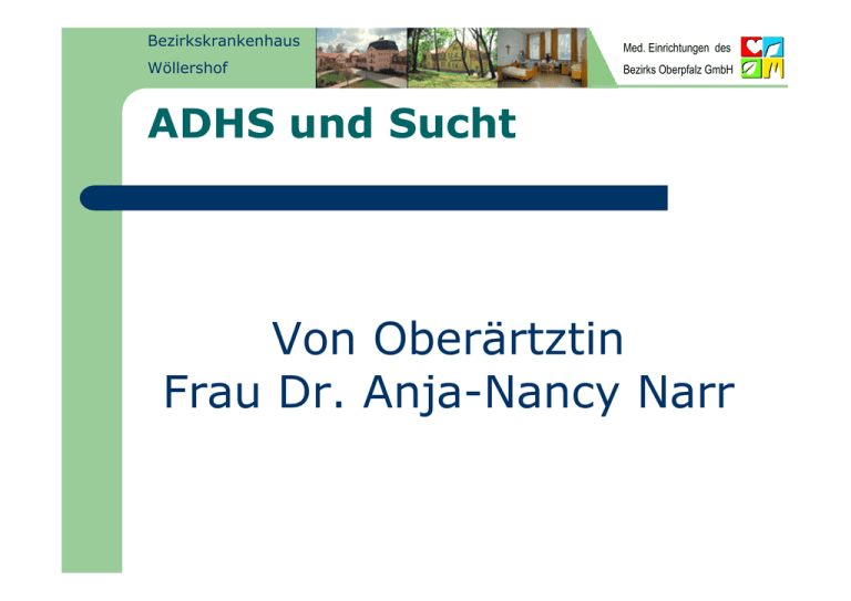 Bezirkskrankenhaus Med. Einrichtungen des Wöllershof Bezirks Oberpfalz GmbH ADHS und Sucht Von Oberärtztin Frau Dr. Anja-Nancy Narr Bezirkskrankenhaus Med. Einrichtungen des Wöllershof Bezirks Oberpfalz GmbH ADHS Kardinalsymptome Aufmerksamkeitsstörung Überaktivität Von den zwei Kardinalsymptomen wird mindestens eins gefordert zur Diagnose. Bezirkskrankenhaus Med. Einrichtungen des Wöllershof Bezirks Oberpfalz GmbH weitere Symptombereiche Aufmerksamkeitsstörung in Form von Ablenkbarkeit und Schusseligkeit. Motorische Überaktivität bei Erwachsenen oft in Form von innerer Gespanntheit, innerer Unruhe zu finden. Affektlabilität (launisch) Desorganisiertes Verhalten Bezirkskrankenhaus Med. Einrichtungen des Wöllershof Bezirks Oberpfalz GmbH weitere Symptombereiche Verminderte Affektkontrolle, z.B. gesteigerte Reizbarkeit und Jähzorn Impulsivität Emotionale Überreagibilität, gemeint sind überschießende Emotionen, z.B. Angst bei Stress Wissenschaftsgeschichte Heinrich Hoffmann 1846 (Psychiater) Ordinarius für Psychiatrie Erster Leiter des ersten psychiatrischen Krankenhauses in Frankfurt/ Main Wegen Rastlosigkeit und Exzessen als Student zweifelte sein Vater an seiner Fähigkeit, jemals selbständig leben zu können Eigene Erfahrung und Beobachtungen an Kindern seiner Freunde Struwwelpeter für dreijährigen Sohn geschrieben Bezirkskrankenhaus Med. Einrichtungen des Wöllershof Bezirks Oberpfalz GmbH Struwelpeter Bindungsstörung: durch oppositionelles Verhalten, Versuch der Selbststabilisierung Selbstwertprobleme, Alltagsprobleme Von Heinrich Hoffmann 1846, Bezirkskrankenhaus Med. Einrichtungen des Wöllershof Bezirks Oberpfalz GmbH das neugierige, Verbote übertretende Paulinchen Ermahnungen nicht zugänglich, fehlende Voraussicht, Bezugspersonen haben keinen Einfluss. (Versuchungssituation auch bei fliegendem Robert) Bezirkskrankenhaus Med. Einrichtungen des Wöllershof Bezirks Oberpfalz GmbH Der fliegende Robert -Thrill seeking Bezirkskrankenhaus Med. Einrichtungen des Wöllershof Bezirks Oberpfalz GmbH Ludwig und Kaspar die „neckenden“, dissozialen übermütigen Jungen Auffälliges Kontaktverhalten, Selbstwertprobleme, Kontaktverhalten fehlende Voraussicht Ermahnungen nicht zugänglich, Antiautoritär Bezirkskrankenhaus Med. Einrichtungen des Wöllershof Bezirks Oberpfalz GmbH der ermüdende „wilde“ Jäger Defizit im Durchhaltevermögen und Daueraufmerksamkeit, schnell gelangweilt, rasch ermüdbar. Bezirkskrankenhaus Med. Einrichtungen des Wöllershof Bezirks Oberpfalz GmbH der verträumte Hans Guck in die Luft verträumt, unaufmerksam, Kontaktverhalten der introvertierte Daumenlutscher Bezirkskrankenhaus Med. Einrichtungen des Wöllershof Bezirks Oberpfalz GmbH Der Zappelphilipp Hyperaktiv Ermahnungen nicht zugänglich Bezirkskrankenhaus Med. Einrichtungen des Wöllershof Bezirks Oberpfalz GmbH Prävalenzen ADHS ist mit 3 – 5 % die häufigste Diagnose im Kindesalter. Fortdauer der Störung bis ins Erwachsenenalter zu 35 – 50 % ADHS im Erwachsenenalter 1 – 2,5 %. Bezirkskrankenhaus Med. Einrichtungen des Wöllershof Bezirks Oberpfalz GmbH wissenschaftliche Befunde: Genetik vs Umwelt Hoher genetischer Einfluss (60-80% (-95%)) Risiko für erst gradig Verwandte um das 5 fache erhöht Schimmelmann B et al 2006 Genetische Befunde bei der Aufmerksamkeitsdefizit- und Hyperaktivitätsstörung (ADHS) 'Z Kinder Jugendpsychiatr. Psychother. 2006 Nov;34(6):425-33 monozygotische Konkordanz: 80-98% (Brasset- Harknett A et al 2007) Bezirkskrankenhaus Med. Einrichtungen des Wöllershof Bezirks Oberpfalz GmbH wissenschaftliche Befunde: Genetik vs Umwelt Umweltfaktoren: ca 20 -25%, u.a. -niedriger Sozialstatus -elterliche Konflikte, Scheidung -Vernachlässigung, Missbrauch in der Kindheit Früher Verlust oder Trennung von Familienangehörigen (Cantwell 1996) Polygenetisch deshalb auch so vielfältiges Erscheinungsbild und unterschiedliche Medikamentenwirkung Dopamintransporter (Erhöhung) Dopamin D4-Rezeptor,Noradrenalin Receptoren ( 2a und 2b Rec), COMT, auch Serotonin u.a.? (Krause 2003; Adhs im Erwachsenenalter) Bezirkskrankenhaus Med. Einrichtungen des Wöllershof Bezirks Oberpfalz GmbH Ursachen der Zunahme der Symptomvielfalt des ADHS im Erwachsenenalter Beim Erwachsenwerden zunehmende geringere äussere Strukturierung, mehr Eigenverantwortung gefordert Zunehmende komplexere Alltagswelt: persönliche Entwicklung bedarf stetiger Entscheidungsfindung Zunehmende psychodynamische Komponenten durch : -vermehrte und langanhaltende negative Erfahrungen -vermindertes Selbstbewußtsein und -verminderte Kompetenz zur kognitiven und emotionalen Verarbeitung Zusätzliche Entwicklung der psychischen Begleiterkrankungen Bezirkskrankenhaus Med. Einrichtungen des Wöllershof Bezirks Oberpfalz GmbH Zusammenfassung Wissenschaftsgeschichte Hinweise auf biologisch bedingte Entwicklung von Anfang an (vor allem Vererbung ) später: Wirkung von Stimulantien Umweltbedingt? Reaktionsweisen der Eltern - und warum sind die Eltern so? frühe negative Erfahrungen Kontakt- und Bindungsstörung Zuerst Wahrnehmung der Hyperaktivität, später auch der Aufmerksamkeitsstörungen und der emotionalen Schwierigkeiten Sehr späte Wahrnehmung in der Erwachsenenpsychiatrie Bezirkskrankenhaus Med. Einrichtungen des Wöllershof Bezirks Oberpfalz GmbH Zusammenfassung wissenschaftlicher Befunde Genetik: Dopaminerge Funktionstörungen (DAT, DRD4 Rec.), auch noradrenerg Bildgebung: Veränderungen striatofrontaler Leitungsbahnen, frontale und auch cerebelläre Funktionstörungen Neuropsychologische Leistungsdefizite bzgl Exekutiver Funktionen, nicht spezifisch für ADHS Bezirkskrankenhaus Med. Einrichtungen des Wöllershof Bezirks Oberpfalz GmbH Comorbiditäten Insgesamt sind bei ADHS viele, lediglich 3 % haben 0, 11 % eine Nebendiagnose, 12 % zwei weitere psychiatrische Diagnosen, 18 % drei weitere psychiatrische Diagnosen und 56 % bis zu vier weitere psychiatrische Diagnosen. Häufigste Nebendiagnosen sind Störu