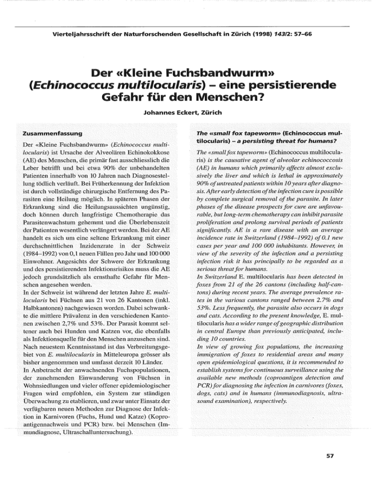 Vierteljahrsschrift der Naturforschenden Gesellschaft in Zürich (1998) 143/2: 57-66 Devi «Kleine •uc[isbandwurm» (Echinococc-u multilocularis) - eine persistio o de Gefahr für den Menschen? Johannes Eckert, Zürich Zusammenfassung Der «Kleine Fuchsbandwurm» (Echinococcus multilocularis) ist Ursache der Alveolären Echinokokkose (AE) des Menschen, die primär fast ausschliesslich die Leber betrifft und bei etwa 90% der unbehandelten Patienten innerhalb von 10 Jahren nach Diagnosestellung tödlich verläuft. Bei Früherkennung der Infektion ist dHrch vollsländige chirurgische Entfernung des Parasiten eine Heilung möglich. In späteren Phasen der Erkrankung sind die Heilungsaussichten ungünstig, doch können durch langfristige Chemotherapie das Parasitenwachstum gehemmt und die Überlebenszeit der Patienten wesentlich verlängert werden. Bei der AE handelt es sich um eine seltene Erkrankung mit einer durchschnittlicheH Inzidenzrale in der Schweiz (1984-1992) von 0,1 neuen Fällen pro Jahr und 100 000 Einwohner. Angesichts der Schwere der Erkrankung und des persistierenden Infektionsrisikos muss die AE jedoch grundsätzlich als ernsthafte Gefahr für Menschen angesehen werden. In der Schweiz ist während der letzten Jahre E. multilocularis bei Füchsen aus 21 von 26 Kantonen (inkl. HalbkantoneH) nachgewiesen worden. Dabei schwankte die mittlere Prävalenz in den verschiedenen Kantonen zwischen 2,7% und 53%. Der Parasit kommt seltener auch bei HundeH und Katzen vor, die ebenfalls als Infektionsquelle far den Menschen anzusehen sind. Nach neuestem Kenntnisstand ist das Verbreitungsgebiet von E. multilocularis in Mitteleuropa grösser als bisher angenommen und umfassl derzeit 10 Länder. In Anbetracht der anwachsenden Fuchspopulationen, der zunehmenden Einwanderung von Füchsen in Wohnsiedlungen und vieler offener epidemiologischer FrageH wird empfohlen, ein System zur ständigen Überwachung zu etablieren, und zwar unter Einsatz der verfügbaren neuen Methoden zur Diagnose der Infektion in Karnivoren (Fuchs, Hund und Katze) (Koproantigennachweis und PCR) bzw. bei Menschen (Immundiagnose, Ultraschalluntersuchung). The «small fox tapeworm» (Echinococcus multilocularis) — a persisting threat for humans? The «small fox tapeworm» (Echinococcus multilocularis) is the causative agent of alveolar echinococcosis (AE) in humans which primarily affects almost exclusively the liver and which is lethal in approximately 90% of untreated patients within 10 years after diagnosis. After early detection of the infection cure is possible by complete surgical removal of the parasite. In later phases of the disease prospects for cure are unfavourable, but long-term chemotherapy can inhibit parasite proliferation and prolong survival periods of patients significantly. AE is a rare disease with an average incidence rate in Switzerland (1984-1992) of 0.1 new cases per year and 100 000 inhabitants. However, in view of the severity of the infection and a persisting infection risk it has principally to be regarded as a serious threat for humans. In Switzerland E. multilocularis has been detected in foxes from 21 of the 26 cantons (including half-cantons) during recent years. The average prevalence rates in the various cantons ranged between 2.7% and 53%. Less frequently, the parasite also occurs in dogs and cats. According to the present knowledge, E. multilocularis has a wider range of geographic distribution in central Europe than previously anticipated, including 10 countries. In view of growing fox populations, the increasing immigration of foxes to residential areas and many open epidemiological questions, it is recommended to establish systems for continuous surveillance using the available new methods (coproantigen detection and PCR) for diagnosing the infection in carnivores (foxes, dogs, cats) and in humans (immunodiagnosis, ultrasound examination), respectively. 57 Johannes Eckert 1 EINLEITUNG Im Jahr 1852 beschrieb BUHL in München eine bis dahin unbekannte Lebergeschwulst des Menschen, die er wegen ihrer alveolären Struktur als «Alveolarkolloid» bezeichnete (PoSSELT, 1928). Bald danach (1855) identifizierte der berühmte Pathologe VIRCHOW einen Parasiten (Bandwurm) der Gattung Echinococcus als Ursache dieser Veränderung und nannte sie «multilokuläre, ulzerierende Echinokokkengeschwulst der Leber» (PoSSELT, 1928). Später bürgerte sich der Name «Alveoläre Echinokokkose» (AE) ein, und es stellte sich heraus, dass die Erkrankung dnrch ein Larvalstadium (Metazestode) des «Kleinen oder gefährlichen Fuchsbandwurmes» (Echinococcus multilocularis) hervorgerufen wird. In der Schweiz wurden die ersten Fälle von AE etwa 10 Jahre nach der Entdeckung VIRCHOW's diagnostiziert, und bis 1924 erfasste DARDEL (1927) 97 Fälle bei Schweizern und 5 importierte Fälle. Zu der damals selten diagnostizierten AE erwähnt DARDEL (1927), dass sie «sehr bösartig ist und der Träger fast immer an dieser Krankheit zugrunde geht». Wie ist die Situalion heute zu beurteilen? Ist die AE des Menschen noch immer eine in der Regel tödliche Infektion, wie hoch ist das Infektionsrisiko, stellen das Anwachsen der Fuchspopulationen und die zunehmende Einwanderung von Füchsen in Wohngebiete neue Risikofaktoren dar, und gibt es Fortschritte in der Diagnostik, Prophylaxe und BekämpfuHg? Zu diesen und anderen Fragen, die während der letzten Jahre zum Teil in den Massenmedien diskutiert worden sind, soll der folgende Artikel einige Informationen vermitteln. 2 Luftfeuchte von 27% innerhalb 2 Tagen ihre Infektiosität (VEIT et al., 1995). Die Bandwurmeier können von natürlichen Zwischenwirten (meistens Nagetieren) sowie auch gelegentlich vom Menschen und anderen Fehlwirten per os aufgenommen werden. Im Gegensatz zu den Zwischenwirten haben Fehlwirte im Entwicklungszyklus keine Bedeutung und stellen für den Parasiten eine biologische Sackgasse dar (Abb. 1). DER PARASIT UND SEIN ENTWICKLUNGSZYKLUS Der «Kleine Fuch