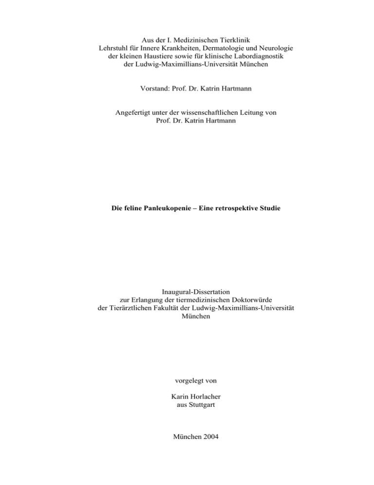 Aus der I. Medizinischen Tierklinik Lehrstuhl für Innere Krankheiten, Dermatologie und Neurologie der kleinen Haustiere sowie für klinische Labordiagnostik der Ludwig-Maximillians-Universität München Vorstand: Prof. Dr. Katrin Hartmann Angefertigt unter der wissenschaftlichen Leitung von Prof. Dr. Katrin Hartmann Die feline Panleukopenie – Eine retrospektive Studie Inaugural-Dissertation zur Erlangung der tiermedizinischen Doktorwürde der Tierärztlichen Fakultät der Ludwig-Maximillians-Universität München vorgelegt von Karin Horlacher aus Stuttgart München 2004 Gedruckt mit der Genehmigung der Tierärztlichen Fakultät der Ludwig-Maximilians-Universität München Dekan: Univ.-Prof. Dr. A. Stolle Referentin: Univ.-Prof. Dr. K. Hartmann Korreferent: Priv.-Doz. Dr. W. Breuer Tag der Promotion: 23. Juli 2004 Auch tausend Meilen beginnen mit dem ersten Schritt. (aus China) Inhaltsverzeichnis Inhaltsverzeichnis I. EINLEITUNG ............................................................................................... 1 II. LITERATURÜBERSICHT: FELINE PANLEUKOPENIE .................... 2 1. Erreger ........................................................................................................... 2 2. Pathogenese.................................................................................................... 5 3. Pathologische Veränderungen ..................................................................... 9 3.1. Makroskopische Veränderungen............................................................. 9 3.2. Histologische Veränderungen ................................................................. 9 3.2.1. Veränderungen des Darms ................................................................ 10 3.2.2. Veränderungen des Lymphgewebes ................................................. 10 3.2.3. Veränderungen des Knochenmarks .................................................. 11 3.2.4. Veränderungen der Leber.................................................................. 11 3.2.5. Veränderungen des zentralen Nervensystems................................... 11 4. Klinische Symptome ................................................................................... 12 4.1. Symptome nach horizontaler Infektion................................................. 12 4.1.1. Verlaufsformen ................................................................................. 12 4.1.1.1. Perakuter Verlauf ...................................................................... 12 4.1.1.2. Akuter Verlauf .......................................................................... 12 4.1.1.3. Subakuter Verlauf ..................................................................... 13 4.1.1.4. Klinisch inapparenter Verlauf................................................... 13 4.1.1.5. Komplikationen......................................................................... 14 4.2. Symptome nach intrauteriner Infektion ................................................ 15 5. Labordiagnostische Veränderungen ......................................................... 15 5.1. Leukopenie............................................................................................ 16 5.2. Anämie .................................................................................................. 17 5.3. Thrombozytopenie ................................................................................ 17 5.4. Hypoproteinämie................................................................................... 18 5.5. Weitere labordiagnostische Veränderungen ......................................... 19 6. Diagnose ....................................................................................................... 20 6.1. Direkter Erregernachweis ..................................................................... 20 6.2. Indirekter Erregernachweis ................................................................... 23 6.3. Diagnose post mortem........................................................................... 23 7. Impfung........................................................................................................ 24 7.1. Aktive Immunisierung .......................................................................... 24 7.1.1. Bestimmung des optimalen Impfzeitpunkts...................................... 26 7.1.2. Impfprotokolle .................................................................................. 28 7.1.3. Ausnahmen vom empfohlenen Impfschema ..................................... 29 7.2. Passive Immunisierung ......................................................................... 29 8. Management ................................................................................................ 30 9. Therapie ....................................................................................................... 31 9.1. Passive Immunisierung zur Therapie .................................................... 31 Inhaltsverzeichnis 9.2. 9.3. 9.4. 9.5. 9.6. Therapie mit felinem Interferon-ω........................................................ 31 Therapie mit humanem granulozytenstimulierenden Faktor ................ 32 Antibiose ............................................................................................... 32 Infusionstherapie................................................................................... 33 Weitere begleitende Maßnahmen.......................................................... 34 III. MATERIAL UND METHODIK ............................................................... 37 1. Material........................................................................................................ 37 1.1. Tiere der Prävalenzbestimmung von Parvo- und Coronaviren............. 37 1.2. Tiere der retrospektiven Auswertung.................................................... 37 1.3. Tiere der diagnostischen Vergleichsstudie .......................