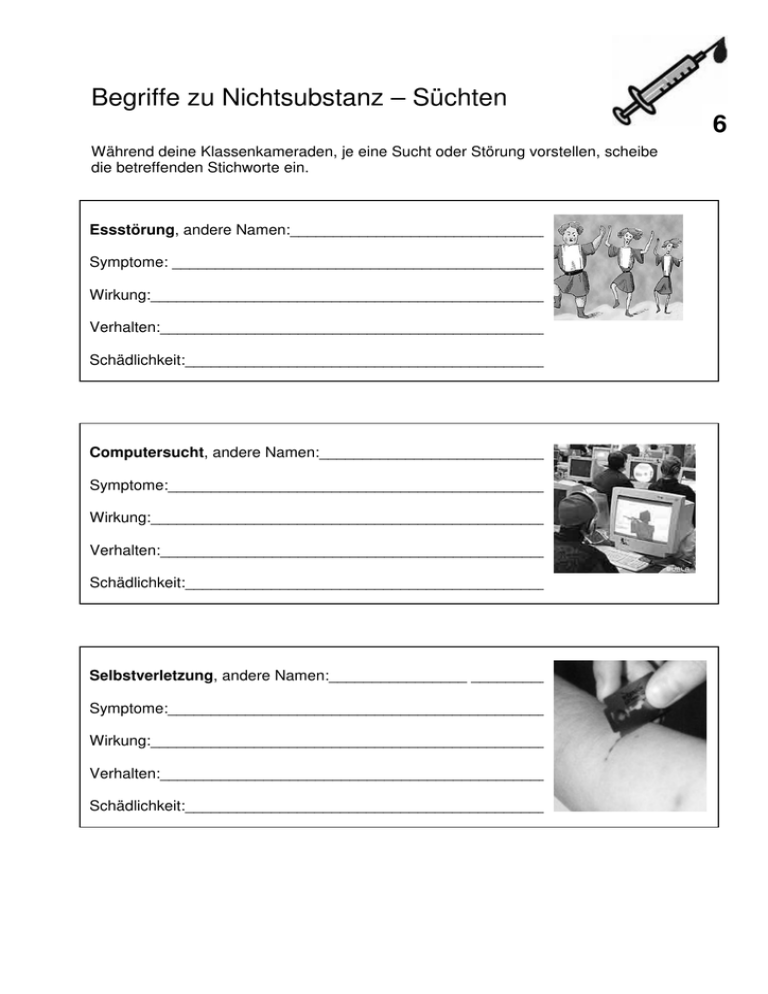 Begriffe zu Nichtsubstanz – Süchten 6 Während deine Klassenkameraden, je eine Sucht oder Störung vorstellen, scheibe die betreffenden Stichworte ein. Essstörung, andere Namen:____________________________________________ Symptome: ________________________________________________ Wirkung:__________________________________________________ Verhalten:________________________________________________ Schädlichkeit:______________________________________________ Computersucht, andere Namen:____________________________________________ Symptome:________________________________________________ Wirkung:__________________________________________________ Verhalten:________________________________________________ Schädlichkeit:______________________________________________ Selbstverletzung, andere Namen:________________ ________________ Symptome:________________________________________________ Wirkung:__________________________________________________ Verhalten:________________________________________________ Schädlichkeit:______________________________________________ 7 Spiritismus, Sekten, andere Namen: ________________________________________ Symptome:________________________________________________ Wirkung:__________________________________________________ Verhalten:________________________________________________ Schädlichkeit:______________________________________________ Sexsucht, andere Namen:____________________________________________ Herstellung:________________________________________________ Wirkung:__________________________________________________ Konsumart:________________________________________________ Schädlichkeit:______________________________________________ Handysucht, andere Namen: _____________________________________ Herstellung:________________________________________________ Wirkung:__________________________________________________ Konsumart:________________________________________________ Schädlichkeit:______________________________________________ Sammelsucht, andere Namen: ___________________________________ Herstellung:________________________________________________ Wirkung:__________________________________________________ Konsumart:________________________________________________ Schädlichkeit:______________________________________________