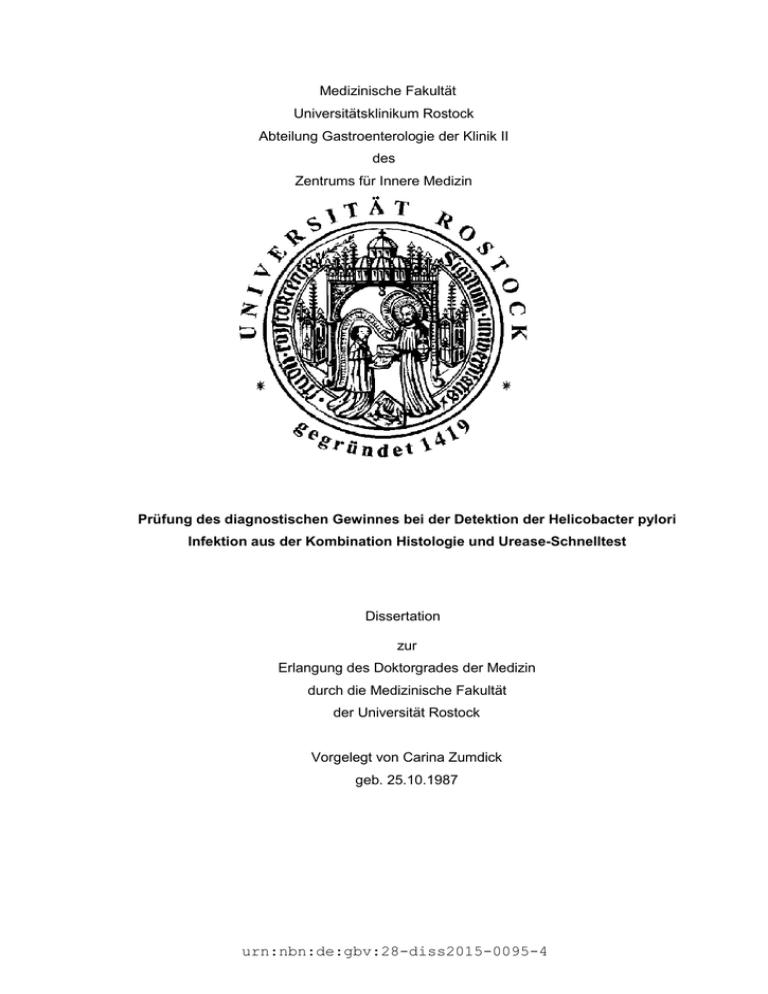Medizinische Fakultät Universitätsklinikum Rostock Abteilung Gastroenterologie der Klinik II des Zentrums für Innere Medizin Prüfung des diagnostischen Gewinnes bei der Detektion der Helicobacter pylori Infektion aus der Kombination Histologie und Urease-Schnelltest Dissertation zur Erlangung des Doktorgrades der Medizin durch die Medizinische Fakultät der Universität Rostock Vorgelegt von Carina Zumdick geb. 25.10.1987 urn:nbn:de:gbv:28-diss2015-0095-4 Dekan: Prof. Dr.med. Emil Christian Reisinger 1. Gutachter: Prof. Dr. med. Stefan Liebe ehemaliger Direktor der Abteilung Gastroenterologie, Universitätsmedizin Rostock 2. Gutachter: PD Dr. med. Frank Walther Universitäts- Kinder- und Jugendklinik, Universitätsmedizin Rostock 3. Gutachter: Prof. Dr. med. Dieter Nürnberg Chefarzt der Medizinischen Klinik B, Neuruppin Tag der Einreichung: 02.04.2014 Tag der mündlichen Verteidigung: 27.10.2014 Inhaltsverzeichnis 1. Einleitung und Fragestellung ________________________________________ 5 2. Helicobacter pylori ________________________________________________ 7 2.1 Epidemiologie ________________________________________________________ 7 2.2 Morphologische und biochemische Eigenschaften von Helicobacter pylori _________ 7 2.3 Virulenzfaktoren von Helicobacter pylori ___________________________________ 8 2.4 Ätiopathogenetische Rolle ______________________________________________ 9 2.5 Diagnostik ___________________________________________________________ 9 2.5.1 Invasive Nachweisverfahren________________________________________________ 10 2.5.1.1 Urease-Schnelltest ___________________________________________________ 11 2.5.1.2 Histologische Verfahren _______________________________________________ 12 2.5.1.3 Mikrobiologischer Nachweis ____________________________________________ 14 2.5.1.4 Polymerase-Chain-Reaction (PCR) aus Biopsiematerial ______________________ 14 2.5.2 Nicht invasive Nachweismethoden ___________________________________________ 15 2.5.2.1 13C-Harnstoff-Atemtest ________________________________________________ 15 2.5.2.2 Stuhl-Antigentest auf Basis monoklonaler Antikörper _________________________ 15 2.5.2.3 IgG-Antikörpernachweis im Serum _______________________________________ 16 2.6 Therapie ___________________________________________________________ 16 2.6.1 Medikamentöse Therapie __________________________________________________ 17 3. Methode und Materialien __________________________________________ 18 3.1 Studiendesign _______________________________________________________ 18 3.1.1 Ein- und Ausschlusskriterien _______________________________________________ 19 3.2 Helicobacter-pylori-Histologie ___________________________________________ 19 3.3 Helicobacter-pylori-Urease-Schnelltest (HUT) ______________________________ 19 3.4 Ablauf der Probenentnahme ____________________________________________ 20 4. Ergebnis _______________________________________________________ 20 4.1 Studiendesign _______________________________________________________ 20 4.1.1 Patientendaten __________________________________________________________ 20 4.1.2 Histologische Daten ______________________________________________________ 21 4.2 Demographische Daten _______________________________________________ 22 4.3 Helicobacter pylori Befunde ____________________________________________ 24 4.4 Urease-Schnelltest ___________________________________________________ 26 4.4.1 Farbumschlag des Urease-Schnelltests _______________________________________ 30 4.5 Medikation und vorausgegangene Helicobacter-pylori-Eradikation ______________ 32 5. Diskussion _____________________________________________________ 38 5.1 Charakterisierung des Patientenkontingentes ______________________________ 38 5.2 Diagnostische Sensitivität des Urease-Schnelltest___________________________ 39 5.2.1 Qualitätssichernde Maßnahmen bezüglich Urease-Schnelltest_____________________ 41 5.3 Diskussionen der Thesen ______________________________________________ 41 6. Empfehlung ____________________________________________________ 46 7. Zusammenfassung _______________________________________________ 48 8. Thesen zur Dissertation ___________________________________________ 50 9. Literaturverzeichnis ______________________________________________ 54 10. Eidesstattliche Erklärung _________________________________________ 61 11. Danksagung ___________________________________________________ 62 12. Lebenslauf ____________________________________________________ 63 1. Einleitung und Fragestellung 1983 wurde Helicobacter pylori, damals noch als Campylobacter pylori bezeichnet, von den beiden Australiern Robin Warren und Barry Marshall, nachdem er lange Zeit vergessen war, wiederentdeckt und kultiviert. Beschrieben wurde das Bakterium schon 1893 von Bizzozero, eine Kultivierung war damals aber noch nicht möglich. In den ersten Jahren konzentrierte sich das Interesse auf die Bedeutung der Helicobacter-pylori-Infektion für die gastroduodenale Ulcuskrankheit. Später rückte Helicobacter pylori immer stärker in den Mittelpunkt des Interesses als darüber hinaus auch eine ätiopathogenetische Bedeutung des Helicobacter pylori für das Magenkarzinom und das gastrale MALT-Lymphom eruiert wurde. Des Weiteren fand man Assoziationen mit anderen gastralen und extragastralen Erkrankungen. Umso wichtiger erscheint es somit, diesen Keim sicher nachzuweisen und sinnvoll zu behandeln. Das diagnostische Spektrum reicht von invasiven bis zu nichtinvasiven sowie direkten und indirekten Nachweismethoden. Fragestellung In der S3-Leitlinie der Deutschen Gesellschaft für Verdauungs- und Stoffwechselkrankheiten (DGVS) wird empfohlen zwei positive Testergebnisse zur sicheren Diagnostik einer Helicobacter-pylori-Infektion heranzuziehen. In der Praxis bedeutet dies, dass zumeist ein Urease-Schnelltest und eine anschließende histologische Untersuchung zur Detektion des Helicobacter pylori erfolgt. Es stellt sich die Frage, ob die beiden eingese