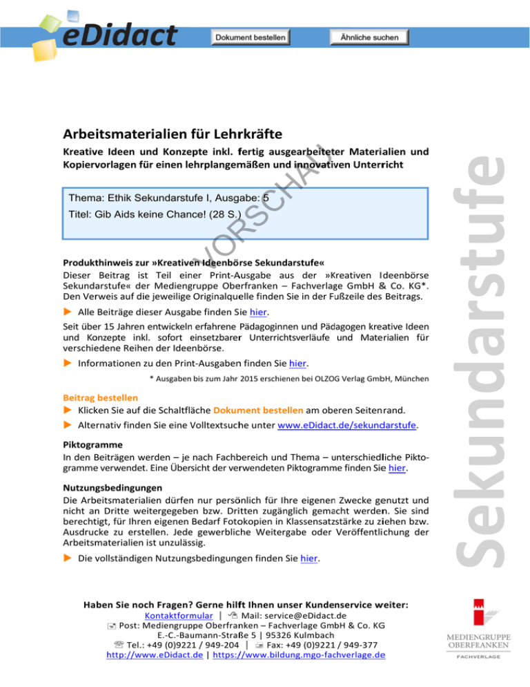 www.edidact.de/Suche/index.htm?category=102570&q=D3080305355 www.edidact.de/Suche/index.htm?category=102570&q=S Arbeitsmate erialien ffür Lehrrkräfte SC H AU Kreativve Ideen und u Konze epte inkl. ffertig ausggearbeiteter Materiaalien und Kopiervvorlagen für einen le ehrplangem mäßen und d innovativ ven Unterrricht Thema: Ethik Sekundarstufe I, Ausgabe: 5 VO R Titel: Gib Aids keine Chance! (28 S.) Produktthinweis zu ur »Kreative en Ideenbö rse Sekundarstufe« Dieser Beitrag isst Teil ein ner Print‐A Ausgabe au us der »K Kreativen Iddeenbörse Sekundaarstufe« deer Medienggruppe Obeerfranken – – Fachverlag ge GmbH & & Co. KG*. Den Verrweis auf diie jeweilige Originalqueelle finden Sie in der Fußzeile des Beitrags. Alle Beiträge dieser Ausga be finden SSie hier. www.edidact.de/Suche/index.htm?category=102570&q=L30805 Seit übeer 15 Jahren n entwickeln n erfahrene Pädagoginn nen und Pädagogen kreaative Ideen und Ko onzepte inkkl. sofort einsetzbarer e r Unterrich htsverläufe und Mateerialien für verschieedene Reiheen der Ideenbörse. Informationen zu den Print‐Ausgabenn finden Sie hier. * Ausgaben bis zum Jahr 2015 erschien nen bei OLZOG Verlag GmbbH, München Beitrag bestellen die Schaltflääche Dokum ment bestellen am obe eren Seiten rand. Klickken Sie auf d Alternativ findeen Sie eine V Volltextsuchhe unter ww ww.eDidactt.de/sekunddarstufe. Piktograamme In den B Beiträgen w werden – je nach Fachbbereich und Thema – u unterschiedlliche Pikto‐ grammee verwendett. Eine Übersicht der verrwendeten Piktogramm me finden Siee hier. Nutzunggsbedingun ngen Die Arb beitsmateriaalien dürfen n nur persöönlich für Ih hre eigenen n Zwecke geenutzt und nicht an n Dritte weeitergegebe en bzw. Driitten zugän nglich gema acht werdenn. Sie sind berechttigt, für Ihreen eigenen Bedarf Fotookopien in K Klassensatzstärke zu ziiehen bzw. Ausdruccke zu ersttellen. Jede e gewerblicche Weiterggabe oder Veröffentli chung der Arbeitsm materialien ist unzulässig. Die vvollständigeen Nutzungsbedingunggen finden SSie hier. Haben Sie noch Fragen?? Gerne hilfft Ihnen un nser Kundenservice w weiter: Kontaktform mular Mail: [email protected] Post: M Mediengrup ppe Oberfrannken – Fachverlage GmbH & Co. KG G E.‐C.‐Bau umann‐Straßße 5 | 95326 6 Kulmbach Tel.:: +49 (0)9221 / 949‐2044 Fax: + +49 (0)9221 / 949‐377 http://ww ww.eDidact..de | https:///www.bildu ung.mgo‐facchverlage.dee Arbeitsmaterialien Sekundarstufe Teil 3 Liebe, Freundschaft und Sexualität 3.5 Gib Aids keine Chance! 3.5.5 3.5.5 Gib Aids keine Chance! Lernziele: SC H AU Die Schüler sollen Grundwissen (HIV-Virus, Infektion, Risikogruppen, Ausbreitung, Test ...) zum Thema „Aids“ durch handlungsorientierte Gruppenarbeit erwerben bzw. vertiefen, mögliche Vorurteile und/oder Diskriminierungstendenzen gegenüber HIV-Infizierten kritisch hinterfragen und Vorschläge für tolerantes und respektvolles Verhalten machen, sich anhand einer „Liebesgeschichte“, in der die Angst vor Aids thematisiert wird, mit der Verantwortung sich selbst und anderen gegenüber auseinander setzen, sich auf kreative Weise (Bildergeschichten, Comics, Referate, Vorführungen, Aktionsbeteiligung ...) mit den Möglichkeiten, sich vor einer HIV-Infektion (und anderen sexuell übertragbaren Krankheiten) zu schützen, beschäftigen. Inhalte und Materialien (M) VO R Didaktisch-methodischer Ablauf 1. Stunde: Was weißt du über Aids? Diese Unterrichtseinheit bietet sich hervorragend für fächerübergreifende Zusammenarbeit mit dem Biologieunterricht an. In Einzelarbeit sollen die Schüler zunächst ihre Kenntnisse über Aids/HIV anhand eines „Eingangstests“ notieren. Bei der Auswertung sollten die Antworten nach und nach mündlich gesammelt werden – die Anzahl der a)-Antworten (weiß ich nicht genau) können an der Tafel notiert werden. Es ist davon auszugehen, dass vielfach a) gewählt wird und, falls b), die Kenntnisse voneinander abweichen. D.h., dass Bedarf an eindeutigen Informationen über Aids und HIV besteht (die in dieser Phase noch nicht gegeben werden). Ausgehend von der Auswertung sollten Aspekte an der Tafel gesammelt werden, über die die Schüler mehr/Eindeutigeres erfahren wollen. Hilfreich ist hier sicher auch das Formulieren von Fragen. Das Tafelbild bietet so einen Überblick über Aspekte zum Thema „Aids“, die die Schüler in arbeitsteiligen Gruppen in den folgenden Stunden erarbeiten sollen. Die Gruppenbildung sollte noch vor Ende der Stunde erfolgen, sodass die Schüler als Hausaufgabe schon zu ihrem Thema recherchieren können. Der „Eingangstest“ beinhaltet Fragen/Schlagzeilen mit Uneindeutigkeiten und Unklarheiten rund ums Thema „Aids“, z.B.: Aids durch Küssen? Ausgehend von diesen Schlagzeilen könnten sich folgende Aspekte herauskristallisieren: Anfänge: Seit wann gibt es Aids?; Begriffe: Was ist Aids, was ist HIV?; Krankheit: Was passiert nach der Infektion mit HIV? Wie erkennt man eine Infektion?; Infektion: Wie gelangt der Virus ins Blut?; Risikogruppen: Wer ist gefährdet?; Schutz: Wie schützt man sich beim Sex?; Test und Beratung; Ausbreitung. Für die Hausaufgabe (Informationsbeschaffung) können die auf M2a erwähnten Kontaktadressen sowie die Adresse des regionalen Gesundheitsamtes und Adressen von Krankenkassen bekannt gegeben werden. → Arbeitsblatt 3.5.5/M1** 2. bis 5. Stunde: Projektplan: Was wir über Aids wissen sollten ... Das mitgebrachte Informationsmaterial der Schüler könnte zu Beginn kurz präsentiert und kommentiert werden – so erhält die Klasse einen Überblick und einzelne Gruppen Der Projektplan bietet Vorschläge für die Informationsbeschaffung und -aufarbeitung sowie für die Präsentation der Ergebnisse. 1 Ideenbörse Ethik Sekundarstufe I, Heft 5, 09/2003 Hauptschule, Realschule, Gymnasium: Konzepte, Arbeitsblätter, Kopiervorlagen, Unterrichtsentwürfe (c) Mediengruppe Oberfranken – Fachverlage GmbH & Co. KG Seite 1 Arbeitsmaterialien Sekundarstufe 3.5