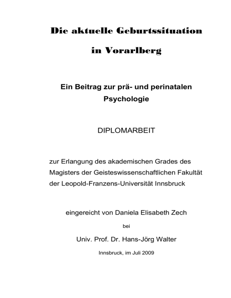 Die aktuelle Geburtssituation in Vorarlberg Ein Beitrag zur prä- und perinatalen Psychologie DIPLOMARBEIT zur Erlangung des akademischen Grades des Magisters der Geisteswissenschaftlichen Fakultät der Leopold-Franzens-Universität Innsbruck eingereicht von Daniela Elisabeth Zech bei Univ. Prof. Dr. Hans-Jörg Walter Innsbruck, im Juli 2009 Inhaltsverzeichnis Vorwort 4 1. Einleitung 6 2. Gebären in Vorarlberg 12 2.1. Krankenhäuser und Geburtshilfe 15 2.2. Schwangerschaft und Geburt in Vorarlberg 17 3. Geburtsphysiologie 30 3.1. Gesetzmäßigkeiten der Schließmuskeln 30 3.2. Störungen der Intimität 34 3.3. Einen Blick ins Tierreich 38 3.4. Ein Hormon namens Oxytozin 39 4. Die frühe Bindung zwischen Mutter und Kind 46 4.1. Die Bindungstheorie 46 4.2. Sichere Bindung - eine Form der Kriminalitätsprävention 55 4.3. Bindung im peri- und postnatalen Bereich 59 4.3.1. Untersuchungen bei Säugetieren 59 4.3.2. Die Hypothese von Klaus und Kennell 60 4.3.3. Eine besondere Phase nach der Geburt 63 4.3.4. Bonding 69 4.3.5. Rooming-in 74 4.3.6. Medikamente während der Geburt und Bonding 77 5. Das Wohlbefinden der Gebärenden 79 5.1. Die Würde einer gebärenden Frau 79 5.2. Die Kraft der Vision nützen 85 5.3. Die Beziehung zwischen Gebärender und Hebamme 89 5.4. Das Konzept der DOULA nach Klaus und Kennell 95 6. Das (Beleg)hebammensystem in Vorarlberg 6.1. Gesetzliche Anträge in Vorarlberg Daniela Zech -2- 99 100 Inhaltsverzeichnis 6.2. Konzeptionelle Grundgedanken des Hebammengremiums in Vlbg. 103 6.3. Hebammen in Vorarlberg früher und heute 106 6.4. Die Situation der Frauen aus der Perspektive der Hebammen 121 6.5. Interviews mit zwei Hebammen 126 6.5.1. Stress im Wochenbett 126 6.5.2. Die Nöte der Frauen 129 6.5.3. Sozialpolitische Komponente 136 6.5.4. Die heutige Geburtslandschaft in Vlbg. 142 6.5.5. Neue Kultivierung 145 6.5.6. Das Ergebnis der Aussagen 148 6.6. Ein Blick in die Niederlande 150 7. Elternaufklärung über Kaiserschnitt 153 7.1. Anstieg der Interventionsraten bei der Geburt 158 7.2. Schmerzvermeidung? 161 7.3. Periduralanästhesie (PDA) 162 7.4. Stillen nach einem Kaiserschnitt 165 7.5. Was bringt uns die Zukunft? 167 8. Prä- und perinatale Psychologie 169 8.1. Wo wir heute stehen 169 8.2. Stress in der Schwangerschaft für die Mutter 174 8.3. Stress für den Fetus 178 8.4. Stress während der Geburt für das Kind 182 8.5. Die Geburtsmatrizen nach Grof 184 8.6. Pränatale Bindung 186 Nachwort 191 Literaturverzeichnis 194 Lebenslauf 201 Daniela Zech -3- VORWORT Seit meiner Jugendzeit interessierte mich das Thema der Schwangerschaft und Geburt. Meine Ehrfurcht vor den Ungeborenen und Neugeborenen veranlasste mich immer wieder zu Gesprächen mit meinen Freunden über diese Thematik. Momente der Lebensübergänge haben etwas Einmaliges, Unwiederbringliches und geradezu Heiliges. Aus dieser Perspektive heraus braucht es ein dementsprechendes Umfeld und Verhalten in diesen Situationen. Der adäquate Umgang sichert eine konstruktive psychische Verarbeitung im Nachhinein. Ein weiterer für mich wesentlicher Aspekt ist die Weitergabe „des Wissens um das Geburtsgeschehen und ihrer Kraft und Dynamik“ in einer heilenden und konstruktiven Art und Weise an die nächste Generation. „Heilend“ deshalb, weil in diesem und im letzten Jahrhundert die Weitergabe dieses Wissens „von Frau zu Frau“ größtenteils unterblieben ist. Dahinter steckt eine Epoche voll Tabuisierung der Sexualität, der Pathologisierung und Vermännlichung der Geburtssituation sowie zwei Weltkriege. Mit großer Dankbarkeit möchte ich erwähnen, dass ich bei den beiden Geburten meiner Kinder Aaron und Sophia im Landeskrankenhaus Feldkirch nach dem besten Wissen des damaligen Zeitpunktes betreut wurde. Mit dieser Arbeit möchte ich zur Entwicklung und zur Bewusstwerdung der heutigen Geburtssituation in Vorarlberg anregen. Besonders bedanken möchte ich mich bei Univ. Prof. Dr. Hans-Jörg Walter, der mir die Freiheit gewährte mich im Laufe der Bearbeitung des Themas weiter zu entwickeln und mir die volle Unterstützung für diese Diplomarbeit zukommen ließ. Danken möchte ich aber auch Petra Fritsche und dem Hebammengremium der Landesgeschäftsstelle Vorarlberg, die mir wertvolle Anregungen seitens der Hebammen sowie ihr Konzept zur „Weiterentwicklung der Geburtshilfe in Vorarlberg“ zur Verfügung gestellt haben. In den Zitaten führe ich die Vereinigung gekürzt als „Vorarlberger Daniela Zech -4- Hebammengremium“ an. Mein Dank gilt weiters allen Interviewten, betroffenen Frauen und allen Personen, die mir in persönlicher Weise meine vielen Fragen zur Thematik beantwortet haben und deren Erlaubnis ich erhielt, diese in meiner Arbeit niederzuschreiben. Ich danke auch Michaela Kylönnen, die mir ihre „Spezialbibliothek“ uneingeschränkt über Monate zur Verfügung gestellt hat. Von ganzem Herzen bedanke ich mich bei meinem Lebensgefährten Wolfgang, der mich unterstützte und der mir immer das Gefühl gab auf dem richtigen Weg zu sein. Meinen Kindern Aaron und Sophia möchte ich danken, die mich viele Stunden entbehren mussten und ohne deren Kooperation diese Diplomarbeit mit dem Familienleben nicht zu vereinbaren gewesen wäre. Ein großes Dankeschön gebührt natürlich auch meinen Eltern und ihren Partnern für die unermüdlichen BabysitterDienste. Daniela Zech -5- 1. Einleitung Wie alles begann: Im Juli 2007 schrieb ich sozusagen als Auftakt zu meinem Weg zur Diplomarbeit den oben abgedruckten Leserbrief an die Vorarlberger Nachrichten. Inspiriert durch die bevorstehende Geburt meiner Tochter Sophia verfolgte ich in den Medien die Diskussion um die beabsichtigte Schließung der Geburtsstation in Hohenems. Im Jänner 2007 war es dann soweit. Trotz heftigen Protestes von Frauen, Hebammen und ÄrztInnen wurde die umsichtig aufgebaute Station ein Opfer der Rationalisierungspläne der Krankenhausbetriebsgesellschaft und des Landes. Die ca. 550 Geburten der Geburtsstation in Hohenems sollen