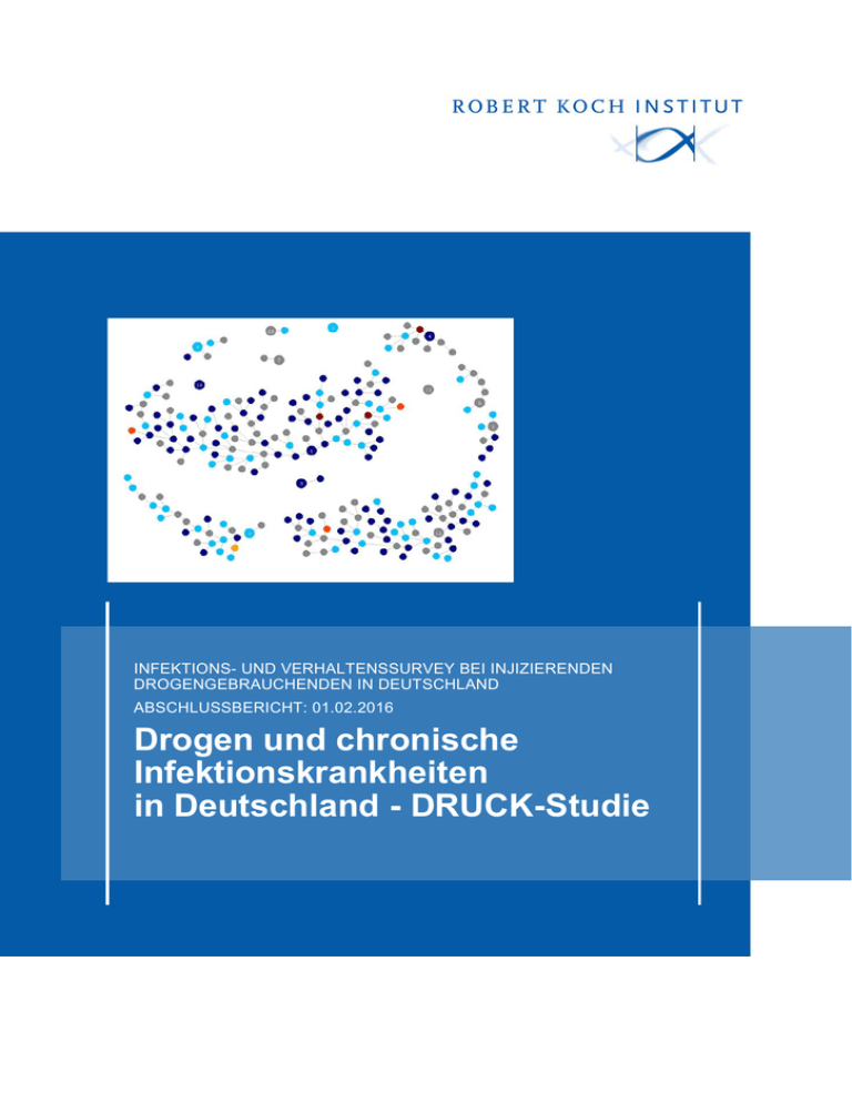 INFEKTIONS- UND VERHALTENSSURVEY BEI INJIZIERENDEN DROGENGEBRAUCHENDEN IN DEUTSCHLAND ABSCHLUSSBERICHT: 01.02.2016 Drogen und chronische Infektionskrankheiten in Deutschland - DRUCK-Studie Abschlussbericht der Studie „Drogen und chronische Infektionskrankheiten in Deutschland“ (DRUCKStudie). Infektions- und Verhaltenssurvey bei injizierenden Drogengebrauchenden in Deutschland. Robert Koch-Institut, 2016 Die DRUCK-Studie „Drogen und chronische Infektionskrankheiten in Deutschland“ wurde vom Bundesministerium für Gesundheit (BMG) vom 01.04.2012 bis 31.01.2016 gefördert. Die Pilotierung der Studie im Jahr 2011 wurde aus Forschungsmitteln des Robert Koch-Instituts gefördert. RKI-Projekt-Nummer: 1368-1104 Herausgeber Robert Koch-Institut (RKI) Nordufer 20 13353 Berlin Internet: www.rki.de/druck-studie E-Mail: [email protected] Autor/innen Dr. Viviane Bremer, Wei Cai, Martyna Gassowski, Dr. Joana Haußig, Dr. Ulrich Marcus, Stine Nielsen, und Dr. Ruth Zimmermann, Abteilung für Infektionsepidemiologie, Fachgebiet HIV / AIDS und andere sexuell oder durch Blut übertragbare Infektionen Verantwortlich Dr. Ruth Zimmermann ([email protected]) Titelbild Netzwerk der DRUCK-Studienteilnehmenden in München nach HIV-HCV-Infektionsstatus Druck RKI-Hausdruckerei Bezugsquelle Der Bericht ist online abrufbar: www.rki.de/druck-studie. Vorgeschlagene Zitierweise Robert Koch-Institut. Abschlussbericht der Studie „Drogen und chronischen Infektionskrankheiten in Deutschland“ (DRUCK-Studie), Berlin 2016. DOI: 10.17886/rkipubl-2016-007.2 Das Robert Koch-Institut ist ein Bundesinstitut im Geschäftsbereich des Bundesministeriums für Gesundheit 2 Danksagung Die DRUCK-Studie wurde gemeinsam von vielen Akteuren vorbereitet und durchgeführt, bei denen wir uns hiermit ganz herzlich bedanken möchten. Bereits beim Auftakttreffen der DRUCK-Studie waren Vertreterinnen und Vertreter von Einrichtungen der Drogenhilfe, lokalen AIDS-Hilfen, des öffentlichen Gesundheitsdienstes sowie der Ärzteschaft aus Berlin, Dortmund, Düsseldorf, Essen, Hamburg, Hannover, Frankfurt am Main, Köln, Leipzig, München, Nürnberg und Saarbrücken, sowie Drogen- und Suchtbeauftragte von Städten und verschiedenen Bundesländern eine große Unterstützung beim Mapping der Drogenszene und Einrichtungen der Drogenhilfe in den Städten. Dafür bedanken wir uns, auch für das Verständnis, dass die Studie nicht in allen Städten durchgeführt werden konnte. Die Durchführung dieser Studie war nur mit Hilfe lokaler Partnerorganisation möglich. Unser großer Dank gilt daher allen Einrichtungsleiterinnen und –leitern, in deren Räumlichkeiten die Studie durchgeführt wurde. Wir danken den Mitarbeiterinnen und Mitarbeitern, studentischen Hilfskräften, Studienärztinnen und -ärzten und allen, die in den jeweiligen Städten an der Durchführung der Studie beteiligt waren. Ohne den großen Einsatz der lokalen Studienteams hätte die Studie nicht erfolgreich durchgeführt werden können. Schließlich waren in allen acht Studienstädten neben den Studien-Einrichtungen weitere Einrichtungen an der Rekrutierung von Starterpersonen beteiligt,auch dafür herzlichen Dank! Des Weiteren hatten sich in allen Studienstädten niedergelassene oder in Ambulanzen tätige Ärztinnen und Ärzte bereit erklärt, Personen mit im Rahmen der Studie neu entdeckten Infektionen zur Nachtestung und weiteren infektiologischen Versorgung zu übernehmen,- auch dafür herzlichen Dank! Ein besonderer Dank geht an die Labore des RKI: Dr. Claudia Kücherer, PD Dr. Norbert Bannert, Dr. Oliver Hohn (FG18, HIV und andere Retroviren) und Prof. Claus-Thomas Bock (FG15, Virale Gastroenteritis- und Hepatitiserreger und Enteroviren) und ihren Teams danken wir für die Testung und Befundung der Blutproben und für ihre Kooperationsbereitschaft unter teils schwierigen Bedingungen bei nicht vorhersagbaren Probenzahlen und wechselnder Probenqualität. Einigen Kolleginnen und Kollegen im FG34 des RKI (HIV/AIDS und andere sexuell oder durch Blut übertragbare Infektionen) gebührt unser Dank für die konzeptionelle, logistische und wissenschaftliche Unterstützung der Studie, darunter Dr. Matthias an der Heiden, Wei Cai, Serdar Danis, Martyna Gassowski, Dr. Joana Haußig, Dr. Ulrich Marcus, Stine Nielsen, Claudia SantosHövener, Ramona Scheufele und Benjamin Wenz. Die Funktion der Studienkoordination hatten nacheinander Stine Nielsen, Benjamin Wenz und Martyna Gassowski inne. Serdar Danis als Studienassistent wurde von wechselnden studentischen Hilfskräften unterstützt: Rieke Barbek, Lineke Derks, Maria Friedrich, Nicole Hecht und Benjamin Jentzsch, dafür herzlichen Dank! Vielen Dank an das RKI für die Förderung der Pilotierung 2011 in Berlin und Essen, an die Leitung der Abteilung für Infektionsepidemiologie, Dr. Osamah Hamouda, für die Unterstützung der Studie und 3 die tatkräftige Hilfe bei der Pilotphase durch eine Vielzahl von engagierten Mitarbeiterinnen und Mitarbeitern und Studierenden: Wei Cai, Maria Friedrich, Dr. Ulrich Marcus, Sami Marzougui, Doreen Gavrielov, Eva Pederson, Ramona Scheufele, Claudia Santos-Hövener, Judith Stumm, Andrea Teti, Benjamin Wenz und Weidong Zhang. Im Rahmen der Pilotstudie führte das Nationale Referenzzentrum für Hepatitis C in Essen die Vorarbeiten, Testvalidierungen und die Testungen für die Studienstädte Berlin und Essen durch,dafür gilt unser herzlicher Dank insbesondere Prof. Stefan R Ross. Als Beratende bei der Konzeption und logistischen Planung und Durchführung der ersten Pilotierung sowie bei der Entwicklung und Pre-Testung des Fragebogens waren Kerstin Dettmer und Astrid Leicht von Fixpunkt Berlin e.V. sowie Dirk Schäffer, Deutsche AIDS-Hilfe, eine große Hilfe. Ohne ihre Unterstützung und Expertise hätte die DRUCK-Studie nicht so erfolgreich durchgeführt werden können. Unser Dank gilt in dem Rahmen auch dem Engagement und der Geduld aller an der Pilotierung in Berlin und Essen beteiligten Mitarbeiterinnen un