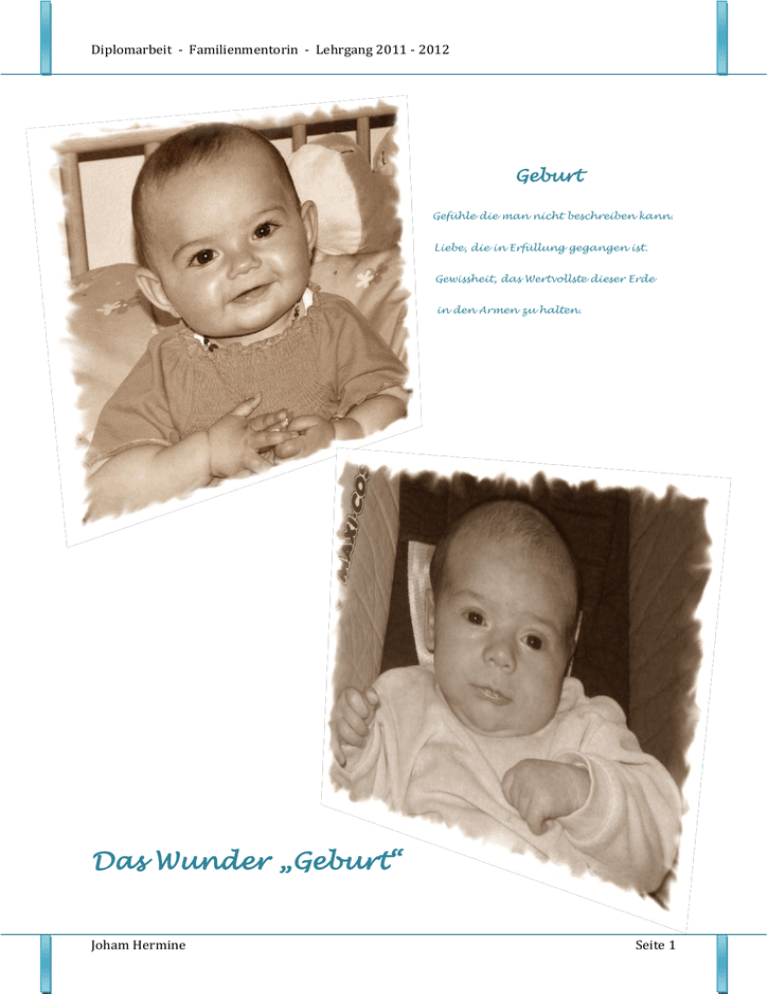 Diplomarbeit - Familienmentorin - Lehrgang 2011 - 2012 Geburt Gefühle die man nicht beschreiben kann. Liebe, die in Erfüllung gegangen ist. Gewissheit, das Wertvollste dieser Erde in den Armen zu halten. Das Wunder „Geburt“ Joham Hermine Seite 1 Diplomarbeit - Familienmentorin - Lehrgang 2011 - 2012 Inhaltsverzeichnis: Persönliches: Meine Beweggründe zur Ausbildung der Dipl. Familienmentorin Warum ich mich für das Thema Geburt entschieden habe Seite 3 4/5/6/7 Fachliches: Das Baby macht sich auf den Weg 8/ 9 Am Entbindungsort angekommen 10 Die Phasen der Geburt Die Geburt 11/ 12 13 Was leistet ein Kind beim Durchtritt durch den Geburtskanal 14/ 15 Geburtspositionen- Umgang mit dem Wehenschmerz 16/ 17 Wie kann der Partner die Frau unterstützen 17 Geburtsarten und Komplikationen 18 Psychische Auswirkungen geburtshilflicher Eingriffe 19/20/21 „Bonding“: Wo gehört ein Baby nach der Geburt hin 22 Wie möchte ich Eltern in Zukunft unterstützen und begleiten 23 Mein Ziel in der Elternarbeit 24/25 Geburtswunschplan 26 Literaturliste 27 Joham Hermine Seite 2 Diplomarbeit - Familienmentorin - Lehrgang 2011 - 2012 Persönliches: Meine Beweggründe zur Ausbildung der Dipl. Familienmentorin Seit 12 Jahren bin ich als Pädagogin im Kleinkindbereich tätig. Ich bin verheiratet und habe drei Kinder, Michael 27Jahre, Silvia 24 Jahre und Lisa 13 Jahre. Als ich mit Lisa in Karenz war, stellte sich irgendwann die Frage, was, wie und wo ich nach der Karenzzeit arbeiten werde. Durch ein Zeitungsinserat wurde ich auf die Ausbildung der Dipl. Tagesmutter und Dipl. Kleinkinderzieherin aufmerksam. Mit Freude habe ich mich entschieden Tagesmutter zu werden. Kinder ein Stück ihres Weges zum Erwachsen werden zu begleiten, sie zu fördern, sie zu stärken und ihnen einen Platz der Geborgenheit im kleinen familiären Kreis zu geben, liegt mir sehr am Herzen. Im Laufe der Jahre wurde mir immer mehr bewußt, wie oft die Eltern Unterstützung von mir benötigen. Für Fragen über Erziehung, Krankheit, Entwicklung, usw. bin ich stets die erste Ansprechpartnerin. Eltern brauchen in unserer rasanten Zeit immer mehr Hilfe und vor allem dann, wenn es irgendwelche Auffälligkeiten bei ihren Kindern gibt. Schon die Trotzphase kann zur Herausforderung werden und die Eltern kommen oft an ihre Grenzen. Obwohl ich ein fundiertes pädagogisches Fachwissen besitze, hatte ich immer das Gefühl, mir fehlt noch etwas. Als ich voriges Jahr den Folder der Dipl. Familienmentorin in der Hand hielt, wußte ich sofort, diese Ausbildung ist das fehlende Puzzleteil. Damit habe ich die Möglichkeit, mit neuen Werkzeugen, erlernten Methoden und erworbenen Kompetenzen die Eltern und deren Kinder noch professioneller zu unterstützen und zu begleiten. Ich bin mir sicher ich habe die richtige Entscheidung getroffen. Joham Hermine Seite 3 Diplomarbeit - Familienmentorin - Lehrgang 2011 - 2012 Warum ich mich für das Thema Geburt entschieden habe Bei meinen drei Kindern erlebte ich ganz unterschiedliche Geburten. Leider waren auch traumatische Erlebnisse dabei. Während meiner Ausbildung zur Dipl. Familienmentorin konnte ich diese Erlebnisse aufarbeiten, verstehen, akzeptieren und lösen. Bei der Geburt von Michael erlebte ich viele traumatische Erfahrungen während 11 Wehenstunden, Einlauf, Einleitung mit Wehentropf Dammschnitt und und Vaginaltabletten, einer Hebamme, die Blasensprengung, mich leider nicht einfühlsam begleitete. Ich hätte dies besonders bei der ersten Geburt gebraucht. Anstatt Mitgefühl wurde mir gesagt, ich soll mich nicht so anstellen. Ich freute mich so auf mein Baby, aber ich fühlte mich so hilflos. Ich verbrachte die Stunden angeschlossen am Wehenschreiber im Bett. Es war meine erste Geburt, ich war unerfahren, zu der Zeit gab es noch keine Schwangerschaftsvorbereitung mit Treffen usw. Als zufällig nach elf Stunden ein Arzt in den Kreissaal kam und mich mit Sauerstoffmaske bereits in den Presswehen, im Bett liegen sah, erkannte dieser sofort, dass er handeln musste. Er kniete auf meinem Bauch und drückte das Baby in den Geburtskanal. Hört sich schlimm an, war es aber nicht. So half er meinem Sohn binnen einiger Minuten das Licht der Welt zu erblicken. Die Lage war sehr ernst, Michael war dunkelblau, das Fruchtwasser erbsengrün und ich fast ohnmächtig. Ich war dem Arzt unendlich dankbar. Die Hebamme wurde noch im selben Jahr entlassen, es hat danach noch einige unverzeihliche Vorfälle gegeben. Es war nicht ihre Berufung Babys auf die Welt zu helfen. Joham Hermine Seite 4 Diplomarbeit - Familienmentorin - Lehrgang 2011 - 2012 Als ich dreieinhalb Jahre später meine Tochter Silvia zur Welt brachte, war ich um einiges an Erfahrung reicher. Als um 01.00 Uhr in der Nacht die Wehen einsetzten, war ich ganz entspannt. Ich hatte mir vorgenommen, zu Hause zu bleiben bis sie in kurzen regelmäßigen Abständen zu spüren sind. Durch den intuitiven Wechsel meiner Positionen umgehen. Erst um 05.30 konnte Uhr ich bin gut ich mit im den Wehen Krankenhaus angekommen. Eine nette mütterliche Hebamme nahm mich herzlich in Empfang. Die Herztöne und die Wehen mittels CTG wurden kontrolliert. Nach dem 06.00 Uhr dauerte, Aufnahmeprozedere, das ca. bis (denn damals wurden die ganzen Formalitäten erst am Entbindungstag aufgenommen), bekam ich doch wieder einen Einlauf. Um 06.30 verspürte ich den Drang auf die Toilette zu gehen, aber schon nach wenigen Minuten hatte ich das Gefühl mein Baby kommt. Ich rief die Hebamme und sagte ihr, dass ich ihre Hilfe benötige. Sie lächelte mich freundlich an und sagte.“ Aber Mama, das dauert schon noch ein bisserl“. Dann ging alles ganz schnell, die Presswehen setzten ein und um 07.04 war mein Baby geboren. Überglücklich konnte ich Silvia sofort nach der Geburt an meiner Brust in dieser Welt willkommen heißen. Ich werde diesen Augenblick nie vergessen. Damals wußte ich noch nicht, wie wichtig diese Zeit für die Bindung zwischen uns ist. Ja, so hatte ich mir die Geburt in Träum
