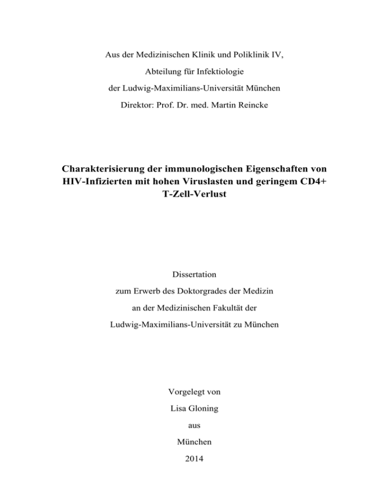 Aus der Medizinischen Klinik und Poliklinik IV, Abteilung für Infektiologie der Ludwig-Maximilians-Universität München Direktor: Prof. Dr. med. Martin Reincke Charakterisierung der immunologischen Eigenschaften von HIV-Infizierten mit hohen Viruslasten und geringem CD4+ T-Zell-Verlust Dissertation zum Erwerb des Doktorgrades der Medizin an der Medizinischen Fakultät der Ludwig-Maximilians-Universität zu München Vorgelegt von Lisa Gloning aus München 2014 Mit Genehmigung der Medizinischen Fakultät der Universität München Berichterstatter: Priv. Doz. Dr. Rika Draenert Mitberichterstatter: Prof. Dr. Josef Eberle Priv. Doz. Dr. Karl-Heinz Herbinger Priv. Doz. Dr. Reinhard Obst Mitbetreuung durch den promovierten Mitarbeiter: Dekan: --- Prof. Dr. med. Dr. h.c. M. Reiser, FACR, FRCR Tag der mündlichen Prüfung: 11.12.2014 Inhaltsverzeichnis 1 Einleitung .......................................................................................................................... 1 1.1 Das Humane Immunschwäche Virus (HIV) ..................................................................................... 1 1.1.1 Geschichte .................................................................................................................................................. 1 1.1.2 Taxonomie .................................................................................................................................................. 1 1.1.3 Genomstruktur ......................................................................................................................................... 2 1.2 Die akute HIV-­‐Infektion ........................................................................................................................... 3 1.2.1 Übertragungswege ................................................................................................................................. 3 1.2.2 Der natürliche Verlauf der HIV-­‐Infektion ..................................................................................... 3 1.3 HIV und das Immunsystem .................................................................................................................... 4 1.3.1 Die CD8+ T-­‐Zellen ................................................................................................................................... 4 1.3.2 Die Effektorfunktionen der CD8+ T-­‐Zellen .................................................................................. 5 1.3.3 Die CD4+ T-­‐Helferzellen ....................................................................................................................... 6 1.3.4 Die CD38-­‐Expression als Zeichen der Immunaktivierung .................................................... 7 1.3.5 Inhibitorische Signalwege der Immunerschöpfung ................................................................. 8 1.3.6 Das Oberflächenmolekül CD44 ......................................................................................................... 9 1.4 Natural hosts ................................................................................................................................................. 9 1.5 Zielsetzung der Arbeit ........................................................................................................................... 11 2 Material und Methodik .............................................................................................. 13 2.1 Material ........................................................................................................................................................ 13 2.1.1 Geräte und Verbrauchsmaterial .................................................................................................... 13 2.1.2 Chemikalien und Reagenzien .......................................................................................................... 13 2.1.3 Medien ...................................................................................................................................................... 14 2.1.4 Antikörper ............................................................................................................................................... 15 2.1.5 Peptide ...................................................................................................................................................... 15 2.1.6 Software ................................................................................................................................................... 17 2.2 Methodik ...................................................................................................................................................... 17 2.2.1 Patienten .................................................................................................................................................. 17 2.2.2 Versuchsablauf ...................................................................................................................................... 19 2.2.3 Probenentnahme .................................................................................................................................. 20 2.2.4 PBMC-­‐Isolierung aus Vollblut ......................................................................................................... 20 2.2.5 Bestimmung der Zelldichte .............................................................................................................. 22 2.2.6 Kryokonservierung der Zellen ....................................................................................................... 22 2.2.7 Auftauen der Zellen ............................................................................................................................. 22 2.2.8 Peptide ............................................................................................................................