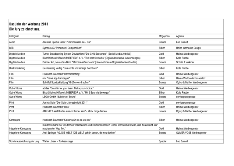 Das Jahr der Werbung 2013 Die Jury zeichnet aus: Kategorie Beitrag Megaphon Agentur Audio Akustika Spezial GmbH "Ohrensausen.de - Tini" Bronze Leo Burnett B2B Symrise AG "Perfumers' Compendium" Silber Heine Warnecke Design Digitale Medien Turner Broadcasting System Deutschland "Die CNN Ecosphere" (Social-Media-Aktivität) Gold Heimat Werbeagentur Digitale Medien Bischöfliches Hilfswerk MISEREOR e. V. "The best fireworks" (Digitale/Interaktive Anwendungen) Silber Kolle Rebbe Digitale Medien Daimler AG, Mercedes-Benz "Mercedes-Benz.com" (Unternehmens-/Organisationswebseiten) Bronze Scholz & Volkmer Direktmarketing Gerstenberg Verlag "Das echte und einzige Kochbuch" Silber Kolle Rebbe Film Hornbach Baumarkt "Hammerschlag" Gold Heimat Werbeagentur Film n-tv "news app Kampagne" Silber Havas Worldwide Düsseldorf Film Schöffel Sportbekleidung "Grüße von draußen" Bronze Ogilvy & Mather Werbeagentur Out of Home adidas "Go all in for your team. Make your choice." Gold Heimat Werbeagentur Out of Home Bischöfliches Hilfswerk MISEREOR e. V. "Mit 2 Euro viel bewegen" Silber Kolle Rebbe Out of Home LEGO GmbH "Builders of Sound" Bronze serviceplan gruppe Print Austria Solar "Der Solar-Jahresbericht 2011" Gold serviceplan gruppe Print Hornbach Baumarkt "Riss" Silber Heimat Werbeagentur Print JAKO-O "Lasst Kinder einfach Kinder sein" - Motiv Fingerfarben Bronze Ogilvy & Mather Werbeagentur Kampagne Hornbach Baumarkt "Keiner spürt es so wie du." Silber Heimat Werbeagentur Integrierte Kampagne Bundesverband der Deutschen Volksbanken und Raiffeisenbanken "Jeder Mensch hat etwas, das ihn antreibt. Wir machen den Weg frei." Gold Heimat Werbeagentur Integrierte Kampagne Axel Springer AG, DIE WELT "DIE WELT gehört denen, die neu denken" Bronze OLIVER VOSS Werbeagentur Sonderauszeichnung der Jury Walter Lürzer – Todesanzeige Special Leo Burnett Das Jahr der Werbung 2013 (ehemals Jahrbuch der Werbung): Der Branchenvergleich (Shortlist) Branche: Alkoholische Getränke Kampagnen-/Produktname Beitragstyp Anheuser-Busch InBev Deutschland Gmbh & Co. KG "Becks Co-Creation: Your Mix. Your Way." Agentur Digitale Medien (Social-Media-Aktivitäten) coma Anheuser-Busch InBev Deutschland Gmbh & Co. KG, Franziskaner Weissbier, Relaunch Website Beck's & REWE: Du bestimmst den Gewinn! Brauerei Kneitinger, Imagekampagne Cölner Hofbräu P. Josef Früh KG "Alles andere ist Fasching." Digitale Medien (Produkt-/Servicewebseiten) Promotion (Promotion / Mittel) Out of Home (Out of Home / Medien) Out of Home (Out of Home / Medien) coma BestSeller Agentur für Absatzförderung schwecke.mueller Werbeagentur Counterpart Fürstlich Fürstenbergische Brauerei GmbH & Co. KG "Fürstenberg Wir im Süden" Krombacher Brauerei Bernhard Schadeberg "Krombacher Weizen" Privatbrauerei GANTER "Freiburger Pilsner" SABMiller Brand Europe "Tyskie Lehnwörter-Kampagne" Tucher Bräu "LEDERER" Tucher Bräu, Nürnberger Pils Weingut Blankenhorn, Amando Out of Home (Out of Home / Medien) Film Print Out of Home (Out of Home / Medien) Print Print Print agenturwitt Wensauer & Partner DIE CREW Intevi Werbeagentur Bloom Project Bloom Project DRWA Das Rudel Werbeagentur Weingut Bruno Kirschbaum, Website www.weingut-kirschbaum.at Digitale Medien (Unternehmens/Organisationswebseiten) Ender Werbung Branche: Automobil (Pkw) Kampagnen-/Produktname BMW AG Vertrieb Deutschland, BMW 1er "Fahrerlebnisschalter" BMW AG Vertrieb Deutschland, BMW 7er "Souveränität" BMW AG, BMW "EfficientDynamics Skulptur" BMW AG, BMW "xDrive Village" BMW AG, Mini "Not normal. Das MINI Heckscheiben TV" BMW AG, Zagato Coupé Imagefilm Daimler AG, Mercedes-Benz Vertrieb Deutschland, SL Roadster "Zeitreise" Daimler AG, Mercedes-Benz, Viano "Behind Fascination" Fiat Group Automobiles Germany, Fiat 500 "fiat500.de" Volkswagen AG "Don't drink and drive" Beitragstyp Film Film Out of Home (Out of Home / Medien) Film Out of Home (Out of Home / Medien) Film Digitale Medien (Mobile Marketing) Digitale Medien (Produkt-/Servicewebseiten) Digitale Medien (Produkt-/Servicewebseiten) Audio Agentur serviceplan gruppe serviceplan gruppe serviceplan gruppe serviceplan gruppe mediaplus gruppe / serviceplan gruppe Good Guys Entertainment Pixelpark/Elephant Seven SYZYGY Deutschland Leo Burnett Heye & Partner Bei Fragen wenden Sie sich bitte an die Jahrbuch-Redaktion, Tel: +49 30 23456-439, E-Mail: [email protected]. Prämierung Bester der Branche Alkoholische Getränke (B2C) Prämierung Bester der Branche Automobil (Pkw) (B2C) 1 von 21 Das Jahr der Werbung 2013 (ehemals Jahrbuch der Werbung): Der Branchenvergleich (Shortlist) Branche: Automobil-/Kfz-Zubehör Kampagnen-/Produktname A.T.U. Handels GmbH & Co. KG "Mountain" ABT Sportsline "Playboy Motiv" Beitragstyp Film Print Agentur Heimat Werbeagentur Schindler Parent ABT Sportsline, Relaunch Webseite BMW AG MINI Infotainment BMW AG MINI Ray Zubehör Paket BMW AG, BMW "Treue Service" BMW Freizeit & Reise Continental Reifen Deutschland "Die Fahrt Ihres Lebens." Digitale Medien (Unternehmens/Organisationswebseiten) Print Print Out of Home (Out of Home / Medien) Kampagne Digitale Medien (Online-Werbemittel) Schindler Parent wvp Werbegesellschaft wvp Werbegesellschaft wvp Werbegesellschaft wvp Werbegesellschaft serviceplan gruppe / plan.net gruppe Branche: Banken, Sparkassen, Investment (B2B) Kampagnen-/Produktname Landessparkasse zu Oldenburg "Firmenkunden" Landessparkasse zu Oldenburg "Freiberufler" Raiffeisenlandesbank Vorarlberg, Geschäftsbericht Beitragstyp Print Print Print Agentur von Mende Marketing von Mende Marketing die3 Agentur für Werbung und Kommunikation TARGOBANK AG & Co. KGaA Vertriebspackage TARGOBANK & BASE Mobile Payment Print wrw united werbeagentur Branche: Banken, Sparkassen, Investment Kampagnen-/Produktname Landessparkasse zu Oldenburg "Privatkunden" Sparda-Bank Hannover eG SpardaGirOkonto Beitragstyp Print Kampagne Agentur von Mende Marketing freitag van geigk BNP Paribas Aktiengesellschaft Trader's Box Südtiroler Volksbank GenaA