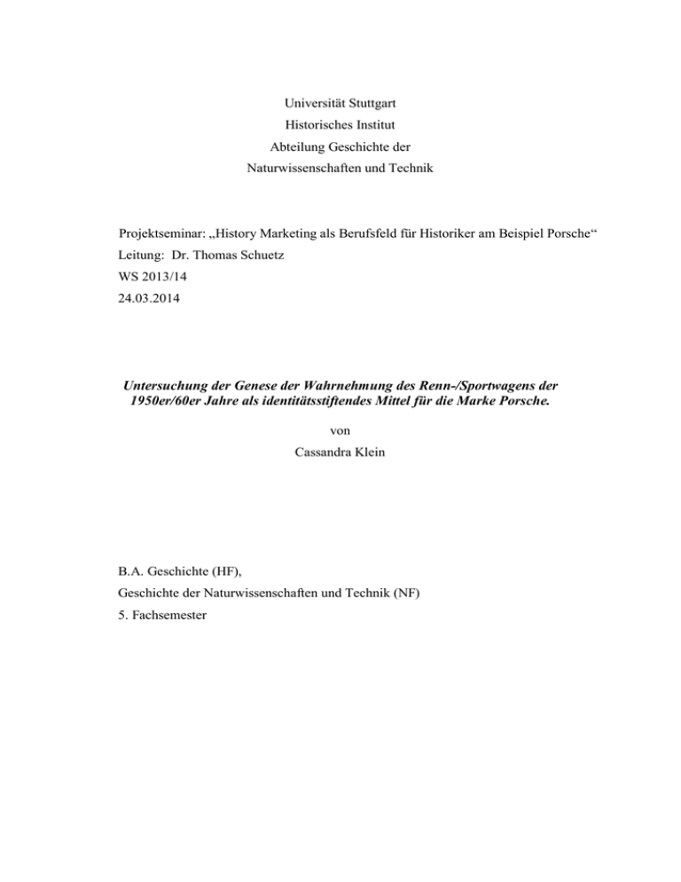 Universität Stuttgart Historisches Institut Abteilung Geschichte der Naturwissenschaften und Technik Projektseminar: „History Marketing als Berufsfeld für Historiker am Beispiel Porsche“ Leitung: Dr. Thomas Schuetz WS 2013/14 24.03.2014 Untersuchung der Genese der Wahrnehmung des Renn-/Sportwagens der 1950er/60er Jahre als identitätsstiftendes Mittel für die Marke Porsche. von Cassandra Klein B.A. Geschichte (HF), Geschichte der Naturwissenschaften und Technik (NF) 5. Fachsemester Inhaltsverzeichnis Thema: Untersuchung der Genese der Wahrnehmung des Renn-/Sportwagens der 1950er/60er Jahre als identitätsstiftendes Mittel für die Marke Porsche. 1. Einleitung ……………………………………………………………………….. 3 2. Methodik und Theorie …………………………………………………………… 4 3. Massenmotorisierung und Individualverkehr der Kriegs-/Nachkriegszeit ……… 6 4. Die Genese der Marke Porsche ……………………………………………….... 7 4.1 Der Produktcharakter des Porsche-Renn-/Sportwagens ………………………… 7 4.2 Die soziale Gruppe der 50er/60er Jahre um Porsche ……………………………. 8 4.3 Porsche-Automobil als Prestigeobjekt ………………………………………….. 9 5. Porsche-Werbung ……………………………………………………………….. 9 6. Fazit …………………………………………………………………………….. 11 7. Quellen- und Literaturverzeichnis ……………………………………………… 12 8. Anhang …………………………………………………………………………. 14 3 1. Einleitung Die Attribute Sportlichkeit, Qualität, Tradition, Exklusivität und Vielseitigkeit werden mit dem Markenname Porsche verbunden. Vor allem der Aspekt der Sportlichkeit wurde zum Leitbild der Automobile. Dieser ist bis zu den Anfängen der Porsche-Autos in die 50er und 60er Jahre zurückzuführen. Die erfolgreiche Teilnahme am Rennsport wurde zum Image der Marke Porsche und der Konzeption der Autos. Die Genese der Wahrnehmung des Renn-/Sportwagens der 1950er/60er Jahre soll im Folgenden als identitätsstiftendes Mittel der Marke Porsche untersucht werden. Die von Wiebe E. Bijker Of Bicycles, Bakelites and Bulbs. Toward a Theory of Sociotechnical Change angewandte Methodik wird einfließen. Er führte die technologische Entwicklung vom high-wheeled zum low-wheeled air tire bicycle auf die gefährlichen Fahrradrennen der young, risky, athletic men of upper-class zurück. Das Fahrrad sollte Frauen und elderly men, durch komfortsteigernde anti-vibration air tire und die low-wheeled Konstruktion, zugänglich gemacht werden, was auf Widerstand der Rennfahrer stieß. Erst nachdem ein air tire bicycle ein Rennen gewann, konnte dieses sich etablieren. Die Wechselwirkung zwischen Gesellschaft und Technologie ist dabei ein wesentlicher Aspekt.1 Es stellt sich die Frage nach dem Produktcharakter des Renn-/Sportwagens. Um diese zu beantworten, muss sowohl die Faszination des automobilen Rennsports betrachtet werden, als auch die Rennergebnisse, welche direkt in die technologische Weiterentwicklung flossen. Nicht außer Acht zu lassen sind die Rennerfolge der Automobile, welche zum Aushängeschild der Marke wurden.2 Unter anderem soll das Automobil als Prestige- und Luxusobjekt, als Sinnbild für den Fahrer der Upper Class näher betrachtet werden. Da v.a. die Wohlhabenden der USA und Frankreich nach Porsche-Rennwagen nachfragten, wurden diese so für die westlich orientierte deutsche Gesellschaft populär. Diese Punkte werden unter der Leitfrage welche sozialen Gruppen der 50er/60er Jahre von Porsche wie angesprochen werden erläutert.3 Dem geht eine bereits im Dritten Reich vollzogene Bewusstseinsveränderung der 1 Bijker, Wiebe E.: Of Bicykles, Bakelites and Bulbs. Toward a Theory of Sociotechnical Change. Massachusetts 1995; http://www.campus.de/kulturgeschichte_der_technik-4250.html, 18:27 10.03.2014. Zusatzkapitel vom 10.09.2012 online: Ansätze und Methoden der Technikgeschichts-schreibung. In: Heßler, Martina: Kulturgeschichte der Technik. Frankfurt/Main 2012. 2 Schneider, Peter: Typenkompass Porsche. Renn- und Rennsportwagen seit 1948. Stuttgart 2003; Von Frankenberg, Richard: Die ungewöhnliche Geschichte des Hauses Porsche. Stuttgart 41969; Long, Brian: Porsche Rennfahrzeuge 1953 bis 1975. Königswinter 2011. 3 Canzler, Weert: Das Zauberlehrlings-Syndrom. Entstehung und Stabilität des Automobil-Leitbildes. Berlin 1996; Gartman, David: Auto Opium. A Social History of American Automobile Design. London, 4 Gesellschaft hin zum Individualverkehr, dem Auto als Massenprodukt und Prestigeobjekt, sowie die USA und Frankreich als Trendsetter der Automobilität, voraus.4 Die Porsche-Rennplakate5 werden in die Arbeit einfließen, da sie das sportliche Image verstärkten und den Zeitgeist der westlichen Gesellschaft widerspiegeln. Die PorscheWerbung gehört zwar als wesentlicher Teil zur Markengenese, wird hier jedoch als Produktkommunikation durch Porsche gesondert behandelt.6 Die vorliegende Arbeit soll ein Beitrag zur Markengeschichte und –genese, Gesellschaftsgeschichte und Wirkungsgeschichte der Technik sein. 2. Methodik und Theorie Die Methodik dieser Arbeit beruht auf dem Konzept Social Construction of Technology7, welches Wiebe E. Bijker und Trevor Pinch im Aufsatz The Social Construction of Facts and Artifact 1987 publizierten. Ihre Leitfrage war, „wie sich Technik stabilisiert und in einer bestimmten Form Verbreitung findet“ 8 . Dazu wurden relevant social groups9 untersucht, denn diese „help us to describe the development of technical artifacts“10. Bijker sieht „Technological development […] as social process“ 11. Die Technik New York 1994; Weyer, Johannes; Kirchner, Ulrich; Riedl, Lars; Schmidt, Johannes F. K. (Hrsg.): Technik, die Gesellschaft schafft. Soziale Netzwerke als Ort der Technikge