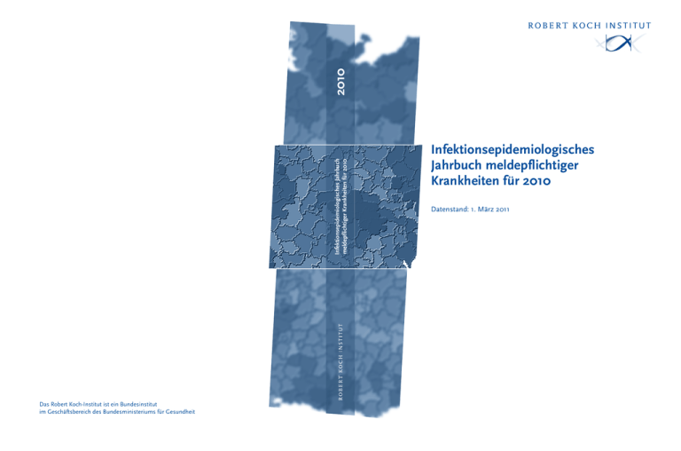 2010 Infektionsepidemiologisches Jahrbuch meldepflichtiger Krankheiten für 2010 Das Robert Koch-Institut ist ein Bundesinstitut im Geschäftsbereich des Bundesministeriums für Gesundheit Infektionsepidemiologisches Jahrbuch meldepflichtiger Krankheiten für 2010 Datenstand: 1. März 2011 Infektionsepidemiologisches Jahrbuch meldepflichtiger Krankheiten für 2010 Datenstand: 1. März 2011 Infektionsepidemiologisches Jahrbuch meldepflichtiger Krankheiten für 2010 Robert Koch-Institut, Berlin, 2011 ISBN 978-3-89606-118-6 Herausgeber Robert Koch-Institut Nordufer 20 13353 Berlin Verantwortlicher Redakteur Dr. Justus Benzler Abteilung für Infektionsepidemiologie Robert Koch-Institut Bestellung (nur bei Einsendung eines rückadressierten und mit 2,20 € frankierten Umschlags für das Format DIN A4) Robert Koch-Institut Abteilung für Infektionsepidemiologie Kennwort »Jahrbuch« Postfach 65 02 61 13302 Berlin Satz Fotosatz Voigt, Berlin Druck AZ Druck und Datentechnik GmbH, Berlin Nachdruck Nachdrucke aus dem Infektionsepidemiologischen Jahrbuch sowie die Verwendung von Daten aus dem SurvStat@RKI-Programm in Veröffentlichungen sind unter Quellenangabe gestattet, jedoch nicht zu werblichen Zwecken. Vorgeschlagene Zitierweise: »Robert Koch-Institut: Infektionsepidemiologisches Jahrbuch für 2010, Berlin, 2011«. Ein Belegexemplar wird erbeten. Vorwort Vorwort Mit Ablauf des Jahres 2010 wurde das Anfang 2001 eingeführte Infektionsschutzgesetz (IfSG) 10 Jahre alt. Zugleich feiert auch das Infektionsepidemiologische Jahrbuch, dessen 10. Ausgabe Ihnen hier vorliegt, ein kleines Jubiläum. Wir haben beides zum Anlass genommen, sowohl die krankheitsspezifischen als auch einige der allgemeinen Kapitel – neben der gewohnten Beschreibung der Daten und Ereignisse des aktuellen Jahres – um eine Rückschau zu ergänzen. Diese Rückschau über die vergangenen 10 Jahre macht Entwicklungen deutlich, die dem Betrachter lediglich des aktuellen Jahres leicht entgehen. In der Epidemiologie einiger meldepflichtiger Infektionskrankheiten ist es in diesem Zeitraum, der an sich gar nicht so lang erscheint, doch zu erheblichen Veränderungen gekommen. An der allgemeinen Struktur und dem äußeren Erscheinungsbild des Infektionsepidemiologischen Jahrbuchs hat sich hingegen seit der ersten Ausgabe 2001 nur wenig geändert. Bewährt hat sich die systematische Darstellung der einzelnen meldepflichtigen Krankheiten in gleichartig gegliederten Profilen mit inhaltlich und optisch standardisierten Abbildungen und Tabellen. Dies entspricht der epidemiologischen Triade Zeit – Ort – Person und wird ergänzt durch krankheitsübergreifende vergleichende Analysen und eine detaillierte Beschreibung der Datengrundlage. Hinzugekommen sind in den letzten Jahren Darstellungen von invasiven Infektionen durch Methicillin-resistenten Staphylococcus aureus und schweren Verlaufsformen von Clostridium-difficileInfektionen. Diese illustrieren die zunehmende Bedeutung nosokomialer Infektionen. Aufge- nommen wurden auch systematische Analysen des Impfstatus Erkrankter bei impfpräventablen Krankheiten, die Anhaltspunkte für die Häufigkeit von Impfdurchbrüchen geben. Deutlich im Umfang gewachsen sind die Beschreibungen von Ausbruchsdaten. Bei alldem hat auch der Gesamtumfang des Infektionsepidemiologischen Jahrbuchs zugenommen, von 133 Seiten der ersten Ausgabe auf 222 Seiten der aktuellen Ausgabe. Der Arbeits- und Materialaufwand wird – wie das Echo aus den Fachkreisen zeigt – auch im 10. Jahr noch gewürdigt. Das Infektionsepidemiologische Jahrbuch ist eine geschätzte Referenz, die viele Mitarbeiter des Öffentlichen Gesundheitsdienstes (aber nicht nur diese) gerne in Griffweite an ihrem Arbeitsplatz haben. Eine Umfrage, die anlässlich der letztjährigen Ausgabe initiiert worden war, bestätigte diese Einschätzung. Das Meldesystem gemäß IfSG als auch das daraus hervorgegangene Infektionsepidemiologische Jahrbuch müssen 10 Jahre nach Einführung als nachhaltiger Erfolg gewertet werden. Dies ist in erster Linie den meldenden Ärztinnen und Ärzten im ambulanten und stationären Bereich und in der Labordiagnostik sowie den anderen Meldepflichtigen und den Mitarbeiterinnen und Mitarbeitern der Gesundheitsämter und anderen Institutionen des ÖGD zu danken. Sie leisteten – und leisten – mit dieser Arbeit einen entscheidenden Beitrag zur Erkennung, Bekämpfung und Prävention von Infektionskrankheiten in Deutschland. Prof. Dr. Reinhard Burger Präsident des Robert Koch-Instituts, Berlin 3 Inhalt Inhalt Vorwort ....................................................................................................... 3 Inhalt ......................................................................................................... 5 Beteiligte Mitarbeiter .................................................................................. 7 Abkürzungen ............................................................................................... 8 1 Zusammenfassung/Executive Summary ...................................... 9 2 2.1 2.2 2.3 2.4 2.5 2.6 Grundlage der Daten ...................................................................... Gesetzliche Grundlage ................................................................... Meldeweg und Meldefristen .......................................................... Falldefinitionen .............................................................................. Referenzdefinition .......................................................................... Zuordnung nach Zeit, Ort, Alter und Geschlecht ......................... Qualitätsmanagement ................................................................... 13 13 17 19 20 22 24 3 3.1 3.2 3.3 Qualität der Daten ......................................................................... Vollzähligkeit der Erfassung .......................................................... Vollständigkeit der Datensätze ........................