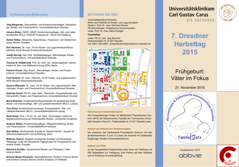 Referentinnen/Referenten Jörg Bergander, Gesundheits- und Kinderkrankenpfleger, Neonatologie, Kinder- und Frauenzentrum, Universitätsklinikum Dresden Johann Binter, DKKP, DGKP, Kinderintensivpfleger, Still- und Laktationsberater IBCLC, NIDCAP Professional , SALK-LKH Salzburg Esther Göbel, Hebamme, Geburtshaus, Frauenarzt- und Hebammenpraxis Bühlau, Dresden SO FINDEN SIE UNS Universitätsklinikum Dresden Klinik und Poliklinik für Kinder- und Jugendmedizin Direktor: Prof. Dr. med. Reinhard Berner FB Neonatologie / Pädiatrische Intensivmedizin Leiter: Prof. Dr. med. Mario Rüdiger FamilieNetz Leiter: PD Dr. phil. Jörg Reichert Fetscherstraße 74, 01307 Dresden Tel: 0351/ 458-2857, Joerg.Reichert(at)uniklinikum-dresden.de Dirk Heinicke, Dr. med., FA für Kinder- und Jugendmedizin/Neuropädiatrie, Klinik Bavaria Kreischa/Zscheckwitz Judith Hennig, Dipl.-Päd. (Sozialpädagogin), Neonatologie, Kinderund Frauenzentrum, Universitätsklinikum Dresden 7. Dresdner Herbsttag 2015 Thomas B. Hildebrandt, Prof. Dr. med. vet., Abteilungsleiter, LeibnizInstitut für Zoo- und Wildtierforschung (IZW), Berlin Fred Hunkert, Dr. med., Oberarzt, FA für Kinder- und Jugendmedizin, Klinik Bavaria Kreischa/Zscheckwitz Frühgeburt: Väter im Fokus Sascha Ifflaender, Dr. med., FA für Kinder- und Jugendmedizin, Neonatologie, Kinder- und Frauenzentrum, Universitätsklinikum Dresden 21. November 2015 Patricia Hinner, Dipl.-Psych., Neonatologie, Kinder- und Frauenzentrum, Universitätsklinikum Dresden Gabriele Kamin, PD Dr. med. habil., Oberärztin, Frauenheilkunde und Geburtshilfe, Kinder- und Frauenzentrum, Universitätsklinikum Dresden Mona Kelemen, Fachkinderkrankenschwester für pädiatrische Anästhesie- und Intensivpflege, Still- und Laktationsberaterin IBCLC, Leipzig Tina Kilian, Kinderkrankenschwester, Praxisanleiterin, Still- und Laktationsberaterin IBCLC, Universitätskinderklinik Leipzig Heidi Keller, Prof. i. R. Dr. rer. nat. habil., Psychologin, Institut für Migrationsforschung und Interkulturelle Studien, Universität Osnabrück Hinweise zum Veranstaltungsort Alle Veranstaltungen finden im Medizinisch-Theoretischen Zentrum (MTZ) der Medizinischen Fakultät der Technischen Universität Dresden (Haus 91, Fiedlerstraße 42, 01307 Dresden) statt. Andreas Müller, Kinderkrankenpfleger, Pflegedienstleitung, Kinderund Frauenzentrum, Universitätsklinikum Dresden Anfahrt mit öffentlichen Verkehrsmitteln: Axel Näther, Rechtsanwalt, Kanzlei Dr. Roland Uphoff – Kanzlei für Geburtsschadensrecht und Arzthaftung, Bonn Matthias Nutsch, Staatlich anerkannter Erzieher und Montessori Pädagoge, Leiter der Montessori-Tagesgruppe für Frühgeborene und andere Kinder, Dresden Eberhard Schäfer, Systemischer Berater und Therapeut, Väterzentrum Berlin Simone Weber-Karpinski, Geschäftsführerin, Klinikum Campus GmbH und Klinikum Campus Service GmbH, Schipkau OT Klettwitz Sie erreichen das Medizinisch-Theoretische Zentrum mit den Straßenbahnlinien 6 und 12 sowie der Buslinie 64 (Haltestelle Augsburger Straße/ Universitätsklinikum). Anfahrt mit PKW: An der Haupteinfahrt Fiedlerstraße steht Ihnen ein Parkhaus mit 500 Stellplätzen zur Verfügung. Das Parken auf dem Gelände und im Parkhaus ist kostenpflichtig. Hauptsponsor 2015 Programm Eröffnung (09.00-09.15) Gabriele Kamin: Frühgeburt: Väter im Fokus Vorträge (09.15-10.45) Thomas Hildebrandt: Bonding im Tierreich – Spielen die Väter eine Rolle? Johann Binter: Frühgeburt – Das Erleben der Väter Pause (10.45-11.15) Vorträge (11.15-12.45) Einladung Hinweise Das FamilieNetz des Perinatalzentrums Dresden lädt Sie sehr herzlich zum 7. Dresdner Herbsttag 2015 ein. Wir danken für die Unterstützung der Tagung: „Frühgeburt: Väter im Fokus“ – so lautet das Thema der diesjährigen Tagung, das die Auswahl der Programmbeiträge bestimmte. Ganz bewusst haben wir dabei darauf verzichtet, bei der Formulierung der Titel der einzelnen Beiträge – etwa aus stilistischen Gründen – auf die nicht allzu häufige Wiederholung von „Vater“ oder „Väter“ zu achten. Ganz im Gegenteil, wir wollen ihnen und ihren Kindern den gebührenden Raum und die angemessene Zeit gewähren. Axel Näther: Rechte und Pflichten der Väter – Was sollte man wissen? Simone Weber-Karpinski: FamilienCampus Lausitz – Eine Region geht familiär voran Mittagspause (12.45-13.30) Gemäß FSA-Kodex § 20 Abs. 5 sind die im FSA vereinten Firmen verpflichtet, Umfang und Bedingung (Werbezwecke, Standmiete) der Unterstützung von Veranstaltungen offenzulegen: abbvie - 2.400 €. Hauptvortrag (13.30-14.45) Anmeldung Heidi Keller: Die Rolle des Vaters für die frühkindliche Entwicklung im Kulturvergleich Die Anmeldung zur Tagung ist ausschließlich elektronisch möglich. Sie finden ab dem 01.07.2015 unter Pause (14.45-15.15) www.uniklinikum-dresden.de/kik/DHT Parallelworkshops (15.15-16.45) ein Anmeldeformular. Bei der Vergabe von Workshopplätzen (jeweils 25-30 Plätze) können nur Anmeldungen – in eingehender Reihenfolge – berücksichtigt werden, die uns bis 31.10.2015 vorliegen. (Die 90-minütigen Workshops finden zeitgleich statt, um rechtzeitige Anmeldung wird gebeten!) Patricia Hinner & Sascha Ifflaender: Vorsorgeuntersuchungen für Frühgeborene Mona Kelemen & Tina Kilian: Das Känguru auf Station Matthias Nutsch: Die Dresdner Montessori-Tagesgruppe für Frühgeborene und andere Kinder Andreas Müller: Familienorientierte Pflege unter der Bedingung des aktuellen G-BA-Beschlusses Judith Hennig & Jörg Bergander: Neue Medien in der psychosozialen Versorgung von Familien Frühgeborener Dirk Heinicke & Fred Hunkert: Anfassen erlaubt – Umgang mit neurologisch betroffenen Säuglingen Esther Göbel: Moderne Geburt – Moderne Väter Eberhard Schäfer: Was werdende und frischgebackene Väter rund um die Geburt brauchen und die Schlüsselrolle der Mutter dabei Plenum (16.45-17.30) Vorstellung der Arbeitsergebnisse der Workshops Verabschiedung (17.30) Väter frühgeborener oder 