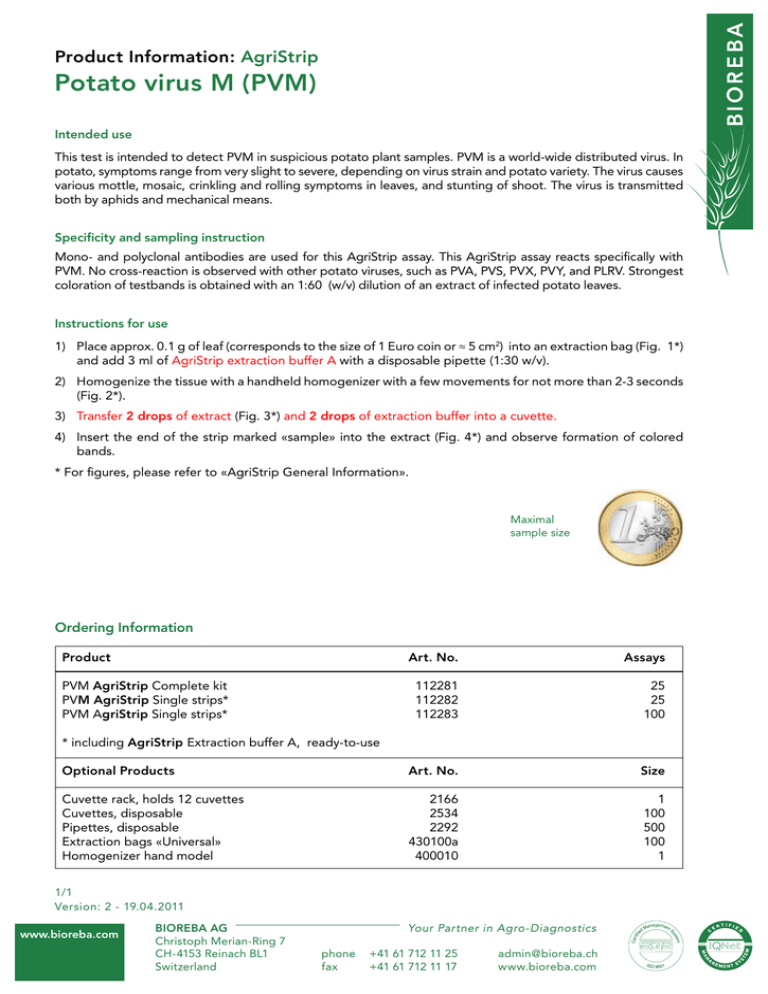 Product Information: AgriStrip Potato virus M (PVM) Intended use This test is intended to detect PVM in suspicious potato plant samples. PVM is a world-wide distributed virus. In potato, symptoms range from very slight to severe, depending on virus strain and potato variety. The virus causes various mottle, mosaic, crinkling and rolling symptoms in leaves, and stunting of shoot. The virus is transmitted both by aphids and mechanical means. Specificity and sampling instruction Mono- and polyclonal antibodies are used for this AgriStrip assay. This AgriStrip assay reacts specifically with PVM. No cross-reaction is observed with other potato viruses, such as PVA, PVS, PVX, PVY, and PLRV. Strongest coloration of testbands is obtained with an 1:60 (w/v) dilution of an extract of infected potato leaves. Instructions for use 1) Place approx. 0.1 g of leaf (corresponds to the size of 1 Euro coin or ≈ 5 cm2) into an extraction bag (Fig. 1*) and add 3 ml of AgriStrip extraction buffer A with a disposable pipette (1:30 w/v). 2) Homogenize the tissue with a handheld homogenizer with a few movements for not more than 2-3 seconds (Fig. 2*). 3) Transfer 2 drops of extract (Fig. 3*) and 2 drops of extraction buffer into a cuvette. 4) Insert the end of the strip marked «sample» into the extract (Fig. 4*) and observe formation of colored bands. * For figures, please refer to «AgriStrip General Information». Maximal sample size Ordering Information Product Art. No. Assays 112281 112282 112283 25 25 100 Optional Products Art. No. Size Cuvette rack, holds 12 cuvettes Cuvettes, disposable Pipettes, disposable Extraction bags «Universal» Homogenizer hand model 2166 2534 2292 430100a 400010 1 100 500 100 1 PVM AgriStrip Complete kit PVM AgriStrip Single strips* PVM AgriStrip Single strips* * including AgriStrip Extraction buffer A, ready-to-use 1/1 Version: 2 - 19.04.2011 www.bioreba.com BIOREBA AG Christoph Merian-Ring 7 CH-4153 Reinach BL1 Switzerland Your Partner in Agro-Diagnostics phone fax +41 61 712 11 25 +41 61 712 11 17 [email protected] www.bioreba.com Produktinformation: AgriStrip Potato virus M (PVM) Verwendung Dieser Test ermöglicht den Nachweis von PVM in symptomatischen Kartoffelpflanzenproben. PVM kommt in den meisten Kartoffelanbaugebieten vor und verursacht je nach Kartoffelsorte und Virusstamm unterschiedlich ausgeprägte Symptome, vor allem in jungen Pflanzen (Rollmosaik oder leichte Deformationen, Flecken und Verfärbungen hauptsächlich im oberen Bereich der Pflanze, bis zur Stauchung der Sprossachse). Oft verläuft die Infektion symptomlos, bei gewissen Sorten und bei Mischinfektionen kann das Virus aber auch stärkere Symptome verursachen. Das Virus wird sowohl durch Blattläuse als auch mechanisch übertragen. Spezifität und Empfindlichkeit Dieser AgriStrip-Test basiert auf mono- und polyklonalen Antikörpern und reagiert spezifisch mit PVM. Es wird keine Kreuzreaktion mit anderen Kartoffelviren, wie PVA, PVS, PVX, PVY und PLRV festgestellt. Die intensivste Färbung der Testlinien wird bei infizierten Kartoffelblättern mit einer Extrakt-Verdünnung von 1:60 (w/v) erzielt. Gebrauchsanleitung 1) 0.1 g Blattmaterial (entspricht der Grösse einer 1 Euro-Münze oder ca. 5 cm2) in den Extraktionsbeutel geben (Fig. 1*) und 3 ml AgriStrip Extraktionspuffer A mit einer Einwegpipette dazugeben (1:30, w/v). 2) Die Probe mit dem Handhomogenisator mit wenigen Bewegungen max. 2-3 Sekunden homogenisieren (Fig. 2*). 3) 2 Tropfen des Extrakts (Fig. 3*) und 2 Tropfen Extraktionspuffer in eine Küvette pipettieren. 4) Einen Teststreifen mit dem «sample» markierten Ende in den Extrakt tauchen und die Einfärbung der Banden beobachten (Fig. 4*). Das Ergebnis liegt nach 10 - 15 Minuten vor. * Die Abbildungen (Fig. 1-4) befinden sich in der «Allgemeine Beschreibung AgriStrip». Maximale Grösse der Blattprobe Bestellinformationen Beschreibung Art. Nr. Anzahl Tests PVM AgriStrip Komplettes Kit PVM AgriStrip Teststreifen* PVM AgriStrip Teststreifen* 112281 112282 112283 25 25 100 Weitere Produkte Art. Nr. Stückzahl Küvettenhalter für 12 Küvetten Einwegküvetten Einwegpipetten Extraktionsbeutel «Universal» Handhomogenisator 2166 2534 2292 430100a 400010 1 100 500 100 1 * inkl. gebrauchsfertiger AgriStrip Extraktionspuffer A 1/1 Version: 2 - 19.04.2011 www.bioreba.com BIOREBA AG Christoph Merian-Ring 7 CH-4153 Reinach BL1 Switzerland Your Partner in Agro-Diagnostics phone fax +41 61 712 11 25 +41 61 712 11 17 [email protected] www.bioreba.com