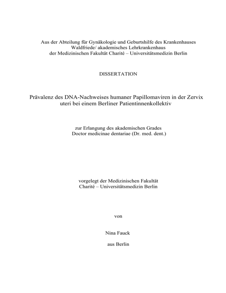 Aus der Abteilung für Gynäkologie und Geburtshilfe des Krankenhauses Waldfriede/ akademisches Lehrkrankenhaus der Medizinischen Fakultät Charité – Universitätsmedizin Berlin DISSERTATION Prävalenz des DNA-Nachweises humaner Papillomaviren in der Zervix uteri bei einem Berliner Patientinnenkollektiv zur Erlangung des akademischen Grades Doctor medicinae dentariae (Dr. med. dent.) vorgelegt der Medizinischen Fakultät Charité – Universitätsmedizin Berlin von !!!!!!!!Nina Fauck aus Berlin Seite 2 Gutachter: 1. "#$%&!'#&!()*&!+&!,-./0)# 2. "#$%&!'#&!()*&!1&2+&!,3$0()# 3. "#45&2'$6&!'#&!()*&!7&!'854* Datum der Promotion: !!9:&;<&9;<; Inhaltsverzeichnis 1 Inhaltsverzeichnis ___________________________________________________________________________ 1 2 Inhaltsverzeichnis ............................................................................................................... 1 Einleitung ............................................................................................................................ 1 2.1 Sexuell übertragbare Krankheiten .................................................................................. 1 2.2 Das humane Papillomavirus........................................................................................... 2 2.2.1 Grundlagen.............................................................................................................. 2 2.2.2 Historie ................................................................................................................... 5 2.2.3 Nomenklatur ........................................................................................................... 7 2.2.4 Übertragung .......................................................................................................... 11 2.2.5 Klinisches Bild...................................................................................................... 12 2.2.6 Entstehung des Zervixkarzinoms........................................................................... 13 2.2.7 Risikofaktoren für die Entstehung des Zervixkarzinoms ........................................ 15 2.2.8 Diagnostik............................................................................................................. 17 2.2.9 Therapie ................................................................................................................ 19 2.2.10 Impfung............................................................................................................... 20 2.2.11 Epidemiologie des Zervixkarzinoms.................................................................... 22 2.2.12 Epidemiologie HPV ............................................................................................ 25 2.3 Ziele und Fragestellung................................................................................................ 27 3 Patientinnen und Methoden ............................................................................................. 28 3.1 Patientinnen ................................................................................................................. 28 3.1.1 Datenerfassung...................................................................................................... 28 3.2 Methoden..................................................................................................................... 29 3.2.1 HPV-Nachweisverfahren....................................................................................... 29 3.2.2 Testverfahren ........................................................................................................ 30 3.2.3 Indikationen des Nachweisverfahrens.................................................................... 32 3.2.4 Datenauswertung und Statistik .............................................................................. 32 4 Ergebnisse ......................................................................................................................... 33 4.1 Betrachtung des Gesamtkollektivs................................................................................ 33 4.1.1 Prävalenz des HPV-Nachweises des gesamten Kollektivs...................................... 33 4.1.2 Prävalenz des High-Risk-HPV-Nachweises........................................................... 34 4.1.2 Prävalenz des Low-Risk-HPV-Nachweises ........................................................... 35 4.1.3 Prävalenz des High-Risk- und Low-Risk-HPV-Nachweises................................... 36 4.2 Altersverteilung ........................................................................................................... 37 4.2.1 Jahrgänge insgesamt.............................................................................................. 37 4.2.2 Durchschnittsalter der Patientinnen ....................................................................... 37 4.2.3 Prävalenz der High-Risk-HPV-Nachweise verschiedener Jahrgänge...................... 38 4.2.4 Prävalenz des High-Risk- und Low-Risk-HPV-Nachweises................................... 40 4.3 Ergebnisse der Zytologie (Pap-Abstriche) .................................................................... 41 4.3.1 Anteil der Patientinnen mit HPV-Test und Zytologie............................................. 41 4.3.2 Zytologische Befunde bei HPV-Infizierten insgesamt............................................ 41 4.3.3 Zytologische Befunde der High-Risk-HPV positiven und Low-Risk-HPV negativen Frauen ................................................................................................................... 42 4.3.4 Zytologische Befunde bei Low-Risk-HPV positiven und High-Risk-HPV negativen Frauen ................................................................................................................... 43 4.3.5 Zytologische Befunde der Low-Risk- und High-Risk-HPV positiven Frauen......... 44 4.3.6 Altersverteilung der zytologi