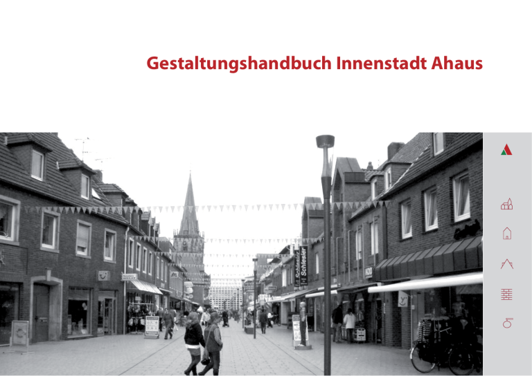 Gestaltungshandbuch Innenstadt Ahaus Herausgeber: Bearbeitet: rha Stadtplanungsamt Rathausplatz 1 48683 Ahaus fon: 02561.72-0 fax: 02561.72-400 reicher haase architekten + stadtplaner Prof. Dipl.-Ing. Christa Reicher Dipl.-Ing. Joachim Haase Architekten BDA und Stadtplaner DASL Oppenhoffallee 74 52066 Aachen Bearbeiter: www.ahaus.de 2., überarbeitete Auflage Ahaus, Oktober 2007 Dipl.-Ing. Svenja Hennig Dipl.-Ing. Oliver Jaworski www.rha-architekten.de Inhalt 02 03 4 6 7 8 10 Vorwort Anlass und Absicht Vorgehensweise Geltungsbereich Stadtbildanalyse 24 Gebäudekomposition 32 Fassadengestaltung 46 Dachgestaltung 56 Materialien und Farben 64 Werbeanlagen Vorwort zur 1. Auflage Die Ahauser Innenstadt hat aufgrund ihrer geschichtlichen Prägung und der Bündelung zentraler Funktionen und Einrichtungen eine besondere Bedeutung für die gesamte Stadt. Als kulturelles und wirtschaftliches Zentrum ist sie identitätsstiftend und imagebildend. Dieses Image wird entscheidend durch das Erscheinungsbild bestimmt. Die Pflege und Weiterentwicklung der Innenstadt muss daher vorrangige Aufgabe der Stadtentwicklung sein und mit größter Sorgfalt verfolgt werden. Dies ist eine fortwährende Aufgabe, an der nicht nur die öffentliche Hand, sondern alle Akteure - Bauherren, Investoren, Architekten und Stadtplaner - beteiligt sind. Das Gestaltungshandbuch und die darauf aufbauende Gestaltungssatzung sollen als Leitfaden die bauliche Gestaltung in der Innenstadt begleiten. Stadt- und baugestalterische Ziele der Gemeinde sind anhand von Empfehlungen und gestalterischen Mindestanforderungen formuliert. Die Inhalte orientieren sich dabei an den vorhandenen Stärken der Innenstadt. Typische Gestaltungsmerkmale sollen erhalten und bauliche Veränderungen so gesteuert werden, dass die Qualität der Innenstadt erhalten bzw. gesteigert werden kann. Dabei geht es nicht um eine historisierende Nachahmung sondern um die Sicherung einer zeitgemäßen Architektur von hoher Qualität. Nur so kann langfrisitg eine abwechslungsreiche, hochwertige Bebauung innerhalb eines harmonischen Stadtbildes erreicht werden. 04 05 Hochwertige Gestaltung öffentlicher und privater Räume ist ein gemeinsames Anliegen, das die Zukunft unserer Innenstadt sichert. Die Neugestaltung und Aufwertung der Fußgängerzone ist in diesem Zusammenhang ein erster, wichtiger Schritt. Felix Büter Bürgermeister Dr. Markus Bradtke Technischer Beigeordneter Anlass und Absicht Die Innenstadt von Ahaus zeichnet sich durch eine Vielzahl ortsbildprägender Gebäude aus, die zusammen den Charakter der Stadt bestimmen. Diese Besonderheiten gilt es zu bewahren und vor Fehlentwicklungen zu schützen. Bei Neu-, An- und Umbauten sollen die unverwechselbaren Qualitäten erhalten und weiterentwickelt werden. Bau- und Freiraumveränderungen, die das charakteristische Ortsbild beeinträchtigen, sollen zukünftig vermieden werden. Aufbauend auf den typischen Merkmalen der Bestandsgebäude werden im Gestaltungshandbuch Empfehlungen zur Gestaltung der Gebäude - von der Fassaden- und Dachgestaltung über die Materialität bis hin zu Werbeanlagen - formuliert. Diese Empfehlungen wenden sich in erster Linie an Bauherren, interessierte Bürger und Händler, die in der Innenstadt Gebäude besitzen, erwerben oder renovieren wollen. Auch für Mieter, Architekten, Handwerksbetriebe und Behörden soll das Gestaltungshandbuch als Anregung dienen und Orientierungshilfe sein. Gestaltregeln sind letztlich im Sinne eines jeden Eigentümers /Nutzers in der Innenstadt, sichern sie doch, dass der eigene Besitz in einem gestaltverträglichen Umfeld bleibt und der städtebauliche, ortsbildprägende Zusammenhalt der Stadt gestärkt wird. Vorgehensweise 06 07 Städtebauliche Gestaltung entfaltet sich im Spannungsfeld zwischen Kontinuität und Innovation. Um die gestalterische Kontinuität der Innenstadt zum Rahmen weiterer Entwicklungen zu machen, ist folgende Vorgehensweise gewählt worden: Die Stadtbildanalyse zeigt die geschichtliche Entwicklung der Innenstadt auf und untersucht das heutige Erscheinungsbild. Sie stützt sich auf die Verwendung von historischem und aktuellem Karten- und Bildmaterial. Gestaltprägende und dadurch identitätsstiftende Bereiche der Innenstadt werden aufgezeigt und in weiteren Schritten detailliert untersucht. Im Anschluss werden Gestaltungsempfehlungen für die Erhaltung, Erneuerung und Weiterentwicklung aufgestellt. Diese aus dem Bestand abgeleiteten Gestaltregeln sichern einerseits eine harmonische Gestaltung des baulichen Ensembles und bieten auf der anderen Seite ausreichend Spielraum für individuelles Bauen und Gestalten. Geltungsbereich Die Empfehlungen des Gestaltungshandbuchs gelten für den heutigen Kernbereich der Innenstadt, der gleichzeitig den Mittelpunkt der historischen Stadtanlage bildet. Er zeichnet sich bis heute durch ein weitgehend homogenes Baugefüge aus. Dieser Bereich umfasst mit der Fußgängerzone auch das Zentrum für Handel und Dienstleistung. Geltungsbereich des Gestaltungshandbuchs 08 09 Stadtbildanalyse Stadtgeschichte Ahaus wird erstmals 1030 als „Haus an der Aa“ urkundlich erwähnt. Neben der Burg als Haupthof der Herren von Ahaus entwickelte sich in der Folgezeit die mittelalterliche Stadt, die schon um 1300 Stadtrechte erhielt. 1689 bis 1695 entstand an der Stelle der niedergelegten Burg eine barocke Schlossanlage. 1863 vernichtete ein Brand die gesamte Stadt Ahaus mit Ausnahme des Schlosses und einiger weniger Häuser. Die Stadt wurde später nach neuesten baulichen Erkenntnissen mit nur zweigeschossigen Gebäuden wieder aufgebaut. Im Zeitalter der Industrialisierung entwickelte sich Ahaus zu einer Kleinstadt. Der Anschluss an das Eisenbahnnetz (1875), die Gründung der Zündholzfabrik (1881, Schließung 1978) sowie die Westfälische Jutespinnerei und Weberei (1883) veränderten nachhaltig das Gesicht der Stadt. Die Bevölkerungszahl stieg zum Ende des 19. Jahrhunderts mit 4.000 Einwohnern auf das Doppelte innerhalb v