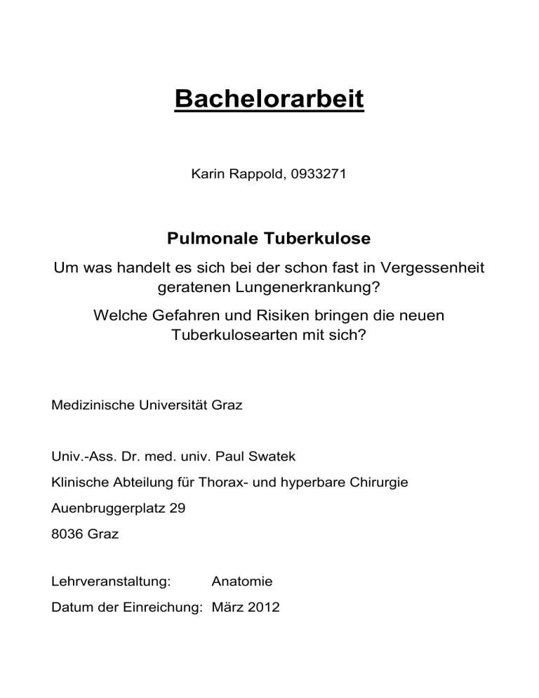 Bachelorarbeit Karin Rappold, 0933271 Pulmonale Tuberkulose Um was handelt es sich bei der schon fast in Vergessenheit geratenen Lungenerkrankung? Welche Gefahren und Risiken bringen die neuen Tuberkulosearten mit sich? Medizinische Universität Graz Univ.-Ass. Dr. med. univ. Paul Swatek Klinische Abteilung für Thorax- und hyperbare Chirurgie Auenbruggerplatz 29 8036 Graz Lehrveranstaltung: Anatomie Datum der Einreichung: März 2012 Ehrenwörtliche Erklärung Ich erkläre ehrenwörtlich, dass ich die vorliegende Bachelorarbeit selbstständig und ohne fremde Hilfe verfasst habe, andere als die angegebene Quellen nicht verwendet habe und die den benutzten Quellen wörtlich oder inhaltlich entnommenen Stellen als solche kenntlich gemacht habe. Weiters erkläre ich, dass ich diese Arbeit in gleicher oder ähnlicher Form noch keiner anderen Prüfungsbehörde vorgelegt habe. Graz, am 16.03.2012 Inhaltsverzeichnis 1. Einleitung – Was ist Tuberkulose? ........................................................................ 1 1.1. Definition laut WHO ........................................................................................ 3 1.2. Klassifikation nach ICD 10 .............................................................................. 3 2. Epidemiologie .......................................................................................................... 5 3. Klinik der Krankheit .............................................................................................. 11 4. 3.1. Ätiologie ........................................................................................................ 11 3.2. Symptome .................................................................................................... 17 3.3. Diagnostisches Vorgehen ............................................................................. 17 3.4. Pathogenese................................................................................................. 25 Therapiemöglichkeiten ......................................................................................... 28 4.1. Medikamentöse Behandlung ........................................................................ 28 4.2. Chirurgische Behandlung ............................................................................. 32 5. Aktuelles: Tuberkulose kehrt zurück! ..................................................................... 33 6. Präventionsmaßnahmen – Welche Maßnahmen können einer Ansteckungsgefahr entgegenwirken? ................................................................ 38 7. Schlussfolgerung .................................................................................................. 40 8. Literaturverzeichnis .............................................................................................. 43 9. Abbildungsverzeichnis ......................................................................................... 49 10. Tabellenverzeichnis .............................................................................................. 50 1. Einleitung – Was ist Tuberkulose? Tuberkulose, in der medizinischen Nomenklatur auch unter Morbus Koch und im geschichtlichen Kontext unter Schwindsucht bekannt, ist eine Infektionskrankheit die von Bakterien der Gruppe der Mykobakterien ausgelöst wird und jedes Organ unseres Körpers befallen kann. Abhängig vom befallenem Organ ergibt es eine spezielle Klinik und Symptomatik (vgl. Greten 2005, S. 985). „Diese können in den ersten Monaten sehr diskret sein: Subfebrile Temperaturen, reduzierter Allgemeinzustand, Leistungsminderung, Nachtschweiß, Gewichtsverlust“ (zit. nach Greten 2005, S. 985). Die häufigste Organmanifestation der Tuberkulose ist laut Greten 2005 die Pleuritis tuberculosa gefolgt von der pulmonalen Tuberkulose, Lymphknotentuberkulose, Urogenitaltuberkulose, Miliartuberkulose, tuberkulösen Meningitis. Weiters häufig ist der Befall von Knochen, Wirbelsäule oder Gelenken (vgl. Greten 2005, S. 985). Die Ansteckung erfolgt meist durch Tröpfcheninfektion. Wird ein gesunder Mensch, der noch nie zuvor mit Mykobakterium tuberculosis in Kontakt kam, durch einen Menschen mit offener Tuberkulose angehustet, so können die Erreger in die Lunge des Gesunden gelangen und sich dort an siedeln. Diese Ansiedlungsorte sind morphologisch knötchenartig strukturiert und werden Tuberkel genannt (vgl. Winkle 1997, S. 83f.). „Bei neunzig Prozent aller Erstinfizierten heilt der Primärkomplex spontan aus, indem die Tuberkel abgekapselt werden und verkalken“ (zit. nach Winkle 1997, S. 84). Wichtige Begriffe die im Zusammenhang mit der Tuberkuloseerkrankung stehen: „Pulmonale Tuberkulose = Tuberkulose der Lunge Extrapulmonale Tuberkulose = Tuberkuloseerkrankung eines anderen Organsystems; Offene Tuberkulose = Tuberkulose mit Erregernachweis im Sputum oder Bronchialsekret Geschlossene Tuberkulose = Tuberkulose ohne Erregernachweis (z.B. klinisch oder histologisch bewiesen“ (zit. nach Greten 2005, S. 435). 1 Tuberkulosegesetz Zu den meldepflichtigen übertragbaren Erkrankungen in Österreich zählt auch die Tuberkuloseerkrankung. Die „Meldepflicht nach dem Tuberkulosegesetz, BGBI. Nr. 127/1968 idgF“ besagt, dass: „Jede Erkrankung und jeder Todesfall an Tuberkulose (hervorgerufen durch Mycobakterium tuberkulosis), die ärztlicher Behandlung oder Überwachung bedarf“ einer Meldepflicht unterliegt. „Meldepflichtig sind: Jede/r mit dem Erkrankungs- oder Todesfall befasste Ärztin/Arzt In Krankenanstalten, Kuranstalten, Pflegeheimen der/die ärztliche Leiter/in bzw. die/der zur ärztlichen Aufsicht verpflichtete Ärztin/Arzt Der/die Totenbeschauer/in oder Prosektor/in Der/die Leiter/in der militärischen Dienststelle, die zur ärztlichen Betreuung von Angehörigen des Bundesheeres berufen ist“ (zit. nach BMFG 2011). Tabelle 1: Angezeigte Fälle übertragbarer Krankheiten 1999 und 2009. Statistik Austria 2010, S. 51. 2 Aus Tabelle 1 ist folgendes er