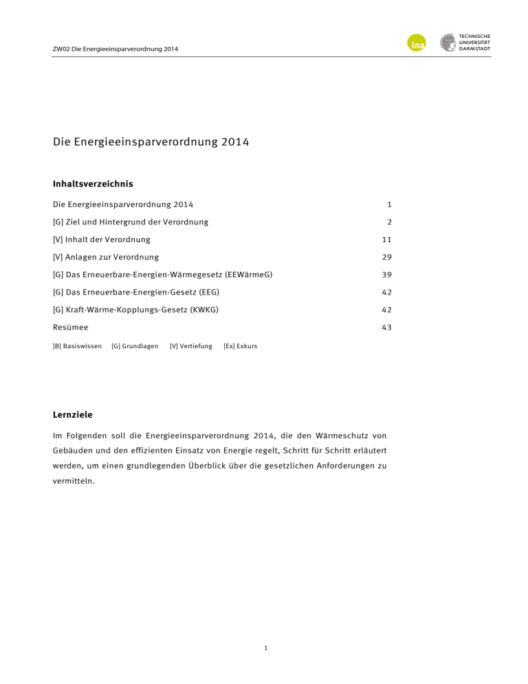 ZW02 Die Energieeinsparverordnung 2014 Die Energieeinsparverordnung 2014 Inhaltsverzeichnis Die Energieeinsparverordnung 2014 1 [G] Ziel und Hintergrund der Verordnung 2 [V] Inhalt der Verordnung 11 [V] Anlagen zur Verordnung 29 [G] Das Erneuerbare-Energien-Wärmegesetz (EEWärmeG) 39 [G] Das Erneuerbare-Energien-Gesetz (EEG) 42 [G] Kraft-Wärme-Kopplungs-Gesetz (KWKG) 42 Resümee 43 [B] Basiswissen [G] Grundlagen [V] Vertiefung [Ex] Exkurs Lernziele Im Folgenden soll die Energieeinsparverordnung 2014, die den Wärmeschutz von Gebäuden und den effizienten Einsatz von Energie regelt, Schritt für Schritt erläutert werden, um einen grundlegenden Überblick über die gesetzlichen Anforderungen zu vermitteln. 1 ZW02 Die Energieeinsparverordnung 2014 [G] Ziel und Hintergrund der Verordnung Die Energieeinsparverordnung (EnEV) ist seit 2002 ein zentrales Steuerungselement der deutschen Bundesregierung zum Energie- und Klimaschutz. Sie bildet die gesetzliche Grundlage im öffentlich-rechtlichen Nachweisverfahren für den vorgeschriebenen Energiestandard im Bauwesen. Dazu definiert sie die Anforderungen an neu zu errichtende Gebäude wie auch an bestimmte bauliche Veränderungsmaßnahmen beim Bauen im Bestand. In der Verordnung werden sowohl Forderungen an den baulichen Wärmeschutz, also an die Qualität der Gebäudehülle, gestellt, als auch die Effizienz der eingesetzten Anlagentechnik zur Heizung, Lüftung, Kühlung, und Warmwasserbereitung bewertet, bei Nicht-Wohngebäuden auch die Beleuchtung. Der resultierende Energiebedarf wird primärenergetisch betrachtet, so dass der Ressourcenverbrauch und mittelbar der CO2-Ausstoss der verwendeten Energieträger berücksichtigt wird. Daraus resultiert, dass beim EnEV-Nachweis von Wohngebäuden neben den in ähnlicher Form schon in der Wärmeschutzverordnung (WSchV) ´95 vorhandenen Anforderungen an den baulichen Wärmeschutz nun auch die effiziente Bereitstellung des Wärmebedarfs für Heizung und Warmwasser erfüllt werden muss. Die Qualität der Gebäudehülle und der Anlagentechnik wird immer im Zusammenhang geprüft. Verbesserungen des baulichen Wärmeschutzes über das notwendige (geforderte) Maß hinaus senken den Wärmebedarf und erweitern den Spielraum bei der Anlagentechnik. Hintergrund der Energieeinsparverordnung Grundstein des Energieeffizienten Bauens war das Energieeinspargesetz (EnEG) von 1976, welches aus Gründen der Ressourcensicherheit vor dem Hintergrund der Ölkrise zu verstehen ist. In der Begründung des Bundestages (Drucksache 7/4575) werden die Gründe wie folgt dargelegt: 2 Originaltext der EnEV 2014 → Anlage zu ZW02 → www.enevonline.com/enev_2014_vollte xt/index.htm ZW02 Die Energieeinsparverordnung 2014 „Die auf längere Sicht Importabhängigkeit der begrenzte Verfügbarkeit Bundesrepublik der Deutschland Energie, und die die hohe zunehmende Verteuerung der Energie erfordern energiepolitisch einen rationelleren und sparsameren Einsatz. Damit werden zugleich die durch die Energieerzeugung und den -verbrauch bedingten Umweltbelastungen verringert." [...] „Generell kann davon ausgegangen werden, dass eine Verknappung des Energieangebots und steigende Preise ein energiebewusstes Verhalten der Verbraucher zur Folge haben. Die energiepolitisch gebotene rationellere Energienutzung ist in dem durch das Gesetz erfassten Bereich allein über den Preis jedoch nicht zu erreichen. Die notwendigen Maßnahmen in diesem Bereich müssen angesichts der Langfristigkeit der Investitionen bereits bei der Errichtung der Gebäude und der Installation der heizungs- und lüftungstechnischen Anlagen ansetzen. Nachträgliche Maßnahmen erfordern einen unverhältnismäßig höheren Kostenaufwand. Weiter besteht im Bereich des Wohnungsbaus das Problem unterschiedlicher Träger für die Investitionen und die Heizkosten. Dies gilt insbesondere für den Mietwohnungsbau, da der Mieter keine Möglichkeit hat, durch eigene Investitionen seinen Energieverbrauch zu senken. Für Raumheizung und Klimatisierung im Hochbau können die technisch möglichen und energiewirtschaftlich notwendigen Einsparungen ohne gesetzliche Regelung nicht durchgesetzt werden." Das Gesetz ermächtigte die Bundesregierung, im Laufe der Jahre Verordnungen zum energieeffizienten Bauen zu erlassen. So wurde 1977 die Wärmeschutzverordnung (WSchV) als erste öffentlich-rechtliche Vorschrift zum energiesparenden Wärmeschutz von Gebäuden erlassen, gefolgt von der Heizungsanlagenverordnung (HzAnlV) 1978 zur Regelung der Ausstattung und Auslegung von Zentralheizungen und Warmwasseranlagen. Diese Vorschriften wurden in den folgenden Jahren immer wieder erweitert und novelliert. So wurden mit der WSchV 1982 auch Anforderungen an bauliche Änderungen im Bestand sowie an den sommerlichen Wärmeschutz gestellt. Mit der dritten und finalen Fassung als WSchV 1995 wurde der technischen Entwicklung von Wärmeschutzverglasung und Lüftungsanlagen mit Wärmerückgewinnung durch die Umstellung auf ein Bilanzverfahren Rechnung getragen, welches als neuen Energiekennwert den Jahresheizwärmebedarf einführt und so auch solare Gewinne und Lüftungswärmeverluste bilanziert. 3 ZW02 Die Energieeinsparverordnung 2014 Parallel dazu wurde auch die Heizungsanlagenverordnung 1982 durch die Vorschrift zur Nachrüstung erweitert. 1989 wurde die bisher geltende Heizungsbetriebsverordnung aufgelöst und die Inhalte in die Heizanlagenverordnung übernommen. Die Novellierungen 1994 und 1998 dienten der Umsetzung der Europäischen Heizkesselrichtlinie. In der ersten Energieeinsparverordnung (EnEV) 2002 wurden die letzte Wärmeschutzverordnung (WSchV) 1995 und die Heizungsanlagenverordnung (HzAnlV) 1998 zusammengefasst und deren methodische Ansätze sowie die Anforderungen aufeinander abgestimmt und weiterentwickelt. Die Bilanzierung von Gebäuden betrachtet nun den Wärmebedarf - die sogenannte Nutzenergie - und die Bereitstellung der Nutzenergie in einem System und erweitert dieses um die Auswirkungen des E
