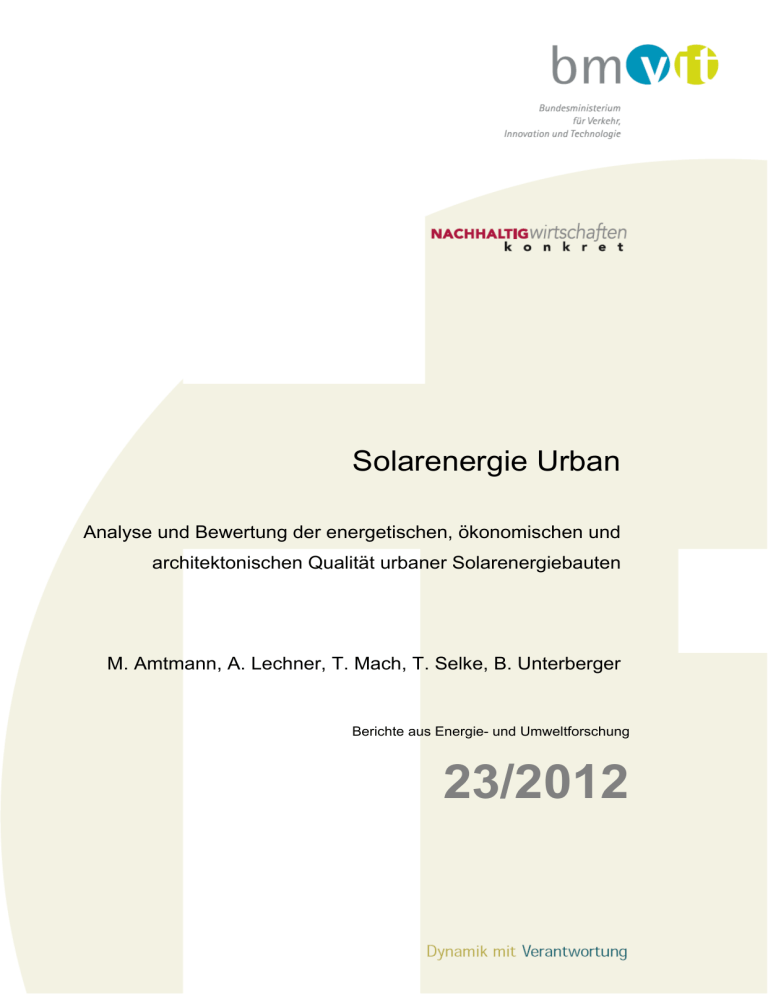 Solarenergie Urban Analyse und Bewertung der energetischen, ökonomischen und architektonischen Qualität urbaner Solarenergiebauten M. Amtmann, A. Lechner, T. Mach, T. Selke, B. Unterberger Berichte aus Energie- und Umweltforschung 23/2012 Impressum: Eigentümer, Herausgeber und Medieninhaber: Bundesministerium für Verkehr, Innovation und Technologie Radetzkystraße 2, 1030 Wien Verantwortung und Koordination: Abteilung für Energie- und Umwelttechnologien Leiter: DI Michael Paula Liste sowie Downloadmöglichkeit aller Berichte dieser Reihe unter http://www.nachhaltigwirtschaften.at Solarenergie Urban Analyse und Bewertung der energetischen, ökonomischen und architektonischen Qualität urbaner Solarenergiebauten DI Maria Amtmann, Ing. Thomas Barth (AEA) Univ.-Prof. DI Dr. Gerhard Faninger (IFF, Uni Klagenfurt) DI Susanne Gosztonyi, DI Tim Selke, DI (FH) Florian Stift (AIT) DI Lorenz Griendl, DI Dr. Richard Heimrath, DI Dr. Thomas Mach (IWT, TU Graz) DI Sophie Grünewald, DI Dr. Andreas Lechner (IGL, TU Graz) Ing. Peter Jacob (Mischek Bauträger Service GmbH) DI (HTL) Emanuel Mairinger, DI Beatrice Unterberger (Dr. Ronald Mischek ZT GmbH) Wien, Dezember 2011 Ein Projektbericht im Rahmen des Programms im Auftrag des Bundesministeriums für Verkehr, Innovation und Technologie 4 Vorwort Der vorliegende Bericht dokumentiert die Ergebnisse eines Projekts aus dem Forschungsund Technologieprogramm Haus der Zukunft des Bundesministeriums für Verkehr, Innovation und Technologie. Die Intention des Programms ist, die technologischen Voraussetzungen für zukünftige Gebäude zu schaffen. Zukünftige Gebäude sollen höchste Energieeffizienz aufweisen und kostengünstig zu einem Mehr an Lebensqualität beitragen. Manche werden es schaffen, in Summe mehr Energie zu erzeugen als sie verbrauchen („Haus der Zukunft Plus“). Innovationen im Bereich der zukunftsorientierten Bauweise werden eingeleitet und ihre Markteinführung und -verbreitung forciert. Die Ergebnisse werden in Form von Pilot- oder Demonstrationsprojekten umgesetzt, um die Sichtbarkeit von neuen Technologien und Konzepten zu gewährleisten. Das Programm Haus der Zukunft Plus verfolgt nicht nur den Anspruch, besonders innovative und richtungsweisende Projekte zu initiieren und zu finanzieren, sondern auch die Ergebnisse offensiv zu verbreiten. Daher werden sie in der Schriftenreihe publiziert und elektronisch über das Internet unter der Webadresse http://www.HAUSderZukunft.at Interessierten öffentlich zugänglich gemacht. DI Michael Paula Leiter der Abt. Energie- und Umwelttechnologien Bundesministerium für Verkehr, Innovation und Technologie 5 6 Inhaltsverzeichnis Kurzfassung .............................................................................................................................9 Abstract ..................................................................................................................................12 1 Einleitung.........................................................................................................................15 1.1 Allgemeine Einführung in die Thematik ...................................................................15 1.2 Schwerpunkte der Arbeit .........................................................................................17 1.3 Methodische Vorgehensweise ................................................................................17 1.4 Architektonische Qualität und städtisches Wohnen ................................................21 2 Ergebnisse aus den Case Stories ...................................................................................26 2.1 Überblick über die Musterbauvorhaben ..................................................................26 2.2 Über alle Szenarien gleich bleibende Annahmen der Systemsimulationen ............26 2.3 Neubau – Geschoßwohnbau urbaner Randbezirk ..................................................31 2.4 Neubau – Geschoßwohnbau dichte Verbauung .....................................................44 2.5 Sanierung – freistehendes Wohnhochhaus der 1970er Jahre ................................54 2.6 Sanierung – Gründerzeithaus in Blockrandbebauung.............................................72 3 Zusammenfassung und Schlussfolgerungen der Ergebnisse der Case Stories .............82 3.1 Architektonische Aspekte gebäudeintegrierter Solarthermie...................................82 3.2 Schlussfolgerungen betreffend energetische Erträge und Deckungsgrade ............86 3.3 Schlussfolgerungen aus bautechnischer und bauphysikalischer Sicht ...................87 4 Markt- und Realisierungspotenziale ................................................................................90 5 Fazit und Ausblick ...........................................................................................................91 6 Literaturverzeichnis .........................................................................................................92 7 Abbildungs- / Tabellenverzeichnis...................................................................................95 8 Anhang ............................................................................................................................97 8.1 Überblick über kontaktierte Industrieunternehmen..................................................97 8.2 Tools zur schnellen Abschätzung von relevanten Energie-, CO2- und Kostenkennwerten...................................................................................................99 8.3 Projektkooperationen ............................................................................................108 7 8 Kurzfassung Ausgangssituation/Motivation Der Gebäudesektor ist einerseits einer der Hauptemittenten von CO2 und verbraucht andererseits einen hohen Anteil an Fläche. Es erscheint daher sinnvoll, Gebäude nicht nur so energieeffizient wie möglich zu errichten, sondern darüber hinaus auch die verfüg