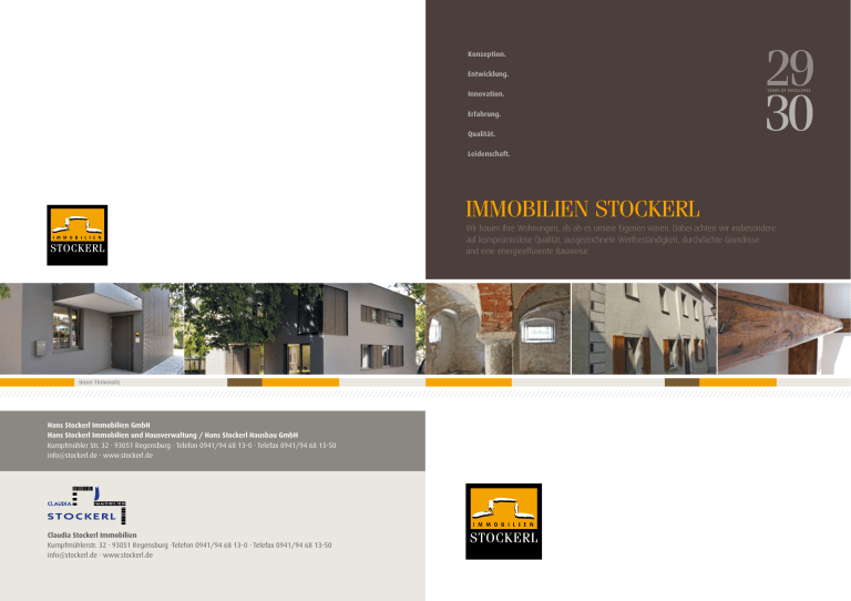 Konzeption. Entwicklung. Innovation. Erfahrung. Qualität. 29 30 YEARS OF EXCELLENCE Leidenschaft. IMMOBILIEN STOCKERL Wir bauen Ihre Wohnungen, als ob es unsere Eigenen wären. Dabei achten wir insbesondere auf kompromisslose Qualität, ausgezeichnete Wertbeständigkeit, durchdachte Grundrisse und eine energieeffiziente Bauweise. Unser Firmensitz Hans Stockerl Immobilien GmbH Hans Stockerl Immobilien und Hausverwaltung / Hans Stockerl Hausbau GmbH Kumpfmühler Str. 32 · 93051 Regensburg · Telefon 0941/94 68 13-0 · Telefax 0941/94 68 13-50 [email protected] · www.stockerl.de Claudia Stockerl Immobilien Kumpfmühlerstr. 32 · 93051 Regensburg ·Telefon 0941/94 68 13-0 · Telefax 0941/94 68 13-50 [email protected] · www.stockerl.de Stocker Immobilien steht für Erfahrung, Qualität und Leidenschaft. Wir sind davon überzeugt, dass nur die Liebe zum Detail ein Gebäude zum Zuhause machen kann. Daher vertrauen wir, die Hans Stockerl Immobilien GmbH ausschließlich Architekten, Handwerkern und anderen Kompetenzträgern, die das gleiche Verständnis von Qualität haben wie wir. Unsere Bauarbeiten erfolgen daher unter strengsten, selbst auferlegten Qualitätsnormen und -standards. Hierbei kommen nur beste Materialien, Produkte und Marken zum Einsatz. Zudem garantieren wir Ihnen mehr als 29 Jahre Erfahrung im Bau- und Immobiliengewerbe. ALTBAU- UND DENKMALSANIERUNG NEUBAUIMMOBILIEN Unser Spezialgebiet liegt im Bereich der Altbau- und Denkmalsanierung. Für uns ist es immer wieder aufs Neue spannend, eine bauliche Zeitreise zu erleben und bei einer umfassenden Generalsanierung historische Details in Einklang mit modernen Lebensanforderungen zu bringen. Wir bauen Ihre Wohnungen, als ob es unsere Eigenen wären. So haben wir es in der Vergangenheit immer geschafft, traditionelle Altbauten in Regensburg zu restaurieren, somit ein neues Schmuckstück zu erschaffen und gleichzeitig den ursprünglichen Charme des Gebäudes zu erhalten. Bereits bei der Auswahl des Baugrunds achten wir auf eine gute Lage, beste Anbindungen und ein gewachsenes Umfeld. Beim Bau realisieren wir insbesondere kompromisslose Qualität, ausgezeichnete Wertbeständigkeit, durchdachte Grundrisse und eine energieeffiziente Bauweise. Eine moderne innovative Architektur ist uns dabei ebenso selbstverständlich wie höchste Wohnqualität. Unser Fokus liegt darauf, Werte zu schaffen, die bleiben. Vorher / Nachher Impressionen Aussenfassade Dachstuhl Wohnungsinnentür Historisches Kappengewölbe Historische Bohlenbalkendecke Gästetoilette Unser Herz schlägt für Regensburg damals wie heute Heimat und Lieblingsstadt von Hans Stockerl Immobilien GmbH. Vermietservice Hausverwaltung und Hausmeisterservice Wenn Sie auf der Suche nach Ihrem Traummietobjekt sind oder selbst eine Immobilie vermieten möchten, sind Sie bei uns an der richtigen Adresse. Wir bieten Ihnen eine professionelle und ertragsorientierte Verwaltung Ihrer Immobilien nach den aktuellen Richtlinien des Wohnungseigentumsgesetzes. Regensburg liegt am nördlichsten Punkt der Donau und ist mit fast 2000 Jahren Geschichte die älteste Stadt Bayerns. Von der Vermarktung, bis über Besichtigungen, unterstützende Tätigkeit bei der Findung des optimalen Mieters, bis zum Mietvertragsabschluss und der Wohnungsübergabe – unser Team von Claudia Stockerl Immobilien bietet Ihnen ein Rundum-Sorglos-Paket. Mit unserer langjährigen Erfahrung und der dazugehörigen Kompetenz betreuen wir Sie mit allen Leistungen, die heute zu einer modernen Immobilienverwaltung gehören. Neben herrlichen Spaziergängen durch den antiken Stadtkern und der grünen Umgebung gibt es hier alles, was man sich im Bezug auf städtischen Wohnkomfort nur wünschen kann. Wohnen in Regensburg bedeutet Lebensgefühl angereichert durch das kulturelle Angebot und das schon fast südländische Flair der Altstadt, die nicht ohne Grund die nördlichste Stadt Italiens genannt wird. Jährliche Abrechnungen, Eigentümerversammlungen sowie ein zuverlässiger Hausmeister- und Reinigungsservice sind nur ein kleiner Auszug unseres Tätigkeitsbereichs. Sicherheit und gegenseitiges Vertrauen steht bei uns an oberster Stelle. Wir überzeigen durch Zuverlässigkeit, Leistung und Service. Historisches Treppenhaus Aussenfassade