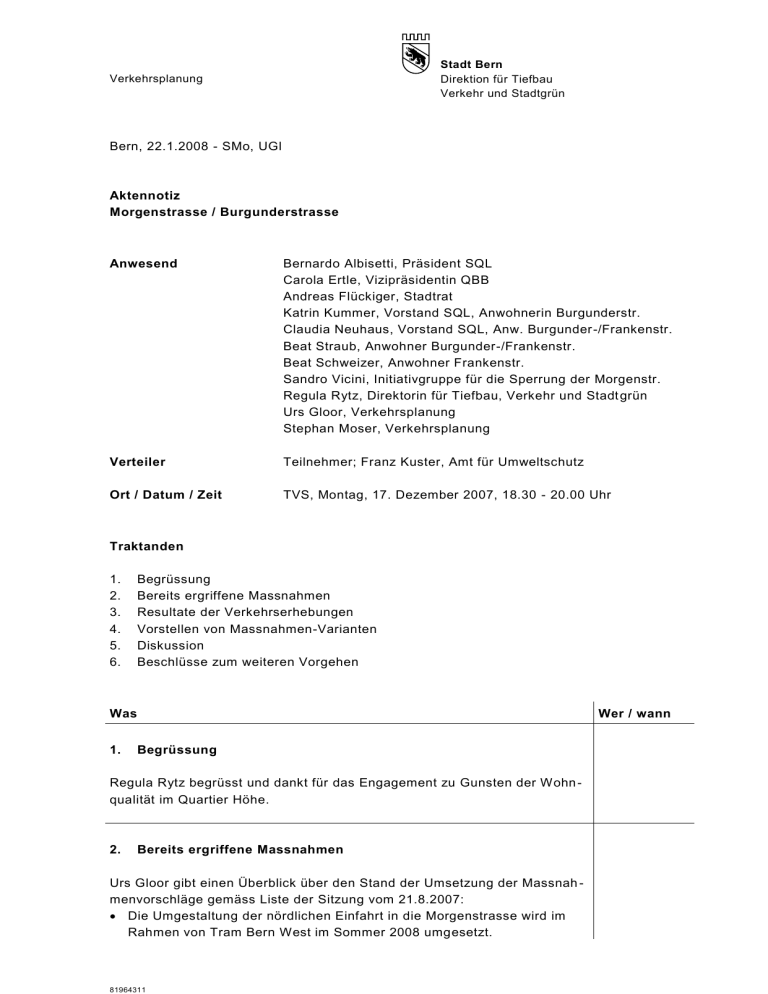 Stadt Bern Direktion für Tiefbau Verkehr und Stadtgrün Verkehrsplanung Bern, 22.1.2008 - SMo, UGl Aktennotiz Morgenstrasse / Burgunderstrasse Anwesend Bernardo Albisetti, Präsident SQL Carola Ertle, Vizipräsidentin QBB Andreas Flückiger, Stadtrat Katrin Kummer, Vorstand SQL, Anwohnerin Burgunderstr. Claudia Neuhaus, Vorstand SQL, Anw. Burgunder -/Frankenstr. Beat Straub, Anwohner Burgunder-/Frankenstr. Beat Schweizer, Anwohner Frankenstr. Sandro Vicini, Initiativgruppe für die Sperrung der Morgenstr. Regula Rytz, Direktorin für Tiefbau, Verkehr und Stadt grün Urs Gloor, Verkehrsplanung Stephan Moser, Verkehrsplanung Verteiler Teilnehmer; Franz Kuster, Amt für Umweltschutz Ort / Datum / Zeit TVS, Montag, 17. Dezember 2007, 18.30 - 20.00 Uhr Traktanden 1. 2. 3. 4. 5. 6. Begrüssung Bereits ergriffene Massnahmen Resultate der Verkehrserhebungen Vorstellen von Massnahmen-Varianten Diskussion Beschlüsse zum weiteren Vorgehen Was 1. Wer / wann Begrüssung Regula Rytz begrüsst und dankt für das Engagement zu Gunsten der Wohn qualität im Quartier Höhe. 2. Bereits ergriffene Massnahmen Urs Gloor gibt einen Überblick über den Stand der Umsetzung der Massnah menvorschläge gemäss Liste der Sitzung vom 21.8.2007: Die Umgestaltung der nördlichen Einfahrt in die Morgenstrasse wird im Rahmen von Tram Bern West im Sommer 2008 umgesetzt. 81964311 Seite 2/7 Was Wer / wann Auf zusätzliche Pfosten auf den Gehwegen wird verzichtet, weil damit Fussgänger, Strassenreinigung und Schneeräumung zu stark behin dert würden. Die Stadtpolizei hat auf der Morgenstrasse eine Geschwindigkeitskontrolle durchgeführt und dabei 4 Geschwindigkeitsverstösse geahndet. In der Begegnungszone beim Bahnhof Bümpliz Süd ist das Geschwindig keitsverhalten etwas zu hoch (v85 = 27 bzw. 31 km/h). Nachbesserungen werden geprüft. Ein Fussgängerstreifen kann jedoch nicht markiert werden. VP VP Der Brief des Schulkreises Bümpliz/Höhe wird von der VP im direkten Ge spräch mit den Absendern behandelt. Es gibt aber auch Zusammen hänge zu den Varianten fürs weitere Vorgehen (z.B. Tempo 30 Bümpliz strasse). 3. Resultate der Verkehrserhebungen Stephan Moser stellt die Ergebnisse der Verkehrserhebungen vor (vgl. Beilagen): Im Mai/Juni 2007 und im November 2007 wurden an mehreren Messstellen während zwei Wochen Dauerzählungen durchgeführt. Diese ermöglichen einen direkten Vergleich der Vorher-/Nachher-Situation. Besonders interessant sind folgende Werte: Quartiernetz: Auf der Morgenstrasse hat der Verkehr im Bereich der Shell-Tankstelle um rund die Hälfte abgenommen (vorher 3’150, nachher 1’630 Fz/Tag). Damit wurde das primäre Ziel der Lärmsanierung der Morgenstrasse erreicht. Auf der Frankenstrasse (Post) wurde eine leichte Abnahme gemessen (vorher 1’420, nachher 1'160 Fz/Tag). Auf der Statthalterstrasse kann keine signifikante Veränderung des Verkehrsaufkommens festgestellt werden (vorher 1'780, nachher 1’810 Fz/Tag). Eine Verdrängung auf die Statthalterstrasse hat somit nicht stattgefunden. Übergangsnetz: Auf der Morgenstrasse Süd (Nr. 148) kann keine signifikante Veränderung des Verkehrsaufkommens festgestellt werden (vorher 8'040, nachher 8’120 Fz/Tag). Auf der Bümplizstrasse (Schulhaus Statthalter) wurde eine Zunahme um rund 1'300 Fz/Tag registriert (vorher 3’720, nachher 5'040 Fz/Tag). Damit ist die Zunahme auf der Bümplizstrasse kleiner ausgefallen als prognostiziert (Prognose: + 2'800 Fz/Tag). Basisnetz: Auf der Bernstrasse (Post) wurde eine Zunahme um 1'000 Fz gemessen (vorher 9'040, nachher 10’030 Fz/Tag). Damit ist die Zunahme auf der Bernstrasse kleiner ausgefallen als prognostiziert (Prognose: + 2'300 Fz/Tag). Auf der Freiburgstrasse (Nr. 453) und auf der Bernstrasse im Bereich der Abzweigung Bethlehemstrasse wurden keine signifikanten Veränderungen des Verkehrsaufkommens registriert. Das Messgerät in der Burgunderstrasse Nord hatte Ausfälle und lieferte für Seite 3/7 Was Wer / wann November 2007 keine Vergleichswerte (Vorher: 1’075 Fz/Tag). Aussagen zur Verkehrsverlagerung innerhalb des Quartiers können dank der Kordonzählung von November 2007 gemacht werden. Dabei wurden während drei Zeitabschnitten (6.30 - 8.15 Uhr, 14.45 - 16.15 Uhr und 16.45 18.15 Uhr) an den Quartierzu- und -wegfahrten die Endziffern der Autonummern aller ein- und ausfahrenden Fahrzeuge erfasst und innerhalb von Zeitintervallen verglichen. So liessen sich die Verkehrsströme in Durchgangs-, Ziel- und Quellverkehr aufteilen und mit der analogen Kordonzählung von 2002 vergleichen. Besonders interessant sind folgende Werte (zu beachten: die relativen Werte umfassen nur die genannten Zeitabschnitte): Die Anzahl der in den drei Zeitabschnitten erfassten Fahrzeuge ging von 2'300 (2002) auf rund 1'000 Fahrzeuge zurück (-56%). Die Anzahl Durchgangsfahrten ging insgesamt um knapp 70% zurück (2002: 800, 2007: 250 registrierte Fahrten). Die am stärksten vom Durchgangsverkehr belastete Route führt neu (in beiden Richtungen) über die Burgunderstrasse Süd – Frankenstrasse – Morgenstrasse Nord, wenn auch in weit geringerem Ausmass als 2002 auf der damaligen Durchgangsachse Morgenstrasse. Beispiel: In der Abendspitze werden in der Burgunderstrasse Süd wie auch in der Morgenstrasse Nord knapp 100 Durchgangsfahrten registriert, das bedeutet für die Morgenstrasse Nord gegenüber der Messung 2002 eine Abnahme um rund 130 Fahrten, für die Burgunderstrasse Süd eine Zunahme um rund 20 Durchgangsfahrten Fahrten pro Stunde. Werden auch die Veränderungen des Ziel- und Quellverkehrs mitberechnet resultiert in der Abendspitze auf der Morgenstrasse Nord eine Abnahme von rund 150 Fahrten, in der Burgunderstrasse Süd eine Z unahme von rund 40 Fahrten/Stunde. Die Burgunderstrasse Süd hat gegenüber 2002 eine Mehrbelastung von rund 200 Fz/Tag erfahren (vorher 1’100, nachher 1'300 Fz/Tag = Hochrechnung aus den Kordonzählungen). Sie ist damit die einzige Messstelle mit einer Verkehrszunahme. Die heutige Ve