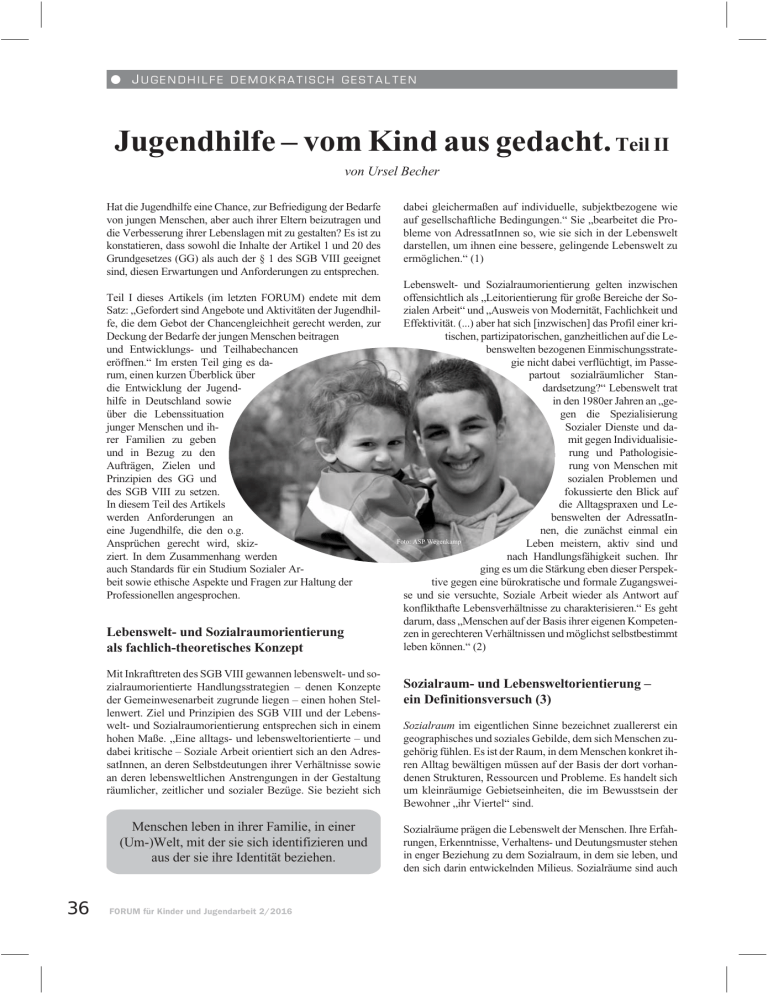 l JUGENDHILFE DEMOKRATISCH GESTALTEN Jugendhilfe – vom Kind aus gedacht. Teil II von Ursel Becher Hat die Jugendhilfe eine Chance, zur Befriedigung der Bedarfe von jungen Menschen, aber auch ihrer Eltern beizutragen und die Verbesserung ihrer Lebenslagen mit zu gestalten? Es ist zu konstatieren, dass sowohl die Inhalte der Artikel 1 und 20 des Grundgesetzes (GG) als auch der § 1 des SGB VIII geeignet sind, diesen Erwartungen und Anforderungen zu entsprechen. Teil I dieses Artikels (im letzten FORUM) endete mit dem Satz: „Gefordert sind Angebote und Aktivitäten der Jugendhilfe, die dem Gebot der Chancengleichheit gerecht werden, zur Deckung der Bedarfe der jungen Menschen beitragen und Entwicklungs- und Teilhabechancen eröffnen.“ Im ersten Teil ging es darum, einen kurzen Überblick über die Entwicklung der Jugendhilfe in Deutschland sowie über die Lebenssituation junger Menschen und ihrer Familien zu geben und in Bezug zu den Aufträgen, Zielen und Prinzipien des GG und des SGB VIII zu setzen. In diesem Teil des Artikels werden Anforderungen an eine Jugendhilfe, die den o.g. Ansprüchen gerecht wird, skizziert. In dem Zusammenhang werden auch Standards für ein Studium Sozialer Arbeit sowie ethische Aspekte und Fragen zur Haltung der Professionellen angesprochen. Lebenswelt- und Sozialraumorientierung als fachlich-theoretisches Konzept Mit Inkrafttreten des SGB VIII gewannen lebenswelt- und sozialraumorientierte Handlungsstrategien – denen Konzepte der Gemeinwesenarbeit zugrunde liegen – einen hohen Stellenwert. Ziel und Prinzipien des SGB VIII und der Lebenswelt- und Sozialraumorientierung entsprechen sich in einem hohen Maße. „Eine alltags- und lebensweltorientierte – und dabei kritische – Soziale Arbeit orientiert sich an den AdressatInnen, an deren Selbstdeutungen ihrer Verhältnisse sowie an deren lebensweltlichen Anstrengungen in der Gestaltung räumlicher, zeitlicher und sozialer Bezüge. Sie bezieht sich Menschen leben in ihrer Familie, in einer (Um-)Welt, mit der sie sich identifizieren und aus der sie ihre Identität beziehen. 36 FORUM für Kinder und Jugendarbeit 2/2016 dabei gleichermaßen auf individuelle, subjektbezogene wie auf gesellschaftliche Bedingungen.“ Sie „bearbeitet die Probleme von AdressatInnen so, wie sie sich in der Lebenswelt darstellen, um ihnen eine bessere, gelingende Lebenswelt zu ermöglichen.“ (1) Lebenswelt- und Sozialraumorientierung gelten inzwischen offensichtlich als „Leitorientierung für große Bereiche der Sozialen Arbeit“ und „Ausweis von Modernität, Fachlichkeit und Effektivität. (...) aber hat sich [inzwischen] das Profil einer kritischen, partizipatorischen, ganzheitlichen auf die Lebenswelten bezogenen Einmischungsstrategie nicht dabei verflüchtigt, im Passepartout sozialräumlicher Standardsetzung?“ Lebenswelt trat in den 1980er Jahren an „gegen die Spezialisierung Sozialer Dienste und damit gegen Individualisierung und Pathologisierung von Menschen mit sozialen Problemen und fokussierte den Blick auf die Alltagspraxen und Lebenswelten der AdressatInnen, die zunächst einmal ein Foto: ASP Wegenkamp Leben meistern, aktiv sind und nach Handlungsfähigkeit suchen. Ihr ging es um die Stärkung eben dieser Perspektive gegen eine bürokratische und formale Zugangsweise und sie versuchte, Soziale Arbeit wieder als Antwort auf konflikthafte Lebensverhältnisse zu charakterisieren.“ Es geht darum, dass „Menschen auf der Basis ihrer eigenen Kompetenzen in gerechteren Verhältnissen und möglichst selbstbestimmt leben können.“ (2) Sozialraum- und Lebensweltorientierung – ein Definitionsversuch (3) Sozialraum im eigentlichen Sinne bezeichnet zuallererst ein geographisches und soziales Gebilde, dem sich Menschen zugehörig fühlen. Es ist der Raum, in dem Menschen konkret ihren Alltag bewältigen müssen auf der Basis der dort vorhandenen Strukturen, Ressourcen und Probleme. Es handelt sich um kleinräumige Gebietseinheiten, die im Bewusstsein der Bewohner „ihr Viertel“ sind. Sozialräume prägen die Lebenswelt der Menschen. Ihre Erfahrungen, Erkenntnisse, Verhaltens- und Deutungsmuster stehen in enger Beziehung zu dem Sozialraum, in dem sie leben, und den sich darin entwickelnden Milieus. Sozialräume sind auch Jugendhilfe – vom Kind aus gedacht Grundlage für ihre Identitätsentwicklung. Gleichzeitig beeinflussen die sozialräumlichen Erfahrungen ihre Handlungspläne und Zukunftsperspektiven, indem sie z.B. Entwicklungschancen begünstigen oder behindern. Das jeweilige Milieu beeinflusst auch die Integrations- und Partizipationsmöglichkeiten der BewohnerInnen und damit ihre Lebensqualität. Lebenswelten sind in elementarer Weise geprägt durch die alten Gegensätze von Arm und Reich. l Einbeziehung des Sozialraums als ein Phänomen, das Einstellungen und Verhaltensweisen beeinflusst und sich auf die Entwicklung von jungen Menschen und ihren Familien Hurrelmann definiert die Lebenslage als den Handlungsspielsowohl begünstigend als auch benachteiligend auswirken raum, der den Menschen aufgrund ihrer Lebensumstände zur kann. Befriedigung ihrer Bedarfe und Interessen zur Verfül Betrachtung von Verhaltensweisen im jeweiligung steht. Sie ist gekennzeichnet durch MultidiFoto: ASP Wegenkamp gen sozioökonomischen und -ökologischen mensionalität sowie die klassische „Triade soKontext. zialer Ungleichheit“, die bestimmt wird Partizipation der Betroffenen; das beinl durch Einkommen, Bildung und Beruf haltet u.a. die Ablehnung der Defizit(bzw. Erwerbslosenstatus) und den daorientierung Sozialer Arbeit zugunsraus abgeleiteten Dimensionen, z.B. ten der Einbeziehung von VorstelKompetenzen, Lebensstile und gelungen und Lösungswegen besellschaftliche Positionen. nachteiligter Menschen, deren Ressourcen als bedeutsam für Lebenswelten beziehen sich darauf, den Veränderungsprozess angewie Menschen sich – in Wechselsehen werden. beziehung zu ihrer Umwelt – erfahl Unterstützung benachteiligter ren, 
