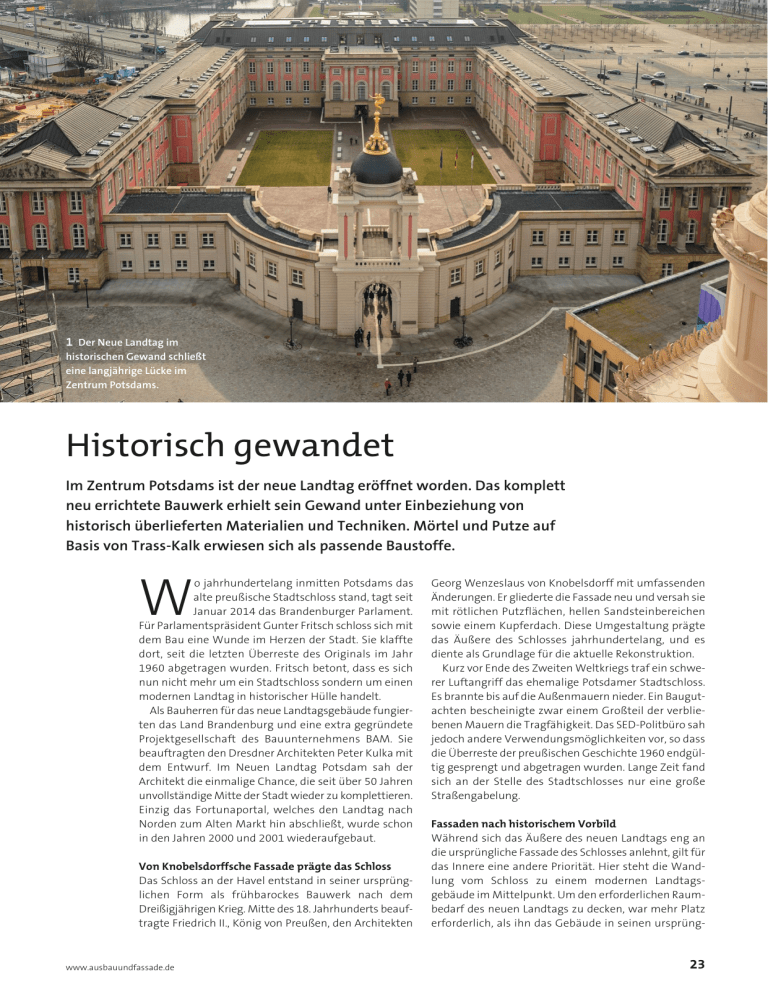 1 Der Neue Landtag im historischen Gewand schließt eine langjährige Lücke im Zentrum Potsdams. Historisch gewandet Im Zentrum Potsdams ist der neue Landtag eröffnet worden. Das komplett neu errichtete Bauwerk erhielt sein Gewand unter Einbeziehung von historisch überlieferten Materialien und Techniken. Mörtel und Putze auf Basis von Trass-Kalk erwiesen sich als passende Baustoffe. W o jahrhundertelang inmitten Potsdams das alte preußische Stadtschloss stand, tagt seit Januar 2014 das Brandenburger Parlament. Für Parlamentspräsident Gunter Fritsch schloss sich mit dem Bau eine Wunde im Herzen der Stadt. Sie klaffte dort, seit die letzten Überreste des Originals im Jahr 1960 abgetragen wurden. Fritsch betont, dass es sich nun nicht mehr um ein Stadtschloss sondern um einen modernen Landtag in historischer Hülle handelt. Als Bauherren für das neue Landtagsgebäude fungierten das Land Brandenburg und eine extra gegründete Projektgesellschaft des Bauunternehmens BAM. Sie beauftragten den Dresdner Architekten Peter Kulka mit dem Entwurf. Im Neuen Landtag Potsdam sah der Architekt die einmalige Chance, die seit über 50 Jahren unvollständige Mitte der Stadt wieder zu komplettieren. Einzig das Fortunaportal, welches den Landtag nach Norden zum Alten Markt hin abschließt, wurde schon in den Jahren 2000 und 2001 wiederaufgebaut. Von Knobelsdorffsche Fassade prägte das Schloss Das Schloss an der Havel entstand in seiner ursprünglichen Form als frühbarockes Bauwerk nach dem Dreißigjährigen Krieg. Mitte des 18. Jahrhunderts beauftragte Friedrich II., König von Preußen, den Architekten www.ausbauundfassade.de Georg Wenzeslaus von Knobelsdorff mit umfassenden Änderungen. Er gliederte die Fassade neu und versah sie mit rötlichen Putzflächen, hellen Sandsteinbereichen sowie einem Kupferdach. Diese Umgestaltung prägte das Äußere des Schlosses jahrhundertelang, und es diente als Grundlage für die aktuelle Rekonstruktion. Kurz vor Ende des Zweiten Weltkriegs traf ein schwerer Luftangriff das ehemalige Potsdamer Stadtschloss. Es brannte bis auf die Außenmauern nieder. Ein Baugutachten bescheinigte zwar einem Großteil der verbliebenen Mauern die Tragfähigkeit. Das SED-Politbüro sah jedoch andere Verwendungsmöglichkeiten vor, so dass die Überreste der preußischen Geschichte 1960 endgültig gesprengt und abgetragen wurden. Lange Zeit fand sich an der Stelle des Stadtschlosses nur eine große Straßengabelung. Fassaden nach historischem Vorbild Während sich das Äußere des neuen Landtags eng an die ursprüngliche Fassade des Schlosses anlehnt, gilt für das Innere eine andere Priorität. Hier steht die Wandlung vom Schloss zu einem modernen Landtagsgebäude im Mittelpunkt. Um den erforderlichen Raumbedarf des neuen Landtags zu decken, war mehr Platz erforderlich, als ihn das Gebäude in seinen ursprüng- 23 PUTZ + TROCKENBAU 2 Die aus der Fassadenflucht zurückweichenden Flächen bilden mit einem Quaderputz das Sandsteinmauerwerk nach. lichen Proportionen bereit hielt. Architekt Kulka löste das Problem, indem er die hofseitigen Fassaden komplett verschob, dabei aber die Gestalt und die Proportionen des historischen Innenhofs weitgehend erhielt. Rund 900 Bauteile und Steinfragmente aus dem alten Schloss konnten gerettet und an passender Position wiederverwendet werden. Ihre Oberflächen blieben originalgetreu erhalten. Auch neue Sandsteinelemente an den Sockelflächen sowie für die Gesimse und Pilaster wurden originalgetreu aufbereitet. Abgerundet wurde die Reminiszenz an die von Knobelsdorffsche Fassade durch mit Kupferblech verkleidete Dachflächen und Kastenfenster. Die äußeren Schalen der Fenster bestehen aus Holz mit einer Einfachverglasung, während die inneren Schalen mit Mehrfachverglasung Schall- und Wärmeschutzfunktionen übernehmen. Ist der Neue Landtag Potsdam heute im Inneren ein zeitgemäßes Bauwerk mit entsprechender Gebäudetechnik, so wurde bei der Rekonstruktion der Außenseite auf eine möglichst große Authentizität geachtet. In enger Anlehnung an das preußische Original wurden die Außenfassaden wiederhergestellt. Als Basis dienten zeitgenössische Pläne und Fotos sowie historisch überlieferte Materialien und handwerkliche Techniken. Auch die inneren, hofseitigen Fassaden entstanden weitgehend nach historischem Vorbild. Trass-Mörtel für Ziegel- und Sandstein-Mauerwerk Auch wenn die Fassade aus einer anderen Zeit zu stammen scheint, kommt sie der aktuellen Energieeinsparverordnung nach. So enthält die Wandkonstruktion Betonelemente und eine Mineralwolle-Dämmung. Die äußere Schale der Außenwand besteht wie im ursprünglichen Schloss aus einem verputzten VollziegelVerblendmauerwerk. Im Erdgeschoss wechseln sich zwei verschiedene Fassadengestaltungen ab. Abschnitte aus Sandstein reihen sich an zurückgesetzte Ziegelbereiche, die mit einem Quaderputz in Sandsteinoptik versehen sind. 24 Als Mauer- und Fugenmörtel für das Ziegelmauerwerk und die Sandsteine kam ein mineralisch gebundener Mörtel mit Trass-Kalk als Bindemittelbasis zum Einsatz. Der Trass-Werksteinmörtel TWM von Tubag ist ein Produkt, das häufig bei Restaurierungsarbeiten von Denkmalpflegeobjekten eingesetzt wird. Auch für den Potsdamer Landtag brachte er die passenden Produkteigenschaften mit. Durch den Einsatz von Trass-Kalk ist der Mörtel optimal auf die Belange von historischem Mauerwerk eingestellt. Er verfügt über eine passende Druckfestigkeit und Klebkraft sowie einen für historisches Mauerwerk optimierten Erhärtungsverlauf. Er wird durch die Trassbeigabe geschmeidig und ist entsprechend gut zu verarbeiten. Viele moderne Bindemittel beinhalten zudem lösliche Mineral-Salze. Diese Alkalien sind für chemische Reaktionen verantwortlich, die besonders bei Natursteinmauerwerk nachträglich zu Ausblühungen und Schädigungen führen können. Der Tubag Trass-Werksteinmörtel vermindert diese Gefahr mit einem niedrigen Alkaligehalt unter 0,1 M.-%. Entsprechend der Ausschr