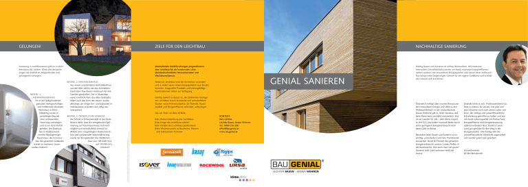 GELUNGEN! ZIELE FÜR DEN LEICHTBAU NACHHALTIGE SANIERUNG Sanierung in Leichtbauweise gibt es in allen Bereichen des Lebens. Diese drei Beispiele zeigen die Vielfalt an Möglichkeiten und gelungenen Lösungen. Internationale Marktforschungen prognostizieren dem Leichtbau für die kommenden Jahre überdurchschnittliche Innovationsraten und Wachstumschancen. Richtig Bauen und Sanieren ist aktiver Klimaschutz. Mit moderner, innovativer Umwelttechnik erzielen wir heute maximale Energieeffizienz, nutzen saubere und erneuerbare Energiequellen und sparen beim Verbrauch. Das bringt einen langfristigen Gewinn für die eigene Geldbörse und schützt die Umwelt und das Klima! GENIAL SANIEREN Moderner Leichtbau wird die Architektur verändern und in vielen neuen Anwendungsgebieten zum Einsatz kommen. Ausgereifte Produkte und leistungsfähige Konstruktionen stehen zur Verfügung. Künftig kommt es darauf an, die zahlreichen Vorzüge des Leichtbaus durch technische und wirtschaftliche Studien sowie Referenzobjekte, die Ästhetik, Raumqualität und Energieeffizienz verbinden, aufzuzeigen. Die vier Ziele von BAU.GENIAL: BEISPIEL 3: ÖFFENTLICHES GEBÄUDE Die Schule in Schwanenstadt ist der beste Beweis dafür, dass die energetische Optimierung auf Passivhausniveau technisch möglich und wirtschaftlich sinnvoll ist. Mittels einer vorgehängten Holzkonstruktion und umfassender Wärmedämmung wurde der Energiebedarf des Stahlbetonbaus von 165 kWh/m2a auf 15 kWh/m2a reduziert. ❙ ❙ ❙ ❙ Fotos: Marcel Hagen/Studio 22, Knauf/M. Possert, privat, Umweltministerium, fotolia.com (Franz Pfluegl, victor zastol'skiy, Florian Villesèche), istockphoto.com/ HarriesAD BEISPIEL 1: MEHRFAMILIENHAUS Ein in der Spätgründerzeit gebautes mehrgeschoßiges und mittlerweile desolates Wohnhaus in Wien Ottakring wurde in zweijähriger Bauzeit einer umfassenden Sanierung unterzogen und so vor dem Verfall gerettet. Der Dachausbau in Holzbauweise erreicht Niedrigenergiehausniveau, der Innenausbau des gesamten Gebäudes wurde im trockenen Innenausbau realisiert. BEISPIEL 2: EINFAMILIENHAUS Aus einem unscheinbaren Einfamilienhaus aus den 60er Jahren hat das Architektenteam Hein-Troy diesen Holztraum für drei Familien geschaffen. Der in Massivbauweise errichtete Kern des alten Gebäudes bildet auch den Kern des neuen, wurde allerdings um einige Um- und Zubauten in Holzbauweise erweitert und völlig neu interpretiert. die Weiterentwicklung des Leichtbaus das Image des Leichtbaus stärken die Vorteile des Leichtbaus positionieren den Wissenstransfer zu Bauherren, Planern und Institutionen forcieren KONTAKT: BAU.GENIAL Leichter Bauen. Besser Wohnen Tel.: 0800 210 208 [email protected] www.baugenial.at Österreich verfügt über enorme Ressourcen bei erneuerbarer Energie und zählt zu den Weltmarktführern in der Umwelttechnik. Dieses Potenzial gilt es, beim Hausbau und beim Renovieren verstärkt einzusetzen. Das ist ein Gewinn für alle – dem Klima erspart es viel CO2 und jedem Haushalt bleibt durch einen geringeren Energieverbrauch mehr bares Geld im Börsel. Besonders beim Bauen und Sanieren ist es wichtig, umzudenken und eine Trendwende einzuleiten. Rund 30 Prozent des gesamten Energieverbrauchs unseres Landes fließen in die Raumwärme. Hier kann man viel sparen. Sanieren statt Geld verheizen heißt die Devise. Deshalb lohnt es sich, ProfessionistInnen zu Rate zu ziehen. Sie wissen, wie jede und jeder Einzelne noch nach Jahren sicher sein kann, die richtige und umweltfreundliche Entscheidung getroffen zu haben und wie sich beste Lebensqualität mit Klimaschutz, Energieeffizienz und Energieeinsparung optimal verbinden lässt. Damit ist unser Land gut gerüstet für den Weg in die Energieautarkie. Gleichzeitig wird die umweltfreundliche Wirtschaft angekurbelt und werden green jobs gesichert. Umweltminister DI Niki Berlakovich GELUNGEN! ZIELE FÜR DEN LEICHTBAU NACHHALTIGE SANIERUNG Sanierung in Leichtbauweise gibt es in allen Bereichen des Lebens. Diese drei Beispiele zeigen die Vielfalt an Möglichkeiten und gelungenen Lösungen. Internationale Marktforschungen prognostizieren dem Leichtbau für die kommenden Jahre überdurchschnittliche Innovationsraten und Wachstumschancen. Richtig Bauen und Sanieren ist aktiver Klimaschutz. Mit moderner, innovativer Umwelttechnik erzielen wir heute maximale Energieeffizienz, nutzen saubere und erneuerbare Energiequellen und sparen beim Verbrauch. Das bringt einen langfristigen Gewinn für die eigene Geldbörse und schützt die Umwelt und das Klima! GENIAL SANIEREN Moderner Leichtbau wird die Architektur verändern und in vielen neuen Anwendungsgebieten zum Einsatz kommen. Ausgereifte Produkte und leistungsfähige Konstruktionen stehen zur Verfügung. Künftig kommt es darauf an, die zahlreichen Vorzüge des Leichtbaus durch technische und wirtschaftliche Studien sowie Referenzobjekte, die Ästhetik, Raumqualität und Energieeffizienz verbinden, aufzuzeigen. Die vier Ziele von BAU.GENIAL: BEISPIEL 3: ÖFFENTLICHES GEBÄUDE Die Schule in Schwanenstadt ist der beste Beweis dafür, dass die energetische Optimierung auf Passivhausniveau technisch möglich und wirtschaftlich sinnvoll ist. Mittels einer vorgehängten Holzkonstruktion und umfassender Wärmedämmung wurde der Energiebedarf des Stahlbetonbaus von 165 kWh/m2a auf 15 kWh/m2a reduziert. ❙ ❙ ❙ ❙ Fotos: Marcel Hagen/Studio 22, Knauf/M. Possert, privat, Umweltministerium, fotolia.com (Franz Pfluegl, victor zastol'skiy, Florian Villesèche), istockphoto.com/ HarriesAD BEISPIEL 1: MEHRFAMILIENHAUS Ein in der Spätgründerzeit gebautes mehrgeschoßiges und mittlerweile desolates Wohnhaus in Wien Ottakring wurde in zweijähriger Bauzeit einer umfassenden Sanierung unterzogen und so vor dem Verfall gerettet. Der Dachausbau in Holzbauweise erreicht Niedrigenergiehausniveau, der Innenausbau des gesamten Gebäudes wurde im trockenen Innenausbau realisiert. BEISPIEL 2: EINFAMILIENHAUS Aus einem unscheinbaren Einfamilienhaus aus den 60er Ja
