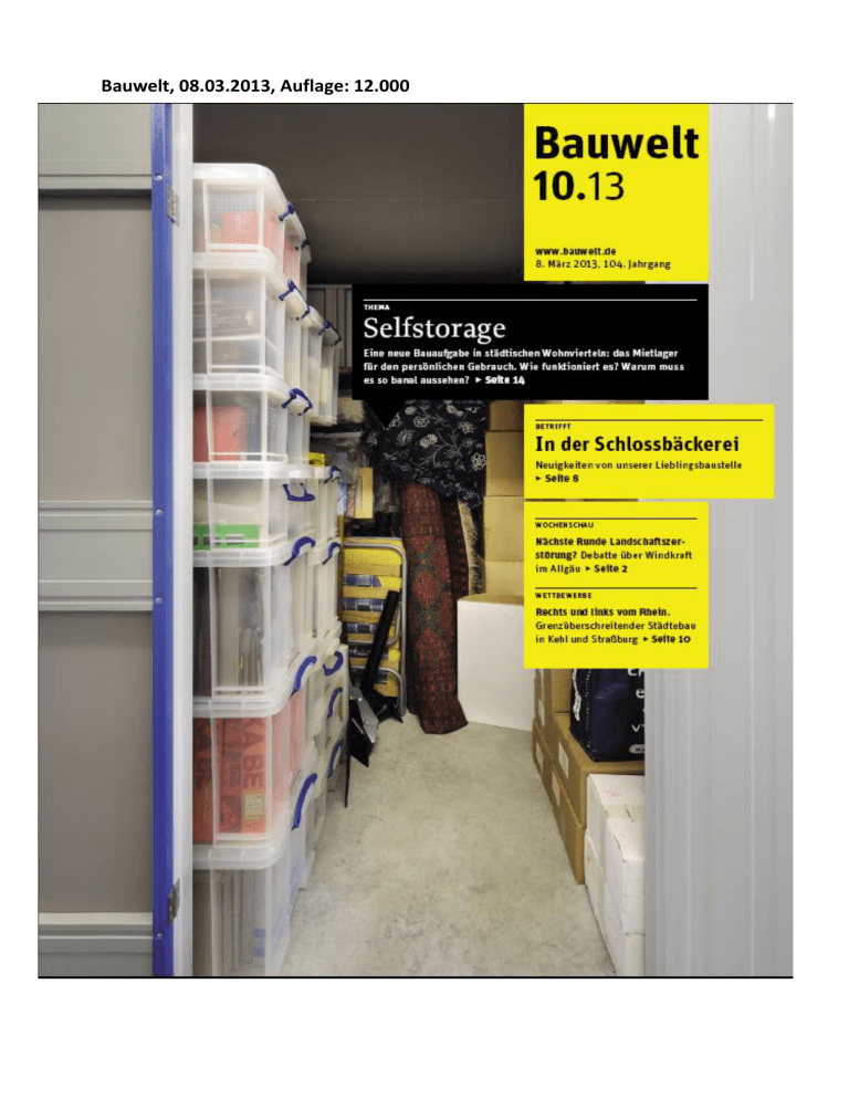 Bauwelt, 08.03.2013, Auflage: 12.000 Bauwelt 10.13 WOCHENsCHau 2 Endlich: eine Debatte über Windenergie und Landschaft Florian Aicher 3 Walid Raad im Louvre. Der libanesische Künstler kommentiert den Museumsbau-Boom in der arabischen Welt | 4 Drucken in 3D. ausstellung im Museum für Gestaltung Zürich .de | Mythos architekturatelier. ausstellung in der architekturgalerie am Weißenhof in stuttgart BEtRifft 8 In der Schlossbäckerei Nils Ballhausen .de WEttBEWERBE 10 Grenzüberschreitend. Cour des Douanes in Straßburg und Zollhofareal in Kehl 12 Europäischer architekturpreis architektur + Energie 2012 Arne Barth tHEMa – sELfstORaGE 14 Editorial Doris Kleilein .de 18 Häuser für Dinge Petra Beck .de 26 Selfstorage – eine erste Typologie Doris Kleilein 28 „Man kann nicht an jedem Ort ein Standardbauprogramm durchziehen“ interview mit andreas Emminger RuBRiKEN 5 wer wo was wann | 7 Leserbriefe | 32 Kalender | 34 stellenanzeigen titel: Lagerabteil, Berlin-Wilmersdorf foto: Philipp Lohöfener, Berlin Redakteurin thementeil: Doris Kleilein abb.: dk Es gibt Räume | die gibt es gar nicht. auf einer Rundreise durch Berliner Mietlager sind Bauwelt-Redakteurin Doris Kleilein und der fotograf Philipp Lohöfener durch sehr viele Gänge gelaufen, sie sind viel aufzug gefahren, haben von fluchttreppenhäusern aus autobahnen inspiziert und mit vielen, durchwegs sehr freundlichen Mitarbeiterinnen gesprochen. Die flächen in selfstorage-Gebäuden werden effizient genutzt, in Berlin-Wilmersdorf (▸ seite 26) tatsächlich bis auf den letzten Zentimeter: auch der große Erker aus Profilglas (im Plan ganz unten) musste mit abteilen gefüllt werden, so dass nur noch ein Gang für den Heizkörper übrig war. am Rande bemerkt: architekten sind, wie auch bei anderen Entwicklungen, hier mal wieder weit vorn. Eine ganze Reihe Berliner Büros nutzt selfstorage, um Modelle einzulagern. so auch David Chipperfield. Mehr dazu auf ▸ www.bauwelt.de Red. BEGA – das gute Licht. Postfach 3160 58689 Menden www.bega.de Aufsatzleuchten mit symmetrischer Lichtstärkeverteilung mit LED oder für Leuchtstofflampen Schutzart IP 65 3000 – 8700 Lumen VORsCHau DiENstaG ONLiNE – 12. MäRZ Bauwelt 11.13 ▸ Bildstrecke: auf der Baustelle in Pamplona ▸ Bildstrecke: Die Marke Bauhaus fREitaG iM HEft – 15. MäRZ ▸ Bildstrecke: Die urbanisierung Monacos ▸ für die forschung 14 Thema Selfstorage Bauwelt 10 | 2013 Bauwelt 10 | 2013 15 Editorial Doris Kleilein Fotos Philipp Lohöfener Selfstorage | Eine neue Bautypologie zwängt sich in die Wohnviertel hiesiger Großstädte: das Mietlager für den persönlichen Gebrauch. An manchen Orten, wie an der Perleberger Brücke in Berlin, wird es zur städtebaulichen Dominante. 40.000 Autos fahren jeden Tag über die Perleberger Brücke, die die Berliner Stadtteile Moabit und Wedding verbindet. Ich fahre mit dem Fahrrad und habe einige hundert Meter Zeit, um über Stadtentwicklung nachzudenken. Der Neubau, der zusehends in die Höhe wuchs, flankiert die Brücke. Links ein Bürohaus, rechts ein Mietlager – so sieht jetzt das Tor nach Moabit aus, in Sichtweite der Hauptbahnhof, zu Füßen eines der größten innerstädtischen Entwicklungsgebiete Berlins, die „Heidestraße/Europacity“. Seit wann haben die Betreiber von Lagerhäusern die Genehmigung, städtebauliche Dominanten in Wohnvierteln zu er­richten? Keine flachen Lagerhallen, sondern sieben Geschosse hoch, mit grundlosen Fenstern und dem Fluchttreppenhaus an der prominentesten Ecke? Oder handelt es sich um eine Ausnahme, um die Speerspitze des dahinter liegenden Gewerbegebiets? Dienstleistung für Großstädter Das Berliner Mietlager ist keine Ausnahme, eher ein Vorgeschmack auf die nahe Zukunft. Selfstorage ist ein Geschäfts- Torbauten nahe des Berliner Hauptbahnhofs: links das „Blaue Haus“, ein Bürogebäude von Jörg Pampe (1996), rechts „MyPlace Selfstorage Berlin Mitte“ von Weickenmeier, Kunz + Partner (2012) modell, das seit einigen Jahren auch in Deutschland Kunden findet – eine Dienstleistung für Großstädter, die nicht wissen, wohin mit ihren Sachen und die bereit sind, dafür Geld zu zahlen: sauber, sicher, videoüberwacht. Selfstorage ist keine Randerscheinung, vielmehr sind für die kommenden Jahre Neubauten in fast allen Städten mit über 200.000 Einwohnern geplant. In Hamburg, München und Berlin gehören sie bereits zum Stadtbild – bevorzugt in Wohngebieten, um die Wege der Kunden kurz zu halten ( ▸ ab Seite 18). Architekturwettbewerb? Kein einziger Bei aller Banalität – Mietlager haben, gerade wenn sie in Wohngebieten geplant werden, auch gewisse Vorteile: Sie verursachen selbst kaum Verkehr und stehen im Gegenzug wie Schallschutzwände an befahrenen Straßen, die Gebäudehöhe ist flexibel. Die Bauherren setzen diese Argumente offensiv bei der Auseinandersetzung mit den lokalen Bauverwaltungen ein, die nicht selten froh sind, Wohngebiete von Verkehrstrassen abschirmen zu können. In Wien, wo der Marktführer MyPlace seinen Firmensitz hat, sind bereits acht der grau-rot-blauen Filialen an strategischen Punkten der Stadt platziert: „In Deutschland gibt es einen sehr starken Einfluss von der Stadt, wie das ausschauen soll. Nicht immer zum Besseren. In Wien 16 Thema Selfstorage Bauwelt 10 | 2013 Bauwelt 10 | 2013 17 Bildunterschrift Zusatzangaben Die Bauaufgabe wird unterschätzt. Warum hat noch niemand das Sammeln, das Lagern zum Thema der Architektur gemacht? ist man freier, dort wird einem gar nicht hinein geredet“, berichtet Geschäftsführer Martin Gerhardus. Die rege Wiener Architekturszene hat Selfstorage bislang nicht zur Kenntnis genommen, schon gar nicht als Bauaufgabe. Resignation? Ein weiterer dekorierter Schuppen in der Masse der Gewerbebauten, die Ausfallstraßen, Bahnstrecken und Autobahnen ohnehin belagern? Unvermeidlich wie der Discounter, das Möbelhaus, das Logistikzentrum? Für die Architekten, die bis heute ausschließlich im Direktauftrag für die Unte