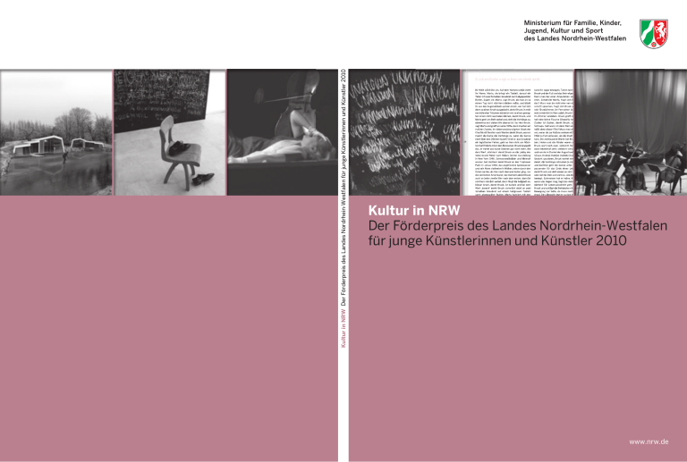 Kultur in NRW Der Förderpreis des Landes Nordrhein-Westfalen für junge Künstlerinnen und Künstler 2010 Bruck am Boden singt so leise wie Monk spielt. Kultur in NRW Der Förderpreis des Landes Nordrhein-Westfalen für junge Künstlerinnen und Künstler 2010 www.nrw.de 1 Kultur in NRW Der Förderpreis des Landes Nordrhein-Westfalen für junge Künstlerinnen und Künstler 2010 Anne Pöhlmann Florian Meisenberg Sandra Trojan Thomas Pletzinger Amaryllis Quartett Michael Langemann Eva-Maria Höckmayr Katja Stockhausen Anna Wahle Mischa Leinkauf Franziska Windisch Jan Hoeft bk2a architektur Sascha Glasl 2 3 5 Vorwort Ute Schäfer Ministerin für Familie, Kinder, Jugend, Kultur und Sport des Landes Nordrhein-Westfalen 7 Die Jury Bildende Kunst 8 Anne Pöhlmann 14 Florian Meisenberg Literatur 20 Sandra Trojan 26 Thomas Pletzinger Musik 32 Amaryllis Quartett 38 Michael Langemann Theater 42 Eva-Maria Höckmayr 48 Katja Stockhausen 90 Film 54 Anna Wahle 60 Mischa Leinkauf Medienkunst 66 Franziska Windisch 72 Jan Hoeft Architektur 78 bk2a architektur 84 Sascha Glasl Impressum 5 4 Als der Förderpreis des Landes Nordrhein-Westfalen für junge Künstlerinnen und Künstler im Jahr 1957 zum ersten Mal vergeben wurde, stand Deutschland am Beginn eines künstlerischen und kulturellen Aufbruchs. Besonders in Nordrhein-Westfalen trafen die Kunst der Moderne und die Gegenwartskunst auf waches Interesse bei Bürgerinnen und Bürgern, Land und Kommunen. So entstand eine vielfältige und lebendige Kulturlandschaft, die offen für Neues und Ungewöhnliches geblieben ist. Treibende Kräfte dieser Entwicklung waren und sind engagierte Künstlerinnen und Künstler. Sie geben sich nicht zufrieden mit dem Vorgefundenen, gehen Risiken ein, wagen sich auf unerforschtes Terrain. Der Förderpreis des Landes Nordrhein-Westfalen soll Ermutigung sein, diesen Weg einzuschlagen, und er ist zugleich Auszeichnung für herausragende künstlerische Leistungen. Viele Trägerinnen und Träger des Förderpreises haben die internationale Kunstwelt nachhaltig verändert und NordrheinWestfalen als Kulturregion bereichert. Den Preisträgerinnen und Preisträgern des Jahres 2010, deren künstlerische Biografien dieser Katalog aufzeigt, gratuliere ich herzlich und wünsche ihnen viel Erfolg für ihr künstlerisches Schaffen. Den Mitgliedern der Jury danke ich für ihr Engagement. Ute Schäfer Ministerin für Familie, Kinder, Jugend, Kultur und Sport des Landes Nordrhein-Westfalen Jury 6 7 Bildende Kunst Dr. Stefanie Kreuzer, Leverkusen Dr. Annelie Pohlen, Bonn Prof. Christopher Williams, Düsseldorf Literatur Prof. Dr. Friedmar Apel, Bielefeld Anne Linsel, Wuppertal Dr. Lothar Schröder, Duisburg Musik Film Dr. Eva Küllmer, Dortmund Prof. Dr. Werner Lohmann, Düsseldorf Prof. Raimund Wippermann, Düsseldorf Dr. Robert von Zahn, Düsseldorf Oliver Baumgarten, Köln Ronald Herzog, Bielefeld Joachim Kühn, Köln Theater Stefan Keim, Wetter Regine Müller, Düsseldorf Melanie Suchy, Frankfurt Medienkunst Georg Elben, Bonn Dr. Doris Krystof, Düsseldorf Dr. Sabine Maria Schmidt, Essen Architektur Prof. Dörte Gatermann, Köln Prof. Ulrich Königs, Köln Prof. Annette Paul, Köln Bildende Kunst Anne Pöhlmann Laudatio In ihren fotografischen Arbeiten und Videoprojekten hinterfragt die 1978 geborene Künstlerin Anne Pöhlmann Architekturen, die sich in ihrer Planungsund Entstehungszeit der 1960er und 1970er Jahre eng mit urbanen und sozialen Utopievorstellungen verbunden haben. Die durchaus in unterschiedlichen ideologischen Systemen real gebauten und an der Wirklichkeit mehr oder weniger erfolgreich „erprobten“ utopischen Visionen oder die „nur“ als Modell oder Bild entworfenen Darstellungen ebensolcher Projekte werden zu zentralen Motiven ihres Bildrepertoires. Ihre fotografischen Untersuchungen utopischer architektonischer Systeme analysieren die historischen Entwürfe aus der Perspektive der Jetztzeit, ohne sie gänzlich als gescheitert, aber auch ohne sie als vollkommen gelungen zu erachten. Als „Utopia Recycling“ hat die Künstlerin dieses Vorgehen bezeichnet, das nicht in der ungebrochenen Fortführungen utopischer Ideen, sondern über das Reflektieren der Kriterien des Geglücktseins oder auch des Scheiterns dieser Projekte im Hier und Jetzt neue Herausforderungen – auch visueller Art – an uns stellt. In diesem Zusammenhang wird Sprache in ihrer visuellen Dimension und metaphorischen Qualität als bildschaffende Kraft Teil des künstlerischen Interesses. Zunächst auf die Schwierigkeit der Beschreibung architektonischer Bilder beschränkt, löst sie sich bald aus diesem Rahmen, um darüber hinaus auf ein weiteres Thema Bezug zu nehmen, das immer mehr die neueren Arbeiten der Künstlerin bestimmt: die Beziehung „Frauen und Fotografie“. 8 Indem Anne Pöhlmann die Fotografie oftmals abseits gewöhnlicher, im Kunstkontext erprobter Bildträger denkt, erweitert sie nicht nur die Möglichkeiten des Mediums sowie des Bildträgers als solchen, sondern schafft dergestalt eine fotografische Präsentations- Revues Installation, 2009 Videoprojektion mit 10 Videostills und schwarzer Satinvorhang Courtesy Galerie Clages form, die notwendigerweise den Raum oder auch das Objekt – wie beispielsweise eine Zeitschrift – als Display der Arbeiten versteht. Auf eine Fensterscheibe aufgebrachte, gewöhnliche Schwarzweißfotokopien, die je nach natürlicher Tageslichtsituation beziehungsweise künstlicher Beleuchtung aus dem Inneren des Raumes die Präsentation in der Fensterscheibe einmal undurchsichtig und dann wieder durchsichtig erscheinen lassen, spielen nicht nur in der Überlagerung zweiter Motive mit dem Sujet des Dargestellten, sondern eindeutig auch mit der Art und Weise des Darstellens, das heißt mit der Spannbreite des Mediums selbst. Direkt auf die Wand geklebte und so mit dem Raum interagierende „Sprachposter“ erweitern den Präsentationsspielraum um die durch Werbemedien erprobte Praxis. Techniken der Recherche vo