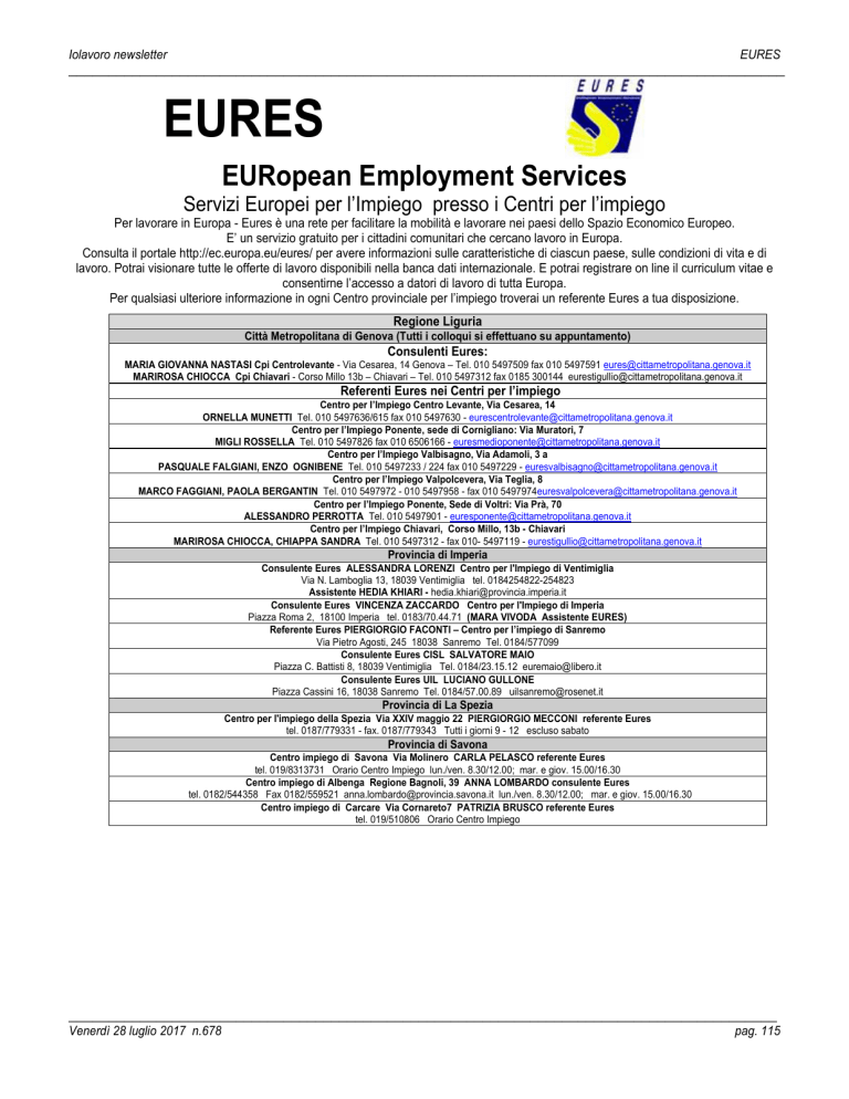 Iolavoro newsletter EURES __________________________________________________________________________________________ EURES EURopean Employment Services Servizi Europei per l’Impiego presso i Centri per l’impiego Per lavorare in Europa - Eures è una rete per facilitare la mobilità e lavorare nei paesi dello Spazio Economico Europeo. E’ un servizio gratuito per i cittadini comunitari che cercano lavoro in Europa. Consulta il portale http://ec.europa.eu/eures/ per avere informazioni sulle caratteristiche di ciascun paese, sulle condizioni di vita e di lavoro. Potrai visionare tutte le offerte di lavoro disponibili nella banca dati internazionale. E potrai registrare on line il curriculum vitae e consentirne l’accesso a datori di lavoro di tutta Europa. Per qualsiasi ulteriore informazione in ogni Centro provinciale per l’impiego troverai un referente Eures a tua disposizione. Regione Liguria Città Metropolitana di Genova (Tutti i colloqui si effettuano su appuntamento) Consulenti Eures: MARIA GIOVANNA NASTASI Cpi Centrolevante - Via Cesarea, 14 Genova – Tel. 010 5497509 fax 010 5497591 [email protected] MARIROSA CHIOCCA Cpi Chiavari - Corso Millo 13b – Chiavari – Tel. 010 5497312 fax 0185 300144 [email protected] Referenti Eures nei Centri per l’impiego Centro per l’Impiego Centro Levante, Via Cesarea, 14 ORNELLA MUNETTI Tel. 010 5497636/615 fax 010 5497630 - [email protected] Centro per l’Impiego Ponente, sede di Cornigliano: Via Muratori, 7 MIGLI ROSSELLA Tel. 010 5497826 fax 010 6506166 - [email protected] Centro per l’Impiego Valbisagno, Via Adamoli, 3 a PASQUALE FALGIANI, ENZO OGNIBENE Tel. 010 5497233 / 224 fax 010 5497229 - [email protected] Centro per l’Impiego Valpolcevera, Via Teglia, 8 MARCO FAGGIANI, PAOLA BERGANTIN Tel. 010 5497972 - 010 5497958 - fax 010 [email protected] Centro per l’Impiego Ponente, Sede di Voltri: Via Prà, 70 ALESSANDRO PERROTTA Tel. 010 5497901 - [email protected] Centro per l’Impiego Chiavari, Corso Millo, 13b - Chiavari MARIROSA CHIOCCA, CHIAPPA SANDRA Tel. 010 5497312 - fax 010- 5497119 - [email protected] Provincia di Imperia Consulente Eures ALESSANDRA LORENZI Centro per l'Impiego di Ventimiglia Via N. Lamboglia 13, 18039 Ventimiglia tel. 0184254822-254823 Assistente HEDIA KHIARI - [email protected] Consulente Eures VINCENZA ZACCARDO Centro per l'Impiego di Imperia Piazza Roma 2, 18100 Imperia tel. 0183/70.44.71 (MARA VIVODA Assistente EURES) Referente Eures PIERGIORGIO FACONTI – Centro per l’impiego di Sanremo Via Pietro Agosti, 245 18038 Sanremo Tel. 0184/577099 Consulente Eures CISL SALVATORE MAIO Piazza C. Battisti 8, 18039 Ventimiglia Tel. 0184/23.15.12 [email protected] Consulente Eures UIL LUCIANO GULLONE Piazza Cassini 16, 18038 Sanremo Tel. 0184/57.00.89 [email protected] Provincia di La Spezia Centro per l'impiego della Spezia Via XXIV maggio 22 PIERGIORGIO MECCONI referente Eures tel. 0187/779331 - fax. 0187/779343 Tutti i giorni 9 - 12 escluso sabato Provincia di Savona Centro impiego di Savona Via Molinero CARLA PELASCO referente Eures tel. 019/8313731 Orario Centro Impiego lun./ven. 8.30/12.00; mar. e giov. 15.00/16.30 Centro impiego di Albenga Regione Bagnoli, 39 ANNA LOMBARDO consulente Eures tel. 0182/544358 Fax 0182/559521 [email protected] lun./ven. 8.30/12.00; mar. e giov. 15.00/16.30 Centro impiego di Carcare Via Cornareto7 PATRIZIA BRUSCO referente Eures tel. 019/510806 Orario Centro Impiego _________________________________________________________________________________________ Venerdì 28 luglio 2017 n.678 pag. 115 Iolavoro newsletter EURES __________________________________________________________________________________________ EURES LIGURIA (Selezione dalla banca dati http://eures.europa.eu/) DA VENTIMIGLIA Tel. 0184 25.48.22 – 25.48.23 REFERENTE: Dr.ssa Alessandra Lorenzi - [email protected] Luogo Lavoro p. durata Qualifica richiesta Requisiti richiesta Note Belgio Bruxelles 1 Permanente Accountant with tempo pieno experience Belgio Bruxelles 1 Permanente tempo pieno Sales person Belgio Bruxelles 1 Permanente tempo pieno Automation engineer Francia Île De France 1 Permanente tempo pieno Infographiste web master Fran Cia France, ProvenceAlpes-Côte D'azur 1 Temporaneo Tempo pieno Factotum Francia France, ProvenceAlpes-Côte D'azur 1 Permanente tempo pieno Maçon / maçonne en rénovation Lussemburg o 1 Permanente tempo pieno Italian editor Lussemburg o 1 Lussemburg o 1 Permanente Finance project Amazon EU Sàrl recherche une ressource en conseil, organisation et ID OFF: tempo pieno management entreprise Compétences requises: SQL - database programming 517562 manager geographic language; Lean Six Sigma". Français et Anglais expansion Permanente Web Amazon Services Europe, Sàrl recherché un software, développeur ID OFF: tempo pieno development application et analyste- programmeur Compétences requises: SQL - database 517485 engineer programming language; Photoshop (logiciel); Linux (système IT); Java (langage de programmation); Illustrator (logiciel)". Anglais exigé et Français bon A company is looking for an Expert in Human Resources in the Bank, ID OFF. Insurance and Accounting sectors, Perform and Review processes that 56314509 required specific accounting skills as the VAT treatments, corporate tax, fixed assets, develop a rapid knowledge of the accounting set-up and processes, Ensures GAAP, CAP and SOX controls are effective, accurate and appropriate for several entities. Bachelor in accounting or equivalent diploma + Experience. Required English/French or English/Dutch. Italian is a plus. A High chocolade store is looking for a salesperson to work fulltime on ID OFF. Saturdays, Sundays and on public holidays. You are responsible to Opening 56313100 and / or closing of the boutique, Reception of customers Present chocolate to customers for tastings, Advise and sell the products Cash register and correct checkout, Handling supplies and processing. French English + additiona