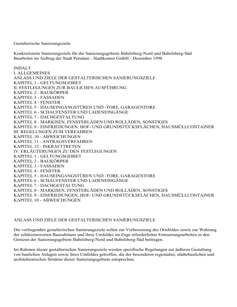 Gestalterische Sanierungsziele Konkretisierte Sanierungsziele für die Sanierungsgebiete Babelsberg-Nord und Babelsberg-Süd Bearbeitet im Auftrag der Stadt Potsdam - Stadtkontor GmbH - Dezember 1998 INHALT I. ALLGEMEINES ANLASS UND ZIELE DER GESTALTERISCHEN SANIERUNGSZIELE KAPITEL 1 - GELTUNGSGEBIET II. FESTLEGUNGEN ZUR BAULICHEN AUSFÜHRUNG KAPITEL 2 - BAUKÖRPER KAPITEL 3 - FASSADEN KAPITEL 4 - FENSTER KAPITEL 5 - HAUSEINGANGSTÜREN UND -TORE, GARAGENTORE KAPITEL 6 - SCHAUFENSTER UND LADENEINGÄNGE KAPITEL 7 - DACHGESTALTUNG KAPITEL 8 - MARKISEN, FENSTERLÄDEN UND ROLLÄDEN, SONSTIGES KAPITEL 9 - EINFRIEDUNGEN, HOF- UND GRUNDSTÜCKSFLÄCHEN, HAUSMÜLLCONTAINER III. REGELUNGEN ZUM VERFAHREN KAPITEL 10 - ABWEICHUNGEN KAPITEL 11 - ANTRAGSVERFAHREN KAPITEL 12 - INKRAFTTRETEN IV. ERLÄUTERUNGEN ZU DEN FESTLEGUNGEN KAPITEL 1 - GELTUNGSGEBIET KAPITEL 2 - BAUKÖRPER KAPITEL 3 - FASSADEN KAPITEL 4 - FENSTER KAPITEL 5 - HAUSEINGANGSTÜREN UND -TORE, GARAGENTORE KAPITEL 6 - SCHAUFENSTER UND LADENEINGÄNGE KAPITEL 7 - DACHGESTALTUNG KAPITEL 8 - MARKISEN, FENSTERLÄDEN UND ROLLÄDEN, SONSTIGES KAPITEL 9 - EINFRIEDUNGEN, HOF- UND GRUNDSTÜCKSFLÄCHEN, HAUSMÜLLCONTAINER KAPITEL 10 - ABWEICHUNGEN ANLASS UND ZIELE DER GESTALTERISCHEN SANIERUNGSZIELE Die vorliegenden gestalterischen Sanierungsziele sollen zur Verbesserung des Ortsbildes sowie zur Wahrung der schützenswerten Bausubstanz und ihres Umfeldes im Zuge erforderlicher Erneuerungsarbeiten in den Grenzen der Sanierungsgebiete Babelsberg-Nord und Babelsberg-Süd beitragen. Im Rahmen dieser gestalterischen Sanierungsziele werden spezifische Regelungen zur äußeren Gestaltung von baulichen Anlagen sowie ihres Umfeldes getroffen, die der besonderen regionalen, städtebaulichen und architektonischen Struktur dieser Sanierungsgebiete entsprechen. ANLASS Die bislang noch nicht präzise ausformulierten Sanierungsziele zur äußeren Gestaltung von baulichen Anlagen haben sowohl bei Bauherren als auch Architekten häufig zu Unsicherheiten geführt. Zur Behebung der vorhandenen Mängel im Stadtbild und zur Wahrung der schützenswerten Bausubstanz und ihres Umfeldes sollen die gestalterischen Sanierungsziele als eine Hilfestellung für eine qualifizierte Projektberatung und für ein zügiges Genehmigungsverfahren dienen. Dies ermöglicht dann auch eine beschleunigte Bearbeitung von Bauanträgen. ZIELE Die Sanierungsgebiete Babelsberg-Nord und Babelsberg-Süd befinden sich innerhalb der Geltungsbereiche der Erhaltungssatzungen Babelsberg-Nord/ Weberviertel und Babelsberg-Süd/Neuendorfer Anger, die seit dem 21.08.1992 gelten. Diese gestalterischen Sanierungsziele sind auch als Konkretisierung dieser Erhaltungssatzungen anzusehen. Sie setzen sich zum Ziel, daß • • • durch Festlegungen zur äußeren Gestalt von baulichen Anlagen das Ortsbild, welches durch die historisch wertvolle Bausubstanz bestimmt wird, gepflegt und entwickelt werden kann, die Erhaltung der städtebaulichen und gestalterischen Eigenart des Stadtbildes gewährleistet wird, der Grundsatz vertieft wird, daß Erhalten vor Wiederherstellen und Wiederherstellen vor Ersetzen von baulichen Anlagen und Bauteilen geht. Die gestalterischen Sanierungsziele legen die Rahmenbedingungen für die äußere Gestaltung sämtlicher auf den Grundstücken befindlicher, baulicher Anlagen im Sinne einer gezielten Stadtbildpflege und einer behutsamen Stadterneuerung fest. Hierzu wird in den Festlegungen die Spezifik der örtlichen Gegebenheiten berücksichtigt, um das Erscheinungsbild der historisch gewachsenen Stadt zu verbessern und gleichzeitig eine Maßgabe für strukturelle Veränderungen zu geben. Dem Anspruch an Erhalt der Bausubstanz wie auch an zeitgemäßes Bauen soll mit diesen gestalterischen Sanierungszielen dadurch entsprochen werden, daß nicht nur die Bewahrung von Wertvollem und die Verhinderung von Verunstaltungen erreicht wird, sondern auch die architektonische Entwicklung mit den Merkmalen unserer Zeit als Weiterentwicklung der bestehenden Strukturen ermöglicht wird. DENKMALSCHUTZ Der in den gestalterischen Sanierungszielen bezeichnete Geltungsbereich A entspricht nahezu dem Denkmalbereich mit zahlreichen Einzeldenkmalen. Einzeldenkmale finden sich vereinzelt ebenso in den Geltungsbereichen B und C. In der „Liste der Einzeldenkmale und Denkmalbereiche zum Verzeichnis der Denkmale der Stadt Potsdam vom 30.04.1993“ sowie im „Verzeichnis der eingetragenen Denkmale der Stadt Potsdam vom 21.08.1991“ sind alle Denkmale veröffentlicht. Das Denkmalschutzgesetz des Landes Brandenburg (DSchG Bbg) und die o.g. Listen können im Amt für Denkmalpflege eingesehen werden und sind als Sonderdruck erhältlich. Die vorliegenden gestalterischen Sanierungsziele ersetzen in ihrem Geltungsbereich nicht das Denkmalschutzgesetz des Landes Brandenburg. Nach § 15 Denkmalschutzgesetz des Landes Brandenburg besteht für alle Veränderungsmaßnahmen an Denkmalen und Gebäuden in Denkmalbereichen ein Erlaubnisvorbehalt durch die zuständige Denkmalbehörde. Grundsätzlich ist der Denkmaleigentümer nach § 15 des DSchG Bbg verpflichtet, vor Beginn der Bau- und Reparaturarbeiten von der Denkmalbehörde der Stadt Potsdam eine denkmalrechtliche Erlaubnis zu beantragen. Unter Reparaturarbeiten sind auch sämtliche farbliche Veränderungen an Putz, Fenstern, Türen, Zäunen und weiteren offen sichtbaren Bauteilen zu verstehen. Auch hierfür ist eine denkmalrechtliche Erlaubnis vor Beginn der Maßnahmen bei der Stadtverwaltung Potsdam, Amt für Denkmalpflege, Lindenstraße 54, 14467 Potsdam einzuholen. Abweichungen von den Festlegungen der gestalterischen Sanierungsziele gemäß Kapitel 10 aufgrund von Forderungen des Amtes für Denkmalpflege sind zulässig. BAUORDNUNG Die vorliegenden gestalterischen Sanierungsziele ersetzen in ihrem Geltungsbereich nicht die Brandenburgische Bauordnung (BbgBO). Die Einhaltung der gesetzlichen Vorgaben der BbgBO bleibt unberührt. Im Folgenden wird auf einige Punkte hingewi