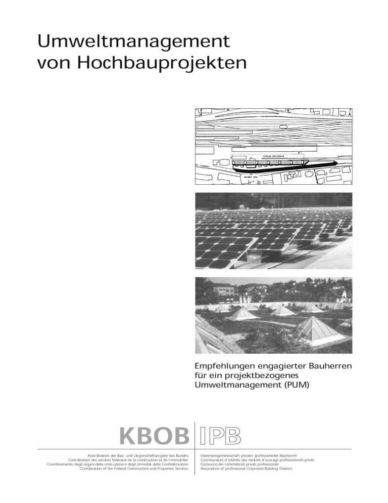 Umweltmanagement von Hochbauprojekten Empfehlungen engagierter Bauherren für ein projektbezogenes Umweltmanagement (PUM) KBOB IPB Koordination der Bau- und Liegenschaftsorgane des Bundes Coordination des services fédéraux de la construction et de l’immobilier Coordinamento degli organi della costruzione e degli immobili della Confederazione Coordination of the Federal Construction and Properties Services Interessengemeinschaft privater professioneller Bauherren Communauté d’intérêts des maîtres d’ouvrage professionnels privés Consorzio dei committenti privati professionali Association of professional Corporate Building Owners Einleitung Dieses Dokument soll engagierten Auftraggebern und Projektteams helfen, die Verantwortung für nachhaltiges Bauen in der Projektbearbeitung und -realisierung wahrzunehmen. Den Benützern und Betreibern von Gebäuden soll es ermöglichen, die Umweltbelastung und die Kosten der Gebäudenutzung zu senken, sowie eine hohe Arbeitsplatzqualität zu erreichen. Die Herausforderung Zielsetzung und Nutzen In Zukunft werden die Umweltbelange im Rahmen einer umfassenden Berücksichtigung der Nachhaltigkeit (vgl. Nachhaltige Entwicklung der gestaltbaren Umwelt, Seite 24, Werkzeugkasten) in die Planung und Realisierung von Bauvorhaben sowie die Bewirtschaftung von Gebäuden einfliessen. Während Ökologie heute im Bauwesen als Qualitätsstandard anerkannt ist und Kriterien für die Wirtschaftlichkeit vorliegen, sind die gesellschaftlichen Belange noch weniger präzis umrissen. Das projektbezogene Umweltmanagement (PUM) leistet einen wichtigen Beitrag zur Erreichung dieser ambitiösen Zielsetzung. Es steht in enger Beziehung zum projektbezogenen Qualitätsmanagement (PQM) und ist ein Bestandteil des Projektmanagements. Ein gutes Projektmanagement ist eine unabdingbare Voraussetzung für nachhaltiges Bauen. Das UmweltmanageUmweltment bringt verschieentlastung dene Vorteile: Die UmProjektmanagement weltbelastung wird durch die reduzierten WirtschaftEnergie- und Stoffflüslichkeit se wesentlich gesenkt. UmweltDie Wirtschaftlichkeit Qualitätsmanagement management Bauprojekte der Erstellung und des PQM Betriebes wird verbesPUM Innovation sert. Das Umweltmanagement fördert die Innovation und erlaubt Kommunies, die nachhaltige Baukation qualität zu kommunizieren. Das vorliegende Dokument richtet sich an das ganze Projektteam, bestehend aus den Vertretern des Auftraggebers, der Benutzer und Betreiber sowie den externen Planern. Die nachhaltige Bauweise ist von allen Beteiligten gemeinsam umzusetzen. Dabei kommt dem Auftraggeber eine Schlüsselrolle zu, da er die Zielsetzung vorgibt. Die Verantwortung für deren Durchsetzung liegt beim Bauprojektleiter. Von der Ökologie zur Nachhaltigkeit Nachhaltiges Bauen als Management-Aufgabe Nutzen des projektbezogenen Umweltmanagements (PUM) Nachhaltigkeit als Bestandteil der teamorientierten Planung Gültigkeit und Verwendung Mit dem vorliegenden Dokument werden die bisherigen Erfahrungen im Umweltmanagement von Hochbauprojekten zusammengefasst und einem breiteren Kreis zugänglich gemacht. Es stellt ein praktisches Hilfsmittel dar, das für alle Hochbauprojekte (Neubauten und Erneuerung) gültig ist. Das Dokument soll als Grundlage für die Erstellung von Projektpflichtenheften und als Checkliste für das Projektteam verwendet werden. Es stellt zudem eine Basis dar für den Erfahrungsaustausch und die Weiterbildung aller Beteiligten. Dadurch sollen eine laufende Verbesserung der ökologischen Bauqualität und eine wirtschaftliche Bauweise erreicht werden. 2 Gültig für alle Hochbauprojekte Verwendung 3. Ausgabe März 2000 • KBOB • IPB Inhaltsübersicht Zielsetzung für nachhaltiges Bauen Seite Zusätzlich zu den Umweltbelangen sind wirtschaftliche und gesellschaftliche Kriterien unabdingbare Bestandteile einer nachhaltigen Bauweise. Die aufgeführten Kriterien für nachhaltiges Bauen sind die Basis für die Beurteilung von Hochbauprojekten. Die Umsetzung und, soweit möglich, die Quantifizierung erfolgen während des Projektablaufes. Umwelt Wirtschaft Gesellschaft 4, 5 4 5 Projektablauf Für jede Projektphase gemäss dem SIA Leistungsmodell (vgl. Werkzeugkasten) werden die Kernfragen des nachhaltigen Bauens sowie die konkreten Schritte zu den folgenden Aufgaben formuliert: 1 Abklärungen mit Auftraggeber bzw. mit Benutzer/Betreiber 2 Aufträge an das Planungsteam 3 Kontrolle der Ergebnisse Autraggeber 1 Projektleiter und Fachingenieur 2 4 3 Betreiber Benutzer Planungsteam extern Strategische Planung Vorstudien Vorprojekt Bauprojekt Ausschreibung Ausführungsplanung/ Ausführung Inbetriebsetzung / Abschluss Bewirtschaftung 6 8 10 12 14 16 18 20 4 Entscheide des Auftraggebers Dadurch wird die phasengerechte Prüfung der entsprechenden Fragen vorgezeichnet: in frühen Projektierungsphasen in Form von Grundsatzfragen, später in höherem Detaillierungsgrad. Durch die frühzeitigen Weichenstellungen werden Fehlentscheide verhindert. In den einzelnen Projektphasen werden die für nachhaltiges Bauen relevanten Aufgaben des Qualitätsmanagements aufgeführt und auf die wichtigsten Instrumente für nachhaltiges Bauen hingewiesen. Instrumente Die systematische Projektdokumentation schafft als Führungsinstrument die für Planung und Projektabwicklung notwendige Transparenz für alle Beteiligten. Zudem bildet sie die Basis für die nachhaltige Bewirtschaftung. Im Werkzeugkasten sind die wichtigsten Instrumente für die Planer aufgeführt. Für die übrigen Beteiligten soll die Übersicht eine Hilfe bei der Erteilung von Aufträgen sowie für die Kontrolle der Ergebnisse sein. Projektdokumentation 22 Werkzeugkasten 24 Institutionen / Bezugsquellen Impressum 26 Adressen Für die im Werkzeugkasten aufgeführten Instrumente sind die Bezugsquellen angegeben. Bei den Herausgebern und Verfassern sind die Kontaktstellen für das Umweltmanagement von Hochbauprojekten aufgeführt. 3. Ausgabe März 2000 • KBOB • IPB 28 3 Zielsetzung