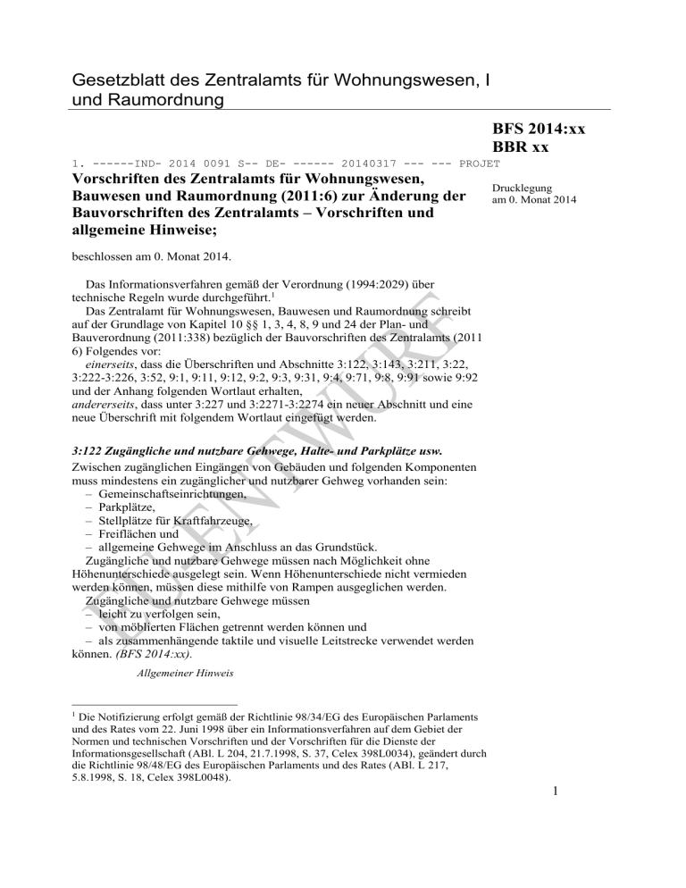 Gesetzblatt des Zentralamts für Wohnungswesen, Bauwesen und Raumordnung BFS 2014:xx BBR xx 1. ------IND- 2014 0091 S-- DE- ------ 20140317 --- --- PROJET Vorschriften des Zentralamts für Wohnungswesen, Bauwesen und Raumordnung (2011:6) zur Änderung der Bauvorschriften des Zentralamts – Vorschriften und allgemeine Hinweise; Drucklegung am 0. Monat 2014 beschlossen am 0. Monat 2014. Das Informationsverfahren gemäß der Verordnung (1994:2029) über technische Regeln wurde durchgeführt.1 Das Zentralamt für Wohnungswesen, Bauwesen und Raumordnung schreibt auf der Grundlage von Kapitel 10 §§ 1, 3, 4, 8, 9 und 24 der Plan- und Bauverordnung (2011:338) bezüglich der Bauvorschriften des Zentralamts (2011 6) Folgendes vor: einerseits, dass die Überschriften und Abschnitte 3:122, 3:143, 3:211, 3:22, 3:222-3:226, 3:52, 9:1, 9:11, 9:12, 9:2, 9:3, 9:31, 9:4, 9:71, 9:8, 9:91 sowie 9:92 und der Anhang folgenden Wortlaut erhalten, andererseits, dass unter 3:227 und 3:2271-3:2274 ein neuer Abschnitt und eine neue Überschrift mit folgendem Wortlaut eingefügt werden. 3:122 Zugängliche und nutzbare Gehwege, Halte- und Parkplätze usw. Zwischen zugänglichen Eingängen von Gebäuden und folgenden Komponenten muss mindestens ein zugänglicher und nutzbarer Gehweg vorhanden sein: – Gemeinschaftseinrichtungen, – Parkplätze, – Stellplätze für Kraftfahrzeuge, – Freiflächen und – allgemeine Gehwege im Anschluss an das Grundstück. Zugängliche und nutzbare Gehwege müssen nach Möglichkeit ohne Höhenunterschiede ausgelegt sein. Wenn Höhenunterschiede nicht vermieden werden können, müssen diese mithilfe von Rampen ausgeglichen werden. Zugängliche und nutzbare Gehwege müssen – leicht zu verfolgen sein, – von möblierten Flächen getrennt werden können und – als zusammenhängende taktile und visuelle Leitstrecke verwendet werden können. (BFS 2014:xx). Allgemeiner Hinweis Die Notifizierung erfolgt gemäß der Richtlinie 98/34/EG des Europäischen Parlaments und des Rates vom 22. Juni 1998 über ein Informationsverfahren auf dem Gebiet der Normen und technischen Vorschriften und der Vorschriften für die Dienste der Informationsgesellschaft (ABl. L 204, 21.7.1998, S. 37, Celex 398L0034), geändert durch die Richtlinie 98/48/EG des Europäischen Parlaments und des Rates (ABl. L 217, 5.8.1998, S. 18, Celex 398L0048). 1 1 BFS 2014:xx BBR xx Bei Freiflächen kann es sich zum Beispiel um Spielplätze, Ballspielfelder und gemeinsame Außenplätze handeln. Ein zugänglicher und nutzbarer Gehweg muss – so waagerecht wie möglich sein, – höchstens eine Neigung von 1:50 in seitlicher Richtung aufweisen, – eine lichte Breite von mindestens 1,5 Metern oder mindestens 1,0 Metern mit Wendebereichen in einem Abstand von höchstens 10 Metern aufweisen, – an Durchgängen in beispielsweise Zäunen, Hecken und dergleichen eine lichte Breite von mindestens 0,90 Metern aufweisen, – frei von Hindernissen sein und – einen eventuellen Höhenunterschied an Übergängen zwischen verschiedenen Arten von Gehflächen und Plätzen über eine 0,9-1,0 Meter breite Rampe ausgleichen. Natürliche Leitflächen wie Grasstreifen, Mauern, Zäune, Kanten und Fassaden können durch künstliche Leitflächen zu einer zusammenhängenden Leitstrecke ergänzt werden. Feste Sitzplätze mit Rücken- und Armlehne an zugänglichen und nutzbaren Gehwegen und Eingängen erhöhen die Zugänglichkeit und Nutzbarkeit für Personen mit eingeschränktem Bewegungsvermögen. Vorschriften zu Kontrasten und Markierungen auf Grundstücken sind Abschnitt 3:1223 und Vorschriften zu zugänglichen und nutzbaren Eingängen sind Abschnitt 3:132 zu entnehmen. Es muss ein Stellplatz für Kraftfahrzeuge vorhanden sein, und in einem Gehabstand von 25 Metern von einem zugänglichen und nutzbaren Eingang zu öffentlich zugänglichen Räumen, Arbeitsräumen und Wohnhäusern müssen nach Bedarf Behindertenparkplätze vorgesehen werden können. Der Bodenbelag derartiger Stellplätze muss fest, eben und rutschfest sein. (BFS 2014:xx). Allgemeiner Hinweis Die Anzahl der Behindertenparkplätze sollte unter Berücksichtigung der vorgesehenen Nutzung oder der Anzahl der Wohnungen und des langfristigen Bedarfs festgelegt werden. Die Breite eines Parkplatzes, auf dem ein Rollstuhl von der Seite ins Fahrzeug geholt werden kann, sollte 5,0 Meter betragen. Die Breite kann verringert werden, wenn die daneben liegende Gehfläche genutzt werden kann oder wenn sich mehrere Behindertenparkplätze nebeneinander befinden. Das Neigungsverhältnis von Stellplätzen und Behindertenparkplätzen darf in Längsrichtung und seitlicher Richtung 1:50 nicht überschreiten. Behindertenparkplätze sollten auch im Winter deutlich beschildert sein. (BFS 2014:xx). 3:143 Türen und Tore Zugängliche und nutzbare Türen und Tore sind so auszulegen, dass sie mit einem Rollstuhl durchfahren werden können, und dass ausreichend Platz vorhanden ist, sodass die Tür oder das Tor vom Rollstuhl aus geöffnet und geschlossen werden kann. Auch andere Öffnungen auf Fluchtwegen sind so auszulegen, dass sie mit einem Rollstuhl durchfahren werden können. Zugängliche und nutzbare Türen und Tore sind so auszulegen, dass sie von Personen mit eingeschränktem Bewegungsvermögen leicht geöffnet werden können. Klinken, Betätigungsvorrichtungen und Schlösser sind so zu platzieren und auszulegen, dass sie sowohl von Personen mit eingeschränktem Bewegungsvermögen als auch von Personen mit eingeschränktem Orientierungsvermögen genutzt werden können. 2 BFS 2014:xx BBR xx Drehtüren müssen durch eine Tür ergänzt werden, die von Personen mit eingeschränktem Bewegungs- oder Orientierungsvermögen genutzt werden kann. (BFS 2013:14). Allgemeiner Hinweis Für folgende Türen muss das lichte Durchgangsmaß mindestens 0,80 Meter bei einer Öffnung um 90° betragen: a) Eingangstüren, b) Aufzugtüren, c) Flurtüren, die rechtwinklig zur Längsrichtung des Flurs angeordnet sind, d) Öffnun