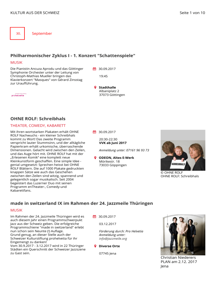 KULTUR AUS DER SCHWEIZ 30. Seite 1 von 10 September Philharmonischer Zyklus I - 1. Konzert "Schattenspiele" MUSIK Die Pianistin Ancuza Aprodu und das Göttinger Symphonie Orchester unter der Leitung von Christoph-Mathias Mueller bringen das Klavierkonzert "Masques" von Gérard Zinsstag zur Uraufführung. 30.09.2017 19:45 Stadthalle Albaniplatz 2 37073 Göttingen OHNE ROLF: Schreibhals THEATER, COMEDY, KABARETT Mit ihren wortstarken Plakaten erhält OHNE ROLF Nachwuchs - ein kleiner Schreibhals kommt zu Wort! Das zweite Programm verspricht lauter Stummsinn, und der alltägliche Papierkram erhält urkomische, überraschende Dimensionen. Gelacht wird zwischen den Zeilen, und das Auge hört mit. OHNE ROLF hat mit der „Erlesenen Komik“ eine komplett neue Kleinkunstform geschaffen. Eine simple Idee genial umgesetzt: Sprechen heisst bei OHNE ROLF Blättern. Die auf 1000 Plakate gedruckten knappen Sätze wie auch das Geschehen zwischen den Zeilen sind witzig, spannend und gelegentlich sogar musikalisch. Seit 2004 begeistert das Luzerner Duo mit seinen Programm enTheater-, Comedy-und Kabarettfans. 30.09.2017 20:30-22:30 VVK ab Juni 2017 Anmeldung unter: 07161 96 93 73 ODEON, Altes E-Werk Mörikestr. 18 73033 Göppingen © OHNE ROLF OHNE ROLF: Schreibhals made in switzerland IX im Rahmen der 24. Jazzmeile Thüringen MUSIK Im Rahmen der 24. Jazzmeile Thüringen wird es auch diesem Jahr einen Programmschwerpukt Jazz aus der Schweiz geben. Die erfolgreiche Programmschiene "made in switzerland" erlebt nun schon sein Neunte (!) Auflage. Grund genug, an dieser Stelle auch der Schweizer Kulturstiftung prohelvetia für ihr Eingemengt zu danken! Vom 30.9.2017 - 3.12.2017 wird in 22 Thüringer Städten ein Querschnitt der Schweizer Jazzszene zu Gast sein. 30.09.2017 03.12.2017 Förderung durch: Pro Helvetia Anmeldung unter: [email protected] Diverse Orte 07745 Jena Christian Niederers PLAN am 2.12. 2017 Jena KULTUR AUS DER SCHWEIZ 28. Seite 2 von 10 September Extase, Regie: Zino Wey THEATER EXTASE macht sich anhand subjektiver und musikalischer Motive auf die Suche nach der verlorenen Ekstase in unserer heutigen Gesellschaft. Zusammen mit einem mehrsprachigen Ensemble aus PerformerInnen und MusikerInnen unternehmen Moira Gilliéron, Ariane Koch und Zino Wey eine Exkursion in den exzessiven Zustand und die verlorene Sinnlichkeit: Eine prophetisch-musikalische Auseinandersetzung mit der Philosophie des Augenblicks und seiner möglichen Historie, und dem Dirigat als ekstatisches Forschungszentrum. Mit: Léonard Bertholet, Thorbjörn Björnsson, Ildiko Ludwig, Eleni Vergeti und Bärbel Schwarz Regie: Zino Wey Text: Ariane Koch Eine Produktion von les artistes dépressifs. In Koproduktion mit der Kaserne Basel, dem Theater Winkelwiese Zürich und dem Ballhaus Ost Berlin. Gefördert durch: Senat Berlin, Fachausschuss Tanz & Theater Basel-Stadt & Basel-Landschaft, Pro Helvetia - Schweizer Kulturstiftung Fondation Nestlé pour l’art, Wilhelm und Ida Hertner-Strasser Stiftung, Ruth und Paul Wallach Stiftung sowie weiteren GönnerInnen. 28.09.2017 05.10.2017 Förderung durch: Pro Helvetia Ballhaus Ost Pappelallee / 15 10437 Berlin www.ballhausost.de/ 9. September Farewell Photography, Biennale für aktuelle Fotografie VISUELLE KUNST, FOTOGRAFIE KULTUR AUS DER SCHWEIZ Die Welt der Bilder erlebt einen rasanten Umbruch. Fotografie ist heute allgegenwärtig und in ständiger Verwandlung. War sie einst ein physisches Objekt, ist sie heute Datensatz, tausendfach geteilt und wieder gelöscht. Sie ist Medium demokratischer Artikulation und Teilhabe, aber auch der Propaganda und kommerzieller Vereinnahmung. Wie reagiert die Kunst auf diese vielen Gesichter der Fotografie? Dieser Umbruch ist auch eine grosse Chance, die Fotografie einer kritischen Betrachtung zu unterziehen und sie neu zu definieren. Schweizer Beitrag: F & D Cartier, Stefan Karrer, Marc Lee Seite 3 von 10 09.09.2017 05.11.2017 Diverse Orte 67059 Ludwigshafen Logo Biennale für aktuelle Fotografie www.biennalefotografie.de Farewell Photography, Biennale für aktuelle Fotografie VISUELLE KUNST, FOTOGRAFIE Die Welt der Bilder erlebt einen rasanten Umbruch. Fotografie ist heute allgegenwärtig und in ständiger Verwandlung. War sie einst ein physisches Objekt, ist sie heute Datensatz, tausendfach geteilt und wieder gelöscht. Sie ist Medium demokratischer Artikulation und Teilhabe, aber auch der Propaganda und kommerzieller Vereinnahmung. Wie reagiert die Kunst auf diese vielen Gesichter der Fotografie? Dieser Umbruch ist auch eine grosse Chance, die Fotografie einer kritischen Betrachtung zu unterziehen und sie neu zu definieren. Schweizer Beitrag: F & D Cartier, Stefan Karrer, Marc Lee 09.09.2017 05.11.2017 Diverse Orte 68159 Mannheim www.biennalefotografie.de Farewell Photography, Biennale für aktuelle Fotografie VISUELLE KUNST, FOTOGRAFIE Logo Biennale für aktuelle Fotografie KULTUR AUS DER SCHWEIZ Die Welt der Bilder erlebt einen rasanten Umbruch. Fotografie ist heute allgegenwärtig und in ständiger Verwandlung. War sie einst ein physisches Objekt, ist sie heute Datensatz, tausendfach geteilt und wieder gelöscht. Sie ist Medium demokratischer Artikulation und Teilhabe, aber auch der Propaganda und kommerzieller Vereinnahmung. Wie reagiert die Kunst auf diese vielen Gesichter der Fotografie? Dieser Umbruch ist auch eine grosse Chance, die Fotografie einer kritischen Betrachtung zu unterziehen und sie neu zu definieren. Schweizer Beitrag: F & D Cartier, Stefan Karrer, Marc Lee Seite 4 von 10 09.09.2017 05.11.2017 Diverse Orte 69115 Heidelberg Logo Biennale für aktuelle Fotografie www.biennalefotografie.de 8. September Ferdinand Hodler und die frühe Moderne VISUELLE KUNST Ferdinand Hodler (1853–1918) zählt zu den bedeutendsten und erfolgreichsten Schweizer Künstlern des frühen 20. Jahrhunderts. Innerhalb des Symbolismus und des Jugendstils, zu deren wichtigsten Vertretern er neben Edvard Munch und Gustav Klimt gehört, entwickelte er einen unve