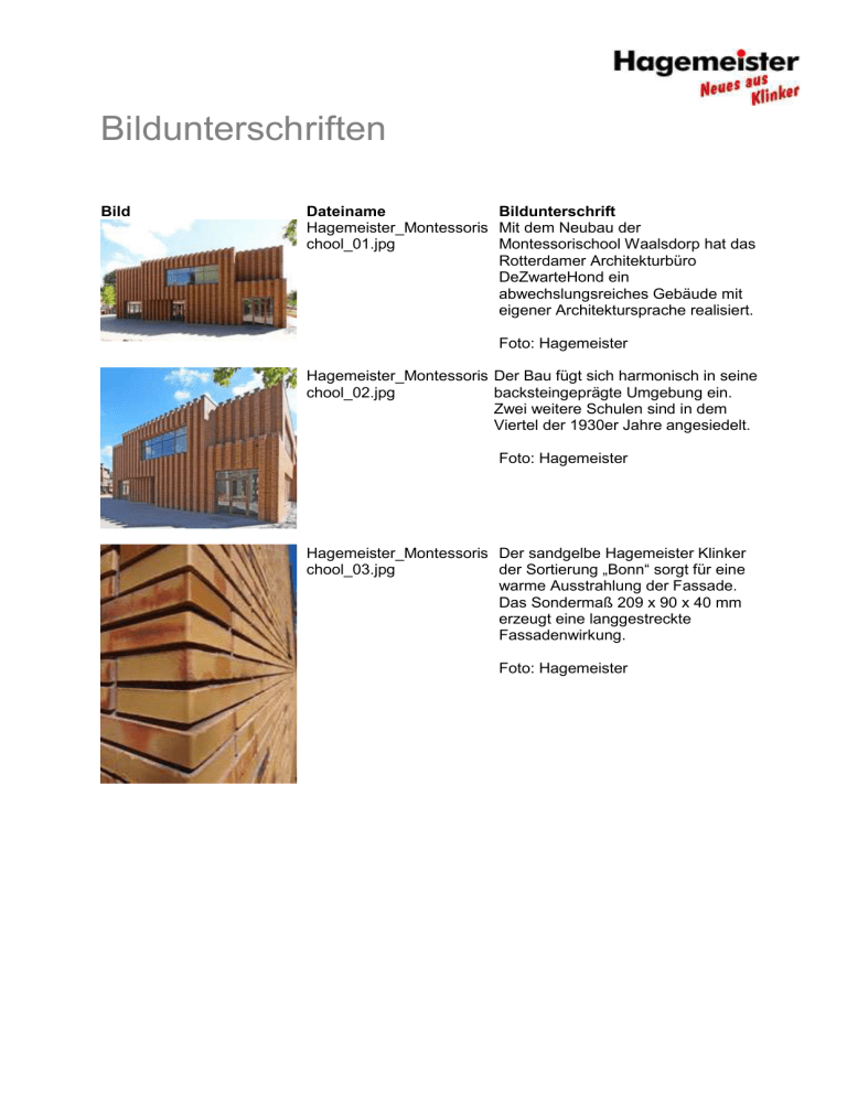 Bildunterschriften Bild Dateiname Bildunterschrift Hagemeister_Montessoris Mit dem Neubau der chool_01.jpg Montessorischool Waalsdorp hat das Rotterdamer Architekturbüro DeZwarteHond ein abwechslungsreiches Gebäude mit eigener Architektursprache realisiert. Foto: Hagemeister Hagemeister_Montessoris Der Bau fügt sich harmonisch in seine chool_02.jpg backsteingeprägte Umgebung ein. Zwei weitere Schulen sind in dem Viertel der 1930er Jahre angesiedelt. Foto: Hagemeister Hagemeister_Montessoris Der sandgelbe Hagemeister Klinker chool_03.jpg der Sortierung „Bonn“ sorgt für eine warme Ausstrahlung der Fassade. Das Sondermaß 209 x 90 x 40 mm erzeugt eine langgestreckte Fassadenwirkung. Foto: Hagemeister Bildunterschriften Hagemeister_Montessorisc Die Stirnseite des Gebäudes nimmt hool_04.jpg Strukturen aus der Umgebung auf und setzt sie in Form von breiten Lisenen im Mauerwerk um. So entsteht eine interessante Prägung, die dem Bau Struktur und Lebendigkeit verleiht. Foto: Hagemeister Hagemeister_Montessorisc Drei Fassadenseiten zeichnen sich hool_05.jpg durch eine glatte Oberfläche mit schlichter Eleganz aus. Große Fensterlaibungen unterbrechen das Klinkermauerwerk und lassen das Gebäude offen und leicht erscheinen. Foto: Hagemeister Hagemeister_Montessorisc Aus dem Raumkonzept resultiert hool_06.jpg nach außen das Bild eines geradlinigen Baukörpers der sich aus versetzt angeordneten Kuben aufbaut. In Verbindung mit der differenzierten Fassadengestaltung erhält das Gebäude eine verspielte und lebendige Ausstrahlung. Foto: Hagemeister