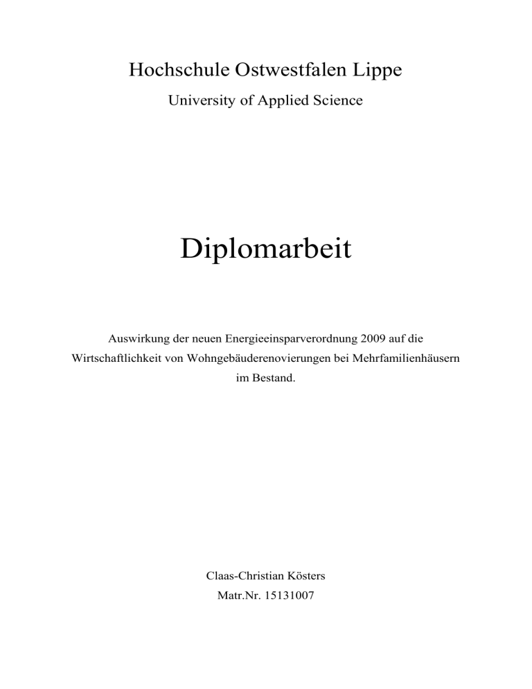 Hochschule Ostwestfalen Lippe University of Applied Science Diplomarbeit Auswirkung der neuen Energieeinsparverordnung 2009 auf die Wirtschaftlichkeit von Wohngebäuderenovierungen bei Mehrfamilienhäusern im Bestand. Claas-Christian Kösters Matr.Nr. 15131007 Zusammenfassung Zahlreiche vermietete Mehrfamilienwohnhäuser in Deutschland aus dem letzten Jahrhundert weisen einen großen Sanierungsstau auf oder sind zumindest energetisch nicht gut ausgestattet. Eigentümer und Investoren müssen Entscheidungen treffen, wie und in welchem Umfang Sanierungen durchgeführt werden. Als Grundlage für diese Arbeit dienen die Vorschriften und Rahmenbedingungen der neuen Energie-Einsparverordnung (EnEV), die ab dem 01. Oktober 2009 in Kraft tritt und um 30% gegenüber der alten Fassung von 2007 verschärft wurde. Anhand dieser Basis werden auf ein Beispielgebäude 4 Maßnahmenpakete zugeschnitten und deren energetische Bilanz für das Gebäude ermittelt. Wichtige Nebenaspekte zur Festlegung der Maßnahmenpakete sind die Vorgaben zur Förderung durch die Kreditanstalt für Wiederaufbau (KfW), um den Faktor der sinnvollen und geförderten Finanzierung mit einzubeziehen. Für die vier Maßnahmenpakete wird eine Kostenschätzung nach DIN 276 ausgerichtet an den verschiedenen Gewerken durchgeführt, dafür sind Angebote von ortsansässigen Firmen eingeholt worden. Außerdem werden die Kosten für die Instandhaltung, also die sogenannten „Sowieso-Kosten“ ermittelt. Nach einem Überblick über die aktuellen Fördermöglichkeiten in Deutschland und die geltenden mietrechtlichen Rahmenbedingungen für eine Mieterhöhung zur Refinanzierung der Investition, wird die Wirtschaftlichkeitsberechnung durchgeführt. Bei dieser handelt es sich um einen Mehrkostenansatz, das heißt nur die energetisch bedingten Kosten werden den dadurch möglichen Mehreinnahmen durch Energieeinsparung bzw. Mieterhöhung gegenübergestellt. Als wirtschaftliche Kennwerte werden der annuitätische Gewinn und der Kapitalwert der einzelnen Maßnahmenpakete unter vorher festgelegten Rahmenbedingungen berechnet. Einzelne Varianten zeigen und bewerten unterschiedliche Kostenstrukturen und Mieterhöhungsmöglichkeiten, als Parameterstudien werden mit höheren „Sowieso-Kosten“ und einer nachhaltigen Mieterhöhung durch einen ökologischen Mietspiegel gerechnet. Diese Ergebnisse werden bewertet und für das Beispielgebäude und den allgemeineren Ansatz zum Gebäudebestand in einem Fazit zusammengefasst Inhaltsverzeichnis 1. Einleitung Seite 1 2. Schillerstraße 36, Münster / Westfalen Seite 2 - Ist Zustand 2.1 Bilder 2.1.1 Ansicht Straßenseite, Nord-Ost 2.1.2 Ansicht hinten, Süd-West 2.1.3 Hofeinfahrt Ansicht vorne und hinten Seite 3 Seite 3 Seite 4 Seite 5 2.2 Pläne 2.2.1 2.2.2 2.2.3 2.2.4 2.2.5 Seite 6 Seite 6 Seite 7 Seite 8 Seite 9 Seite 10 Schnitt A-A Grundriss Kellergeschoss Grundriss Erdgeschoss Grundriss 1 - 3 Obergeschoss Grundriss Dachgeschoss 2.3 Energetischer Zustand 2.3.1 Gebäudehülle 2.3.2 Festgestellte U-Werte der einzelnen Bauteile 2.3.3 Ergebnis der Berechnung mit dem Energieplaner 8 Ist-Zustand 2.3.4 Kontrolle mittels des tatsächlichen Verbrauches 3. Mögliche energetische Sanierungen Seite 11 Seite 12 Seite 12 Seite 14 Seite 16 Seite 17 Übersicht anhand des Gebäudemodells Schillerstraße 36 3.1 Baulicher Wärmeschutz Seite 17 3.2 Schwachstelle Wärmebrücken Seite 17 3.3 Wärmedämmung der Außenwände 3.3.1 Wärmedämmverbundsystem (WDVS) 3.3.2 Vorsatzfassade 3.3.3 Kerndämmung 3.3.4 Innendämmung Seite 20 Seite 20 Seite 21 Seite 23 Seite 24 3.4 Dämmung des geneigten Daches 3.4.1 Dämmung zwischen den Sparren 3.4.2 Dämmung auf den Sparren 3.4.3 Dämmung unter den Sparren Seite 25 Seite 26 Seite 27 Seite 27 3.5 Dämmung der obersten Geschossdecke Seite 28 3.6 Dämmung der Kellerdecke Seite 29 3.7 Dämmung der Keller-Außenwände Seite 30 3.8 Fenster und Türen Seite 32 3.9 Haustechnik 3.9.1 Heizungsanlage 3.9.2 Niedertemperaturkessel 3.9.3 Brennwertkessel 3.9.4 Lüftungsanlage 3.9.5 Thermische Solaranlage 3.9.6 Photovoltaik 3.9.7 Kraft-Wärme-Kopplung 3.9.8 elektrische Wärmepumpen Seite 33 Seite 33 Seite 34 Seite 34 Seite 35 Seite 37 Seite 38 Seite 39 Seite 40 4. Energetische Sanierung Schillerstraße 36 Seite 42 4.1 Relevante Vorgaben der EnEV 2009 4.1.1 U-Werte 4.1.2 Heizung 4.1.3 Warmwasser-Bereitung 4.1.4 Lüftung Seite 42 Seite 42 Seite 43 Seite 43 4.2 Gewählte Maßnahmenpakete Seite 43 4.3 Maßnahmenpaket EnEv2009+30 % - KfW130 4.3.1 Ergebnisse der Berechnung für das Maßnahmenpaket EnEv2009+30% - KfW 130 Seite 44 Seite 47 4.4 Maßnahmenpaket EnEv2009 – KfW100 4.4.1 Ergebnisse der Berechnung für das Maßnahmenpaket EnEv2009 –KfW100 Seite 49 Seite 50 4.5 Maßnahmenpaket EnEv2009 „Maximal“ –KfW 055 (Pelletheizung) 4.5.1 Ergebnisse der Berechnung für das Maßnahmenpaket EnEv2009 „Maximal“ – KfW055 (Pelletheizung) Seite 52 Seite 54 4.6 Maßnahmenpaket EnEv2009 „Maximal – KfW 085 (Gasheizung) 4.6.1 Ergebnisse der Berechnung für das Maßnahmenpaket EnEv2009 „Maximal“ – KfW 085 (Gasheizung) Seite 56 Seite 56 5. Kostenschätzung nach DIN 276 -Gewerke- Seite 58 5.1 Maßnahmenpaket EnEv+30% - KfW 130 5.1.1 Gerüstbauarbeiten 5.1.2 Malerarbeiten 5.1.3 Trockenbauarbeiten 5.1.4 Fensterbauer 5.1.5 Heizungsanlage 5.1.6 Lüftungsanlage 5.1.7 Dacharbeiten 5.1.8 Montagearbeiten 5.1.9 Zusammenstellung Seite 58 Seite 58 Seite 58 Seite 59 Seite 59 Seite 59 Seite 59 Seite 60 Seite 60 Seite 60 5.2 Maßnahmenpaket EnEv2009 – KfW100 5.2.1 Gerüstbauarbeiten 5.2.2 Malerarbeiten 5.2.3 Trockenbauarbeiten 5.2.4 Fensterbauer 5.2.5 Heizungsanlage 5.2.6 Lüftungsanlage 5.2.7 Dacharbeiten 5.2.8 Montagearbeiten 5.2.9 Zusammenstellung Seite 60 Seite 61 Seite 61 Seite 62 Seite 62 Seite 62 Seite 63 Seite 63 Seite 63 Seite 63 5.3 Maßnahmenpaket EnEv2009 „Maximal“ – KfW055 (Pellet-Heizung) 5.3.1 Gerüstbauarbeiten 5.3.2 Malerarbeiten 5.3.3 Trockenbauarbeiten 5.3.4 Fensterbauer 5.3.5 Heizungsanlage 5