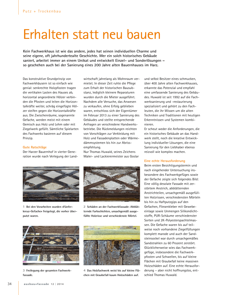 Putz + Trockenbau Erhalten statt neu bauen Kein Fachwerkhaus ist wie das andere, jedes hat seinen individuellen Charme und seine eigene, oft jahrhundertealte Geschichte. Wer ein solch historisches Gebäude saniert, arbeitet immer an einem Unikat und entwickelt Einzel- und Sonderlösungen – so geschehen auch bei der Sanierung eines 200 Jahre alten Bauernhauses im Harz. Das konstruktive Grundprinzip von Fachwerkhäusern ist so einfach wie genial: senkrechte Holzpfosten tragen die vertikalen Lasten des Hauses ab, horizontal angeordnete Hölzer verbinden die Pfosten und leiten die Horizontalkräfte weiter, schräg eingefügte Hölzer steifen gegen die Horizontalkräfte aus. Die Zwischenräume, sogenannte Gefache, werden meist mit einem Gemisch aus Holz und Lehm oder mit Ziegelwerk gefüllt. Sämtliche Spielarten des Fachwerks basieren auf diesem Prinzip. Gute Ratschläge Der Harzer Bauernhof in vierter Generation wurde nach Verlegung der Land- 34 wirtschaft jahrelang als Wohnraum vermietet. In dieser Zeit ruhte die Pflege zum Erhalt der historischen Bausubstanz, lediglich kleinere Reparaturen wurden durch die Mieter ausgeführt. Nachdem alle Versuche, das Anwesen zu verkaufen, ohne Erfolg geblieben waren, entschloss sich der Eigentümer im Februar 2013 zu einer Sanierung des Gebäudes und stellte entsprechende Anfragen an verschiedene Handwerksbetriebe. Die Rückmeldungen reichten von Vorschlägen zur Verkleidung mit Holz und Fassadenplatten oder Wärmedämmsystemen bis hin zur Abrissempfehlung. Nur Thomas Huwald, seines Zeichens Maler- und Lackierermeister aus Goslar 1 Bei den Vorarbeiten wurden »Fünfer- 2 Schäden an der Fachwerkfassade: Abblät- kreuz-Gefache« freigelegt, die vorher über- ternde Farbschichten, unsachgemäß ausge- putzt waren. füllte Holzrisse und verschiedenste Mörtel. 3 Freilegung der gesamten Fachwerk- 4 Das Holzfachwerk weist bis auf kleine Flä- fassade. chen mit Graubefall kaum Holzschäden auf. a u s b a u + fa s s a d e 12 | 2014 und selbst Besitzer eines schmucken, über 400 Jahre alten Fachwerkhauses, erkannte das Potenzial und empfahl eine umfassende Sanierung des Gebäudes. Huwald ist seit 1992 auf die Fachwerksanierung und -restaurierung spezialisiert und gehört zu den Fachleuten, die ihr Wissen um die alten Techniken und Traditionen mit heutigen Erkenntnissen und Systemen kombinieren. Er scheut weder die Anforderungen, die ein historisches Gebäude an das Handwerk stellt, noch die kreative Entwicklung individueller Lösungen, die eine Sanierung für den Liebhaber ebenso reizvoll wie komplex machen. Eine echte Herausforderung Beim ersten Besichtigungstermin und nach eingehender Untersuchung insbesondere des Fachwerkgefüges sowie der Gefache zeigte sich folgendes Bild: Eine völlig desolate Fassade mit zerstörtem Anstrich, abblätternden Anstrichteilen, unsachgemäß ausgefüllten Holzrissen, verschiedensten Mörteln bis hin zu Haftputzgips auf den Gefachen, Fliesenkleber mit Gewebeeinlage sowie Unmengen Silikondichtstoffe, PUR-Schäume verschiedenster Sorten und 2K-Polyesterspachtelmassen. Die Gefache waren bis auf teilweise noch vorhandene Ziegelfüllungen komplett marode und auch der Sandsteinsockel war durch unsachgemäßes Sandstrahlen zu 60 Prozent zerstört. Glücklicherweise wies das Fachwerkgefüge, insbesondere die Fachwerkpfosten und Schwellen, bis auf kleine Flächen mit Graubefall keine massiven Holzschäden auf. Eine echte Herausforderung – aber nicht hoffnungslos, entschied Thomas Huwald. Fachwerksanierung »Es gelang mir, den Eigentümer davon zu überzeugen, dass sein Gebäude trotz aller Bauschäden und Mängel mit Sicherheit nicht abrissreif ist«, erinnert sich der Fachmann. »Glücklicherweise hatte dieser mittlerweile begonnen, sich mit dem bis dato eher ungeliebten Objekt auseinanderzusetzen, Dokumente und Fotos zur Geschichte des Hofes gesammelt und war einer Sanierung nicht mehr ganz abgeneigt.« Huwald schlug vor, zunächst einen Maßnahmenkatalog samt Kostenplan aufzustellen und bekam schließlich den Auftrag, den Bauernhof historisch und fachlich korrekt instand zu setzen. Instandsetzung von Holz und Gefachen Zunächst machte sich das Malerteam daran, sämtliche Anstrich- und Putzschichten sowie alle Dichtstoffe und Spachtelmassen an den Gefachen, Fachwerkpfosten und am Sandsteinsockel zu entfernen. »Das Schuttaufkommen betrug 4,5 Tonnen«, berichtet Huwald. »Aber der komplette Rückbau war hier die unabdingbare Voraussetzung für eine sinnvolle Sanierung im Hinblick auf die spezielle Bauphysik eines Fachwerkhauses.« Denn das hölzerne Fachwerk und die ausgemauerten Gefache vertragen keinerlei diffusionsdichte Baustoffe. Die Maler arbeiteten beim Aufbau daher ausschließlich mit mineralischen Produkten aus dem Hause Keim, weil diese diffusionsoffen und daher »atmungsaktiv« sind. Die hohe Wasserdampfdurchlässigkeit der Silikatfarben gewährleistet, dass im Baukörper enthaltene Feuchtigkeit ungehindert und schnell nach außen abgegeben werden kann. Dies ist bauphysikalisch von Vorteil: Zwischen Anstrich und Untergrund entstehen keine Feuchteansammlungen, die zu Schäden führen. In Kombination mit einer geringen Wasseraufnahme – bei den einkomponentigen Keimfarben längst Standard - bietet dies Schutz vor Wasser- und Frostschäden sowie Algenund Pilzbewuchs. Für den Neuverputz der Gefache kamen »NHL Kalkputz grob« als Unterputz und 5 Gefache mit Lehmfüllung. darauf »NHL Kalkputz« zum Einsatz. Nach dem Ansteifen wurde der Putz durch einen dünnen Kellenschnitt vom Holz getrennt. Anschließend erhielten die Flächen einen Grundanstrich mit »Soldalit grob«, für das Finish wurde Soldalit als Zwischen- und Schlussbeschichtung gewählt. Soldalit ist eine silikatische Fassadenfarbe von Keim auf Basis von Kieselsol und Wasserglas. Diese Bindemittelkombination ermöglicht silikatische Anstriche auf mineralischen sowie einer Vielzahl organischer Untergründe – direkt und ohne zusätzliche Haftbrücken. Silikatfa