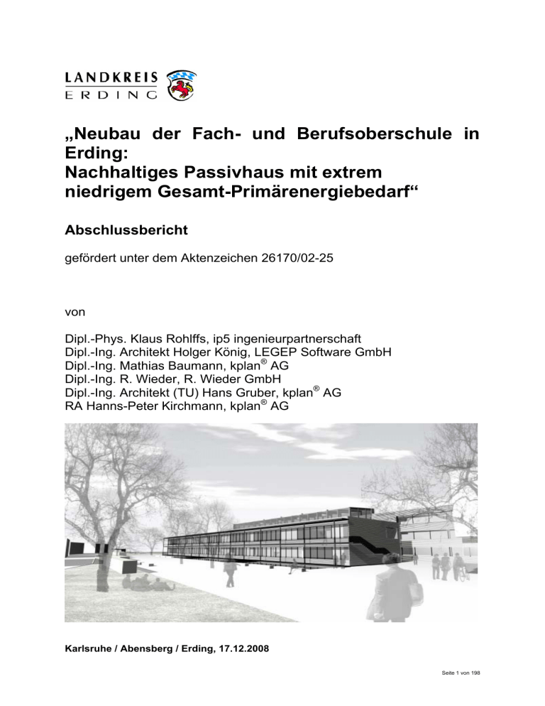 „Neubau der Fach- und Berufsoberschule in Erding: Nachhaltiges Passivhaus mit extrem niedrigem Gesamt-Primärenergiebedarf“ Abschlussbericht gefördert unter dem Aktenzeichen 26170/02-25 von Dipl.-Phys. Klaus Rohlffs, ip5 ingenieurpartnerschaft Dipl.-Ing. Architekt Holger König, LEGEP Software GmbH Dipl.-Ing. Mathias Baumann, kplan® AG Dipl.-Ing. R. Wieder, R. Wieder GmbH Dipl.-Ing. Architekt (TU) Hans Gruber, kplan® AG RA Hanns-Peter Kirchmann, kplan® AG Karlsruhe / Abensberg / Erding, 17.12.2008 Seite 1 von 198 Deutsche Bundesstiftung Umwelt Az 26170/02-25 Referat Fördersumme Antragstitel Neubau der Fach- und Berufsoberschule in Erding Stichworte Nachhaltiges Passivhaus mit extrem niedrigem Gesamt-Primärenergiebedarf Laufzeit Projektbeginn Projektende Projektphase(n) September 2008 bis September 2008 31.12.2010 LPH 1 – 4 HOAI 31.12.2010 Bewilligungsempfänger Landkreis Erding VD Heinz Fischer Landratsamt Erding Alois Schießl Platz 2 85435 Erding Email: [email protected] Tel Fax 08122/58-1366 08122/58-1109 Projektleitung Heinz Fischer Bearbeiter Heinz Fischer Kooperationspartner ip5 ingenieurpartnerschaft, Bahnhofplatz 10, 76137 Karlsruhe, für den Bereich Bauphysik: ip5 ingenieurpartnerschaft in Zusammenarbeit mit dem Büro Ebök, 72003 Tübingen, für den Bereich Nachhaltigkeit: ip5 ingenieurpartnerschaft mit dem Büro LEGEP, Moosweg 9, 85757 Karlsfeld. Deutsche Bundesstiftung Umwelt - An der Bornau 2 - 49090 Osnabrück - Tel 0541/9633-0 - Fax 0541/9633-190 - http://www.dbu.de Seite 2 von 198 Zielsetzung und Anlass des Vorhabens Der Landkreis Erding plant den Neubau eines Schulgebäudes mit erheblichen Anforderungen an einen sehr niedrigen Primärenergieverbrauch im Betrieb. Es soll ein insbesondere auch über den gesamten Lebenszyklus extrem ressourcenschonendes Gebäude entstehen. Prägend waren von Anfang an folgende Leitgedanken: • • • • • • • • • • • Ausführung im Passivhausstandard mit einem maximalen spezifischen Heizwärmebedarf von 15 kWh/(m² a) und einem maximalen Primärenergiebedarf der Haustechnik von 60 … 70 kWh/(m² a) Wärmeversorgung des Gebäudes durch Nutzung umweltfreundlicher Ressourcen (Geothermie) Minimierung des erforderlichen Kunstlichteinsatzes durch Gewährleistung einer guten Tageslichtversorgung und durch präsenz- und tageslichtabhängige Regelung der Beleuchtungsanlage Wesentlich verbesserte Behaglichkeit für die Nutzer bei geringem Regelungsaufwand Einfache Wartung- und Instandhaltung der technischen Anlagen im Betrieb Reduzierte, hocheffiziente Haustechnik durch durchdachte Führung von Medien (insbesondere von Luft) und Mehrfachnutzung ohnehin vorhandener Einheiten (Beispiel: Nutzung des Atriums als Abluftplenum zur Verringerung des vorzuhaltenden Kanalrohrnetzes Zu prüfen war der Einsatz ökologischer Materialien für Baustoffe und Installationsmaterialien. Zusammenfassend kann als End- bzw. Gesamtziel ein energiesparendes und nachhaltiges Schulgebäude definiert werden. Einbindung Nutzer, Bauherr, Öffentlichkeit und Planer Der Endbericht und auch die Auswertungen im Betrieb der Anlage werden in unterschiedlichen Medien (Fachzeitungen, Internetportal etc.) publiziert. Durchsetzung des Energiespargedankens durch Einbindung nicht nur der staatlichen Stellen, sondern einer größtmöglichen Öffentlichkeit, insbesondere Schüler, Lehrer, Eltern, Planer, gesetzgebende Behörden, Kultusministerium, Finanzministerium, Oberste Baubehörde Darstellung der Arbeitsschritte und der angewandten Methoden Die wesentlichen Arbeitsschritte lassen sich wie folgt beschreiben: 1. Grundlagenermittlung 2. Prüfung der grundsätzlichen Erreichbarkeit der Passivhaus-Kriterien (Verwendung des PassivhausProjektierungspakets PHPP2007); Erarbeiten wesentlicher bauphysikalischer und haustechnischer Anforderungen zur Erreichung des Passivhaus-Standards. Ggf. Modifikation des Entwurfs zur weiteren Verringerung des Primärenergiebedarfs 3. Entwicklung eines ressourcenschonenden baulich-technischen Energiekonzepts; hierbei kommen tabellarische Bilanzierungswerkzeuge zum erzielbaren Primärenergiebedarf des Gebäudes sowie Simulationssoftware für das thermisch-dynamische Gebäudeverhalten (TRNSYS15) und die Tageslichtsituation (RADIANCE) zum Einsatz. Es werden z. B. in den Bereichen Dämmstandard, Tageslichtautonomie und sommerlicher thermischer Komfort jeweils mehrere Varianten überprüft. Sämtliche Erfordernisse zur Erreichung der energetischen Ziele werden unter den Planungsbeteiligten abgestimmt. Ein energetisches Pflichtenheft mit Detailangaben zu anzustrebenden Grenzwerten dient den Planern als Grundlage, um die ambitionierten energetischen Ziele zu erreichen. 4. Kontinuierliche Anpassung der Primärenergiebilanz Haustechnik zur Überprüfung, inwieweit die sehr ambitionierten energetischen Ziele erreicht werden können. 5. Abschätzung der Kosten der Kostengruppen 300 und 400 und energetische sowie wirtschaftliche Bewertung durch Vergleich zwischen dem vorliegenden Projekt und einer in Geometrie und Nutzung identischen fiktiven Schule in Standardbauweise 6. Life-Cycle-Analysis mit der Bilanzierungssoftware LEGEP 7. Erarbeitung eines Monitoring-Konzepts für die Ermittlung der Primärenergiebilanz im realen Betrieb des Gebäudes und die zielgerichtete Optimierung von Steuerungs- und Regelungskonzepten. 8. Durchsetzung des Energiespargedankens durch Einbindung nicht nur der staatlichen Stellen, sondern einer größtmöglichen Öffentlichkeit, insbesondere Schüler, Lehrer, Eltern, Planer, gesetzgebende Behörden, Kultusministerium, Finanzministerium, Oberste Baubehörde. Deutsche Bundesstiftung Umwelt - An der Bornau 2 - 49090 Osnabrück - Tel 0541/9633-0 - Fax 0541/9633-190 - http://www.dbu.de Seite 3 von 198 Ergebnisse und Diskussion Das entwickelte baulich-technische Energiekonzept hat, soweit bisher erkennbar, die selbst gesteckten energetischen und komforttechnischen Ziele voll umfänglich erreicht. So wird der Passivhausstandar