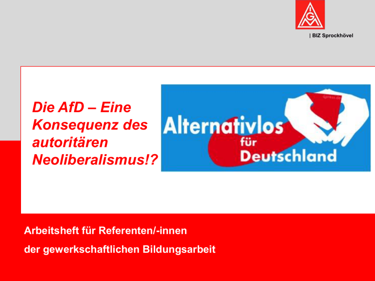 BIZ Sprockhövel Die AfD – Eine Konsequenz des autoritären Neoliberalismus!? Arbeitsheft für Referenten/-innen der gewerkschaftlichen Bildungsarbeit INHALT BIZ Sprockhövel Die AfD eine rechte Partei? Eine gewollte (Fehl-)Einschätzung (?) zu Beginn Woher kommt die AfD? Auf welchen Nährboden fällt die AfD? Kein nationales Phänomen! Die neuen Etappen des Neoliberalismus: Postdemokratie & autoritärer Neoliberalismus Wer wählt die AfD? Was will die AfD aktuell? Keine Alternative für ArbeitnehmerInnen! Was tun? Rechtlicher Handlungsrahmen für Betriebsräte Eine Einschätzung zum Schluss AfD & Autoritärer Neoliberalismus 2 DIE AFD EINE RECHTE PARTEI? EINE GEWOLLTE (FEHL-)EINSCHÄTZUNG (?) ZU BEGINN BIZ Sprockhövel Gabriel vergleicht AfD-Funktionäre mit Nazis 12.06.2016, 16:11 Uhr | dpa "Alles, was die erzählen, habe ich schon gehört - im Zweifel von meinem eigenen Vater, der bis zum letzten Atemzug ein Nazi war.“ "Leute wie Herr Gauland waren still und in der CDU, solange sie da Karriere machen konnten. Als es vorbei war, haben sie ihre alten deutsch-nationalen Parolen ausgepackt.“ "Das sind Leute, denen die ganze Weltoffenheit und Liberalität dieses Landes zuwider ist. Die zurück wollen in die verklemmte und verdruckste alte westdeutsche Republik der 60er Jahre: Wo die Frauen noch zuhause waren, Ausländer, Schwule und Lesben gefälligst unsichtbar zu sein hatten und abends beim Bier alte Wehrmachtslieder gesungen wurden. Fürchterlich.“ Auf die Frage, ob der Aufstieg der AfD ein Argument gegen eine Fortsetzung der großen Koalition sei, sagte ???, er sei sehr stolz auf die Leistung der schwarz-roten Regierung. "Allerdings zeigt Österreich, dass dauerhafte große Koalitionen dazu führen, dass die Menschen sich nach Unterscheidbarkeit sehnen - und dann die Ränder stärken." AfD & Autoritärer Neoliberalismus 3 WOHER TEIL 1 KOMMT DIE AFD? BIZ Sprockhövel Als Reaktion auf die Euro-Rettungspolitik am 6.2. 2013 gegründet. Europawahl 2014 erstmals überregionale Mandate und Einzug in die Landesparlamente von Sachsen, Brandenburg, Thüringen, 2015 in Hamburg und Bremen und 2016 in Sachsen-Anhalt, Baden-Württemberg, RheinlandPfalz und Mecklenburg-Vorpommern. Liberale, konservative und nationale Vorläufer und Sammlungsbewegungen im Vorfeld: Bund freier Bürger, Friedrich A. von Hayek-Gesellschaft, Initiative Neue Soziale Marktwirtschaft, Bündnis Bürgerwille, Wahlalternative 2013, Zivile Koalition. Parteipolitisch kamen die nachmaligen FunktionärInnen vor allem aus der „zweiten Reihe“ von CDU und FDP. Als „spiritus rector“ gilt, wenn auch nicht Mitglied, der ehemalige SPDPolitiker und Bundesbankvorstand Thilo Sarrazin. Ein diskursiver Raum für den Rechtspopulismus wird geöffnet! AfD & Autoritärer Neoliberalismus 4 WOHER TEIL 2 KOMMT DIE AFD? BIZ Sprockhövel Erster Parteitag April 2013: Bernd Lucke, Frauke Petry und Konrad Adam werden zu Parteisprechern gewählt. Lucke bezeichnete die AfD als „Partei neuen Typs“, die „weder links noch rechts“ sei und keinen „ideologischen Wegweiser“ brauche. Auch sei die Einbindung rechter Protestwähler eine der Funktionen der AfD. Es bestehe sonst die Gefahr, dass enttäuschte Wähler nur aus Protest extremistische Parteien wählten. Januar 2014: Parteitag wählt in Aschaffenburg Lucke zum Spitzenkandidaten für die Europawahl. Auf die nachfolgenden Listenplätze kamen Hans-Olaf Henkel, Bernd Kölmel, Beatrix von Storch, Joachim Starbatty und Ulrike Trebesius. Nach der Europawahl Aufnahme in die Fraktion der Europäischen Konservativen und Reformer (EKR) im Europaparlament. AfD & Autoritärer Neoliberalismus 5 WOHER TEIL 3 KOMMT DIE AFD? BIZ Sprockhövel März 2015: Höcke & André Poggenburg initiieren gegen den Kurs des Vorstands die Erfurter Resolution: • Konservativere Ausrichtung der Partei wird gefordert. • Unterstützer verstünden die Partei „als Bewegung unseres Volkes gegen die Gesellschaftsexperimente der letzten Jahrzehnte (Gender-Mainstreaming, Multikulturalismus, Erziehungsbeliebigkeit usf.)“ sowie als „Widerstandsbewegung gegen die weitere Aushöhlung der Souveränität und der Identität Deutschlands“. • Partei habe „sich von bürgerlichen Protestbewegungen ferngehalten und in vorauseilendem Gehorsam sogar distanziert, obwohl sich tausende AfD-Mitglieder als Mitdemonstranten oder Sympathisanten an diesen Aufbrüchen beteiligen“. Die Verbindungen zu PEGIDA u.a. rechtspopulistischen Bewegungen werden zementiert. AfD & Autoritärer Neoliberalismus 6 WOHER TEIL 4 KOMMT DIE AFD? BIZ Sprockhövel Nach monatelangem innerparteilichen Machtkampf wählte der Mitgliederparteitag Petry im Juli 2015 zur ersten Parteisprecherin. Petry erhielt 60%, Lucke 38,1% der Stimmen. Jörg Meuthen wurde als zweiter Parteisprecher gewählt. Petry: Parteitag war ein Befreiungsschlag, der die Partei von einem selbstzerstörerischen Machtkampf erlöste. Am Kurs der Partei werde sich unter dem neuen Vorstand nichts ändern. Wichtigstes Thema bleibe die Kritik an der Euro-Rettungspolitik und nicht die Flüchtlings- und Asylpolitik. In der Folge trat Lucke aus der Partei aus und gründete im Juli 2015 die Partei Allianz für Fortschritt und Aufbruch (ALFA), der sich viele ehemalige AfD-Mitglieder anschlossen. AfD & Autoritärer Neoliberalismus 7 AUF WELCHEN NÄHRBODEN FÄLLT DIE AFD? BIZ Sprockhövel Postdemokratie / Scheindemokratie Gesellschaftliche Umbrüche Politikverdrossenheit Neoliberalismus Fehlende Bindekraft von Gewerkschaften & demokratischen Parteien Familienpolitik Migrations- & Integrationspolitik AfD-Nährboden Asyl- & Flüchtlingspolitik Entsolidarisierung der Gesellschaft AfD & Autoritärer Neoliberalismus Neue Rolle Deutschlands in der Welt Latente rechtskonservative Haltungen Abstiegsängste Politische Ohnmacht & Orientierungslosigkeit … 8 KEIN NATIONALES PHÄNOMEN! DIE ETAPPEN DES NEOLIBERALISMUS NEUEN BIZ Sprockhövel Neoliberalismus wird seit den 1990‘er Jahren durch neuen Konstituti