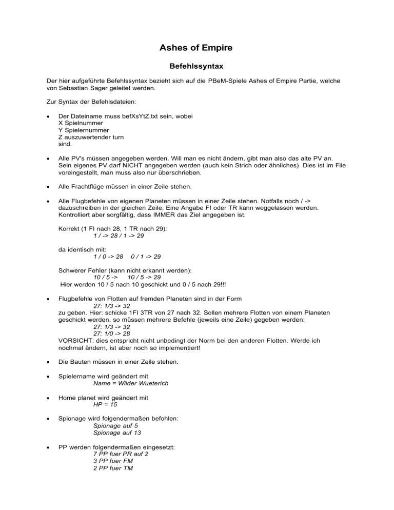 Ashes of Empire Befehlssyntax Der hier aufgeführte Befehlssyntax bezieht sich auf die PBeM-Spiele Ashes of Empire Partie, welche von Sebastian Sager geleitet werden. Zur Syntax der Befehlsdateien: • Der Dateiname muss befXsYtZ.txt sein, wobei X Spielnummer Y Spielernummer Z auszuwertender turn sind. • Alle PV's müssen angegeben werden. Will man es nicht ändern, gibt man also das alte PV an. Sein eigenes PV darf NICHT angegeben werden (auch kein Strich oder ähnliches). Dies ist im File voreingestellt, man muss also nur überschrieben. • Alle Frachtflüge müssen in einer Zeile stehen. • Alle Flugbefehle von eigenen Planeten müssen in einer Zeile stehen. Notfalls noch / -> dazuschreiben in der gleichen Zeile. Eine Angabe FI oder TR kann weggelassen werden. Kontrolliert aber sorgfältig, dass IMMER das Ziel angegeben ist. Korrekt (1 FI nach 28, 1 TR nach 29): 1 / -> 28 / 1 -> 29 da identisch mit: 1 / 0 -> 28 0 / 1 -> 29 Schwerer Fehler (kann nicht erkannt werden): 10 / 5 -> 10 / 5 -> 29 Hier werden 10 / 5 nach 10 geschickt und 0 / 5 nach 29!!! • Flugbefehle von Flotten auf fremden Planeten sind in der Form 27: 1/3 -> 32 zu geben. Hier: schicke 1FI 3TR von 27 nach 32. Sollen mehrere Flotten von einem Planeten geschickt werden, so müssen mehrere Befehle (jeweils eine Zeile) gegeben werden: 27: 1/3 -> 32 27: 1/0 -> 28 VORSICHT: dies entspricht nicht unbedingt der Norm bei den anderen Flotten. Werde ich nochmal ändern, ist aber noch so implementiert! • Die Bauten müssen in einer Zeile stehen. • Spielername wird geändert mit Name = Wilder Wueterich • Home planet wird geändert mit HP = 15 • Spionage wird folgendermaßen befohlen: Spionage auf 5 Spionage auf 13 • PP werden folgendermaßen eingesetzt: 7 PP fuer PR auf 2 3 PP fuer FM 2 PP fuer TM • Planetennamen werden geändert, indem zwischen : und dem Wort Frachtflüge ein Name angegeben wird: Planet 10: Barnard's Arrow Frachtflüge: bewirkt die Umbenennung von Planet 10 in Barnard's Arrow- Es können nur eigene Planeten umbenannt werden (also nicht in der Runde der Eroberungen wie bei einigen Spielleitern möglich) • Nachrichten für die GM müssen am Ende der Befehlsdatei stehen und von der Zeile Nachrichten: eingeleitet und der Zeile Nachrichtenende abgeschlossen werden (wegen möglicher Signatures). Nachrichten werden geshuffelt und sind anonym, werden aber in einem Block eingefügt. • Die ID einfach ignorieren, aber auf keinen Fall ändern. Beispieldatei: Befehlsbogen für Spieler 2 Game 7 Turn 3 Spieler 2 Id 34763387 HP = 10 Name = Mephistopheles 7 PP fuer PR auf 2 3 PP fuer FM Spionage auf 3 Spionage auf 5 27: 1/0 -> 32 27: 1/0 -> 28 PV - Änderungen 1 2 3 4 5 6 7 8 1 2 2 2 2 2 1 Planet 2: Frachtflüge: 1 C4 -> 3 Bauten: PDU: 1 FP: 2 OP: 5 RP: 2 FY: 1 Flugbefehle: 13/2 -> 21 1/0 -> 3 TY: 2 FI: 6 Planet 10: Barnard's Arrow Frachtflüge: Bauten: PDU: 0 FP: 2 OP: 2 RP: 3 FY: 2 Flugbefehle: 10/4 --> 21 TY: 2 FI: TR: 3 6 TR: 3 Nachrichten: Mephistopheles sucht Verbuendete. Interessant waere vor allem ein Abstecken der Einflusssphaere in der Mitte der Karte. Schreibt an: [email protected] Nachrichtenende Mit einem abschätzigen Blick, für den allein er schon mehr als einen grausamen Tod verdient hätte, mustert Euch Euer Berater. "So, Ihr wollt wirklich wissen, wie wir vorgehen, wenn Ihr Eure Baubefehlskapazitäten nicht ausschöpft?" Euer hochrot anlaufender Kopf bringt ihm seine Vorgänger im Amte und deren oft überraschend schnelles und dann doch wieder nicht so gnädig vorrübergehendes Ende in Erinnerung. Ohne weitere Gesten oder Worte berichtet er hastig: "Im Grossen und Ganzen gibt es drei Möglichkeiten, wie die Baubefehle ausgeführt werden können. Wenn Euer Hoheit sich damit abgeben mögen, so verplant Ihr höchsteigen sämtliche Arbeiter und lasst weniger als 4 Arbeiter, am besten natürlich gar keine, übrig. Dieses ist der erste und wohl auch der normale Fall. Der zweite Fall tritt ein, wenn Eure Hoheit sich aus irgendeinem Grunde gar nicht mit diesem Planeten befassen mögen, sei es wegen NMR, weil der Planet übersehen wurde oder aber weil Eure Hoheit es so wünschen, um sich schneller wieder Wein, Weib und Gesang widmen zu können. Hier gebe ich Euch dann die Meldung, dass ich mich um die Befehle kümmere, hoffentlich in Eurem Sinne." Eure hochgezogene linke Augenbraue lässt ihn kurz stocken und seine Bemerkung über Eure Freizeitbeschäftigung verfluchen, bevor er weiterspricht. "In diesem Fall halten wir uns an folgende Regeln: 1. Baue so viele PDUs, bis PDU=HD gilt (wenn genügend Arbeiter) 2. Baue so viele FI, wie möglich sind 3. Baue so viele TR, wie möglich sind WIEDERHOLE, solange verbleibende A > 3 4. Berechne Vorrat an rare, ore und fuel in der nächsten Runde (Vorrat diese Runde minus FI und TR - Bauten plus Produktion der vorhandenen und geplanten plants). 5. Wenn weniger rare vorhanden als für alle FY und TY benötigt, baue ein RP 6. Wenn weniger fuel vorhanden als für alle FY und TY benötigt, baue ein FP 7. Wenn weniger ore vorhanden als für alle FY und TY benötigt, baue ein OP 8. Wenn von allen genug vorhanden sind: a. Wenn A>=20 und mehr als doppelt so viele FY wie TY vorhanden sind baue ein TY b. Sonst wenn A>=15 baue FY c. Sonst verbrate restliche A für RP/OP" Erwartungsvoll schaut Euch Euer Berater an. "Und was ist mit der Produktionsrate?!?" poltert Ihr. "Die Produktionsrate? Ich verstehe nicht ganz..." stammelt er. "Vielleicht werden Produktionsstätten gebaut, die in der Runde gar nichts bringen, wenn die PR unter 1 ist" erklärt Ihr genüsslich. "Ausserdem sind mir das immer noch zu viele OP, verdammt!" "Euer Hoheit sind so schlau und allwissend! Darum wird es wohl das beste bleiben, wenn Ihr weiterhin die Entscheidungen trefft, mein Lord!" "Hmmm." antwortet Ihr verärgert. "Und was ist nun mit der dritten Möglichkeit?" "Die dritte Möglichkeit besteht in dem Fall, in dem Ihr Arbeiter verplant, aber Ressourcen übriglasst. Absichtlich, natürlich!" Er tritt vo