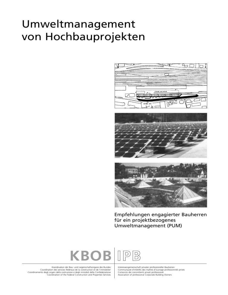 Umweltmanagement von Hochbauprojekten Empfehlungen engagierter Bauherren für ein projektbezogenes Umweltmanagement (PUM) KBOB I P B Koordination der Bau- und Liegenschaftsorgane des Bundes Coordination des services fédéraux de la construction et de l’immobilier Coordinamento degli organi della costruzione e degli immobili della Confederazione Coordination of the Federal Construction and Properties Services Interessengemeinschaft privater professioneller Bauherren Communauté d’intérêts des maîtres d’ouvrage professionnels privés Consorzio dei committenti privati professionali Association of professional Corporate Building Owners Einleitung Dieses Dokument soll engagierten Auftraggebern und Projektteams helfen, die Verantwortung für nachhaltiges Bauen in der Projektbearbeitung und -realisierung wahrzunehmen. Den Benützern und Betreibern von Gebäuden soll es ermöglichen, die Umweltbelastung und die Kosten der Gebäudenutzung zu senken, sowie eine hohe Arbeitsplatzqualität zu erreichen. Die Herausforderung Zielsetzung und Nutzen In Zukunft werden die Umweltbelange im Rahmen einer umfassenden Berücksichtigung der Nachhaltigkeit (vgl. Nachhaltige Entwicklung der gestaltbaren Umwelt, Seite 24, Werkzeugkasten) in die Planung und Realisierung von Bauvorhaben sowie die Bewirtschaftung von Gebäuden einfliessen. Während Ökologie heute im Bauwesen als Qualitätsstandard anerkannt ist und Kriterien für die Wirtschaftlichkeit vorliegen, sind die gesellschaftlichen Belange noch weniger präzis umrissen. Von der Ökologie zur Nachhaltigkeit Das projektbezogene Umweltmanagement (PUM) leistet einen wichtigen Beitrag zur Erreichung dieser ambitiösen Zielsetzung. Es steht in enger Beziehung zum projektbezogenen Qualitätsmanagement (PQM) und ist ein Bestandteil des Projektmanagements. Ein gutes Projektmanagement ist eine unabdingbare Voraussetzung für nachhaltiges Bauen. Nachhaltiges Bauen als Management-Aufgabe Das Umweltmanagement bringt verschiedene Vorteile: Die Umweltbelastung wird durch die reduzierten Energie- und Stoffflüsse wesentlich gesenkt. Die Wirtschaftlichkeit der Erstellung und des Betriebes wird verbessert. Das Umweltmanagement fördert die Innovation und erlaubt es, die nachhaltige Bauqualität zu kommunizieren. Nutzen des projektbezogenen Umweltmanagements (PUM) Umweltentlastung Projektmanagement Wirtschaftlichkeit Qualitätsmanagement PQM Umweltmanagement Bauprojekte PUM Innovation Kommunikation Das vorliegende Dokument richtet sich an das ganze Projektteam, bestehend aus den Vertretern des Auftraggebers, der Benutzer und Betreiber sowie den externen Planern. Die nachhaltige Bauweise ist von allen Beteiligten gemeinsam umzusetzen. Dabei kommt dem Auftraggeber eine Schlüsselrolle zu, da er die Zielsetzung vorgibt. Die Verantwortung für deren Durchsetzung liegt beim Bauprojektleiter. Nachhaltigkeit als Bestandteil der teamorientierten Planung Gültigkeit und Verwendung Mit dem vorliegenden Dokument werden die bisherigen Erfahrungen im Umweltmanagement von Hochbauprojekten zusammengefasst und einem breiteren Kreis zugänglich gemacht. Es stellt ein praktisches Hilfsmittel dar, das für alle Hochbauprojekte (Neubauten und Erneuerung) gültig ist. Gültig für alle Hochbauprojekte Das Dokument soll als Grundlage für die Erstellung von Projektpflichtenheften und als Checkliste für das Projektteam verwendet werden. Es stellt zudem eine Basis dar für den Erfahrungsaustausch und die Weiterbildung aller Beteiligten. Dadurch sollen eine laufende Verbesserung der ökologischen Bauqualität und eine wirtschaftliche Bauweise erreicht werden. Verwendung Inhaltsübersicht Zielsetzung für nachhaltiges Bauen Seite Zusätzlich zu den Umweltbelangen sind wirtschaftliche und gesellschaftliche Kriterien unabdingbare Bestandteile einer nachhaltigen Bauweise. Die aufgeführten Kriterien für nachhaltiges Bauen sind die Basis für die Beurteilung von Hochbauprojekten. Die Umsetzung und, soweit möglich, die Quantifizierung erfolgen während des Projektablaufes. Umwelt 4, 5 Wirtschaft 4 Gesellschaft 5 Strategische Planung 6 Vorstudien 8 Vorprojekt 10 Bauprojekt 12 Ausschreibung 14 Ausführungsplanung/ Ausführung 16 Inbetriebsetzung / Abschluss 18 Bewirtschaftung 20 Projektablauf Für jede Projektphase gemäss dem SIA Leistungsmodell (vgl. Werkzeugkasten) werden die Kernfragen des nachhaltigen Bauens sowie die konkreten Schritte zu den folgenden Aufgaben formuliert: 1 Abklärungen mit Auftraggeber bzw. mit Benutzer/Betreiber 1 Betreiber Benutzer Autraggeber 2 Aufträge an das Planungsteam 3 Kontrolle der Ergebnisse Projektleiter und Fachingenieur 4 2 3 Planungsteam extern 4 Entscheide des Auftraggebers Dadurch wird die phasengerechte Prüfung der entsprechenden Fragen vorgezeichnet: in frühen Projektierungsphasen in Form von Grundsatzfragen, später in höherem Detaillierungsgrad. Durch die frühzeitigen Weichenstellungen werden Fehlentscheide verhindert. In den einzelnen Projektphasen werden die für nachhaltiges Bauen relevanten Aufgaben des Qualitätsmanagements aufgeführt und auf die wichtigsten Instrumente für nachhaltiges Bauen hingewiesen. Instrumente Die systematische Projektdokumentation schafft als Führungsinstrument die für Planung und Projektabwicklung notwendige Transparenz für alle Beteiligten. Zudem bildet sie die Basis für die nachhaltige Bewirtschaftung. Projektdokumentation 22 Im Werkzeugkasten sind die wichtigsten Instrumente für die Planer aufgeführt. Für die übrigen Beteiligten soll die Übersicht eine Hilfe bei der Erteilung von Aufträgen sowie für die Kontrolle der Ergebnisse sein. Werkzeugkasten 24 Für die im Werkzeugkasten aufgeführten Instrumente sind die Bezugsquellen angegeben. Institutionen / Bezugsquellen 26 Bei den Herausgebern und Verfassern sind die Kontaktstellen für das Umweltmanagement von Hochbauprojekten aufgeführt. Impressum 28 Adressen Zielsetzung für nachhaltiges Bauen Umwelt: Energie Erste Priorität bei der Reduktion der 