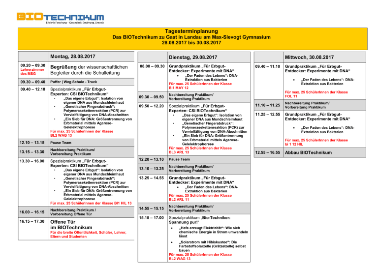 Tagesterminplanung Das BIOTechnikum zu Gast in Landau am Max-Slevogt Gymnasium 28.08.2017 bis 30.08.2017 Montag, 28.08.2017 09.20 – 09.30 Lehrerzimmer des MSG Begrüßung der wissenschaftlichen Begleiter durch die Schulleitung 09.30 – 09.40 Puffer | Weg Schule - Truck 09.40 – 12.10 Spezialpraktikum „Für ErbgutExperten: CSI BIOTechnikum“ • „Das eigene Erbgut“: Isolation von eigener DNA aus Mundschleimhaut • „Genetischer Fingerabdruck“: Polymerasekettenreaktion (PCR) zur Vervielfältigung von DNA-Abschnitten • „Ein Sieb für DNA: Größentrennung von Erbmaterial mittels AgaroseGelelektrophorese Für max. 25 SchülerInnen der Klasse BL2 WAG 13 12.10 – 13.15 Pause Team 13.15 – 13.30 Nachbereitung Praktikum/ Vorbereitung Praktikum 13.30 – 16.00 16.15 – 17.30 08.00 – 09.30 Grundpraktikum „Für ErbgutEntdecker: Experimente mit DNA“ 09.40 – 11.10 „Der Faden des Lebens“: DNAExtraktion aus Bakterien Für max. 25 SchülerInnen der Klasse Bl1 MAY 12 09.30 – 09.50 09.50 – 12.20 Spezialpraktikum „Für ErbgutExperten: CSI BIOTechnikum“ • „Das eigene Erbgut“: Isolation von eigener DNA aus Mundschleimhaut • „Genetischer Fingerabdruck“: Polymerasekettenreaktion (PCR) zur Vervielfältigung von DNA-Abschnitten • „Ein Sieb für DNA: Größentrennung von Erbmaterial mittels AgaroseGelelektrophorese Für max. 25 SchülerInnen der Klasse BL3 ARL 13 „Das eigene Erbgut“: Isolation von eigener DNA aus Mundschleimhaut • „Genetischer Fingerabdruck“: Polymerasekettenreaktion (PCR) zur Vervielfältigung von DNA-Abschnitten • „Ein Sieb für DNA: Größentrennung von Erbmaterial mittels AgaroseGelelektrophorese Für max. 25 SchülerInnen der Klasse Bl1 HIL 13 13.10 – 13.25 Nachbereitung Praktikum/ Vorbereitung Praktikum Nachbereitung Praktikum / Vorbereitung Offene Tür 14.55 – 15.15 13.25 – 14.55 Grundpraktikum „Für ErbgutEntdecker: Experimente mit DNA“ • „Der Faden des Lebens“: DNAExtraktion aus Bakterien Für max. 25 SchülerInnen der Klasse BL2 ARL 11 15.15 – 17.00 Nachbereitung Praktikum/ Vorbereitung Praktikum Spezialpraktikum „Bio-Techniker: Spannung pur!“ • Für die breite Öffentlichkeit, Schüler, Lehrer, Eltern und Studenten • „Hefe erzeugt Elektrizität“: Wie sich chemische Energie in Strom umwandeln lässt „Solarstrom mit Hibiskustee“: Die Farbstoffsolarzelle (Grätzelzelle) selbst bauen Für max. 25 SchülerInnen der Klasse BL2 WAG 13 Grundpraktikum „Für ErbgutEntdecker: Experimente mit DNA“ • „Der Faden des Lebens“: DNAExtraktion aus Bakterien Für max. 25 SchülerInnen der Klasse FOL 11 Nachbereitung Praktikum/ Vorbereitung Praktikum Pause Team Offene Tür im BIOTechnikum Mittwoch, 30.08.2017 • 12.20 – 13.10 Spezialpraktikum „Für ErbgutExperten: CSI BIOTechnikum“ • 16.00 – 16.15 Dienstag, 29.08.2017 11.10 – 11.25 11.25 – 12.55 Nachbereitung Praktikum/ Vorbereitung Praktikum Grundpraktikum „Für ErbgutEntdecker: Experimente mit DNA“ • „Der Faden des Lebens“: DNAExtraktion aus Bakterien Für max. 25 SchülerInnen der Klasse bi 1 12 HIL 12.55 – 16.55 Abbau BIOTechnikum