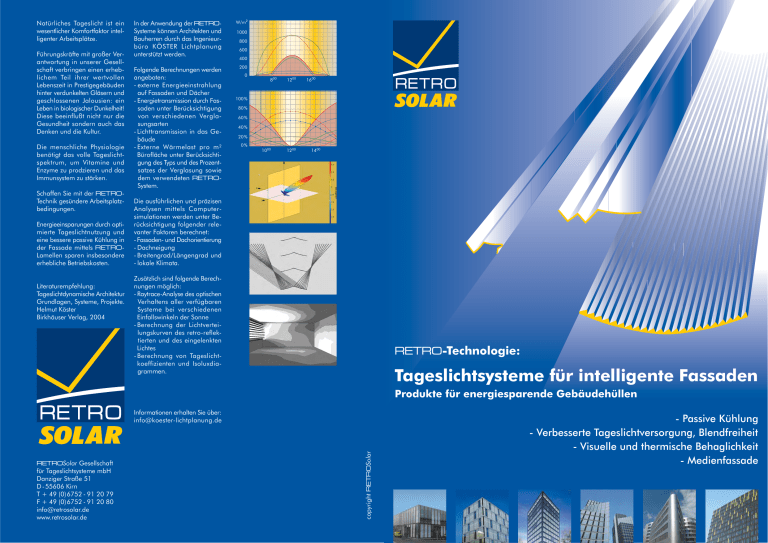 Natürliches Tageslicht ist ein wesentlicher Komfortfaktor intelligenter Arbeitsplätze. Führungskräfte mit großer Verantwortung in unserer Gesellschaft verbringen einen erheblichem Teil ihrer wertvollen Lebenszeit in Prestigegebäuden hinter verdunkelten Gläsern und geschlossenen Jalousien: ein Leben in biologischer Dunkelheit! Diese beeinflußt nicht nur die Gesundheit sondern auch das Denken und die Kultur. Die menschliche Physiologie benötigt das volle Tageslichtspektrum, um Vitamine und Enzyme zu prodzieren und das Immunsystem zu stärken. Schaffen Sie mit der RETROTechnik gesündere Arbeitsplatzbedingungen. Energieeinsparungen durch optimierte Tageslichtnutzung und eine bessere passive Kühlung in der Fassade mittels RETROLamellen sparen insbesondere erhebliche Betriebskosten. Literaturempfehlung: Tageslichtdynamische Architektur Grundlagen, Systeme, Projekte. Helmut Köster Birkhäuser Verlag, 2004 In der Anwendung der RETROSysteme können Architekten und Bauherren durch das Ingenieurbüro KÖSTER Lichtplanung unterstützt werden. W/m2 Folgende Berechnungen werden angeboten: - externe Energieeinstrahlung auf Fassaden und Dächer - Energietransmission durch Fassaden unter Berücksichtigung von verschiedenen Verglasungsarten - Lichttransmission in das Gebäude - Externe Wärmelast pro m² Bürofläche unter Berücksichtigung des Typs und des Prozentsatzes der Verglasung sowie dem verwendeten RETROSystem. 200 1000 800 600 400 0 800 1200 1600 100 % 80 % 60 % 40 % 20 % 0% 1000 1200 1400 Die ausführlichen und präzisen Analysen mittels Computersimulationen werden unter Berücksichtigung folgender relevanter Faktoren berechnet: - Fassaden- und Dachorientierung - Dachneigung - Breitengrad/Längengrad und - lokale Klimata. Zusätzlich sind folgende Berechnungen möglich: - Raytrace-Analyse des optischen Verhaltens aller verfügbaren Systeme bei verschiedenen Einfallswinkeln der Sonne - Berechnung der Lichtverteilungskurven des retro-reflektierten und des eingelenkten Lichtes - Berechnung von Tageslichtkoeffizienten und Isoluxdiagrammen. RETRO-Technologie: Tageslichtsysteme für intelligente Fassaden Produkte für energiesparende Gebäudehüllen RETROSolar Gesellschaft für Tageslichtsysteme mbH Danziger Straße 51 D - 55606 Kirn T + 49 (0) 6752 - 91 20 79 F + 49 (0) 6752 - 91 20 80 [email protected] www.retrosolar.de copyright RETROSolar Informationen erhalten Sie über: [email protected] - Passive Kühlung - Verbesserte Tageslichtversorgung, Blendfreiheit - Visuelle und thermische Behaglichkeit - Medienfassade m e nn so er RO INT t ich esl g Ta Lic Passive Kühlung und Tageslichtausleuchtung So nn e e m är W 2 > e< rm Wä ht Durchsicht 74% Licht 1 2 Arch. HZDS, Heinz Zimmermann, Zürich Arch. Gatermann + Schossig, Cologne Das Logistikzentrum in Wädenswil/Schweiz hat eine Zweite-Haut-Fassade mit integrierten RETROLux-Lamellen zur Tageslichtausleuchtung. In den RETRO-Fassaden der Stadtwerke Bochum/ Deutschland sind Gläser des Typs 66/36 mit innen liegenden RETROLuxJalousien kombiniert. Die Tageslichtlamellen werden zentral jedoch mit der Möglichkeit des individuellen Eingiffs gesteuert. RETROLux-Lamellen sind eine geniale Erfindung von Dr. Helmut Köster, Frankfurt, die zwei gegensätzliche Qualitäten verwirklichen: - RETRO-Reflexion der überhitzenden Sonne durch das w-förmige Teilstück - Lichteinlenkung des diffusen Lichtes und der flachen Wintersonne über das zweite zum Innenraum orientierte Teilstück (Light-Shelf) in den Innenraum. Somit werden 80% der Sonnenenergie, die bereits in das Gebäude eingedrungen ist, wieder nach außen zurück reflektiert. RETROLux-Lamellen werden als innen liegende Jalousien handbetrieben oder motorisiert angeboten. Sogar Sonnenenergie, die bereits durch die äußere Verglasung eingedrungen ist, wird durch das wförmige Teilstück zurück reflektiert. Mit dieser neuen Technologie können erhebliche Kosten für Kühlung und Beleuchtung eingespart werden. RETROLux ist die erste Tageslicht-Jalousie, die den Innenraum beschattet, gleichzeitig die Tageslichtautonomie von Büroräumen verbessert und zusätzlich das Gebäude kühlt. Das Stichwort ist: Passive Kühlung durch RETRO - Reflexion. Die Oberflächenqualität der Lamellen bewirkt, dass das kurzwellige Licht der Sonne ebenso reflektiert wird wie die langwellige Wärmestrahlung der Sonne und der Verglasung. Arch. Gatermann + Schossig, Cologne 3 Im Kontor 19 in Köln sind RETROLux-Jalousien innen liegend eingesetzt. Die Fenster öffnen nach außen. Dank der passiven Kühlleistung der RETROLux-Lamellen konnte auf eine traditionelle Kühlung verzichtet werden. - Univ. Ulm, Arch. Bizer + Bizer, Stuttgart (1) - Fa. Grenzebach, Bad Hersfeld, Arch. Wehner, Fulda (2) - Fa. Esta, Senden, Gerken Arch. + Ing., Ulm (3) 3 Diese Qualitäten reduzieren die Kühllast. Viele Gebäude in gemäßigten Klimata mit RETRO-Fassaden sind ohne konventionelle Kühlanlagen geplant. Kühldecken oder Bauteilkühlung sind ausreichend, um ein angenehmes Raumklima zu schaffen. Abhängig von Glasbeschichtung und RETRO-System kann die externe Wärmelast, selbst wenn die Solarstrahlung zwischen 600 und 800 W/m2 beträgt, auf weniger als 70 W/m2 Fassadenverglasung reduziert werden. Neben all diesen Fortschritten der RETRO-Technologie wird die visuelle Transparenz des Gebäudes, dank horizontaler Lamellenanordnung, erheblich verbessert. Blickt man von einer größeren Entfernung nach außen, werden die schlanken RETRO-Lamellen kaum wahrgenommen. Das Gebäude verliert nicht mehr seine Umgebung, die Glasfassade behält ihre Durchsicht. the power of innovation: do less and accomplish more O TR RE RET RO utilizing intelligent design principles from nature m So fla che So nn e RETROLux 3 RETROLuxTherm Die visuelle Transparenz von Innen bleibt ungestört. Das natürliche Lichtspektrum bleibt erhalten und der Innenraum ist hervorragend mit Tageslicht ausgeleuchtet selbst in großen Raumtiefen. Diese einmaligen Qualitäten werden durch 