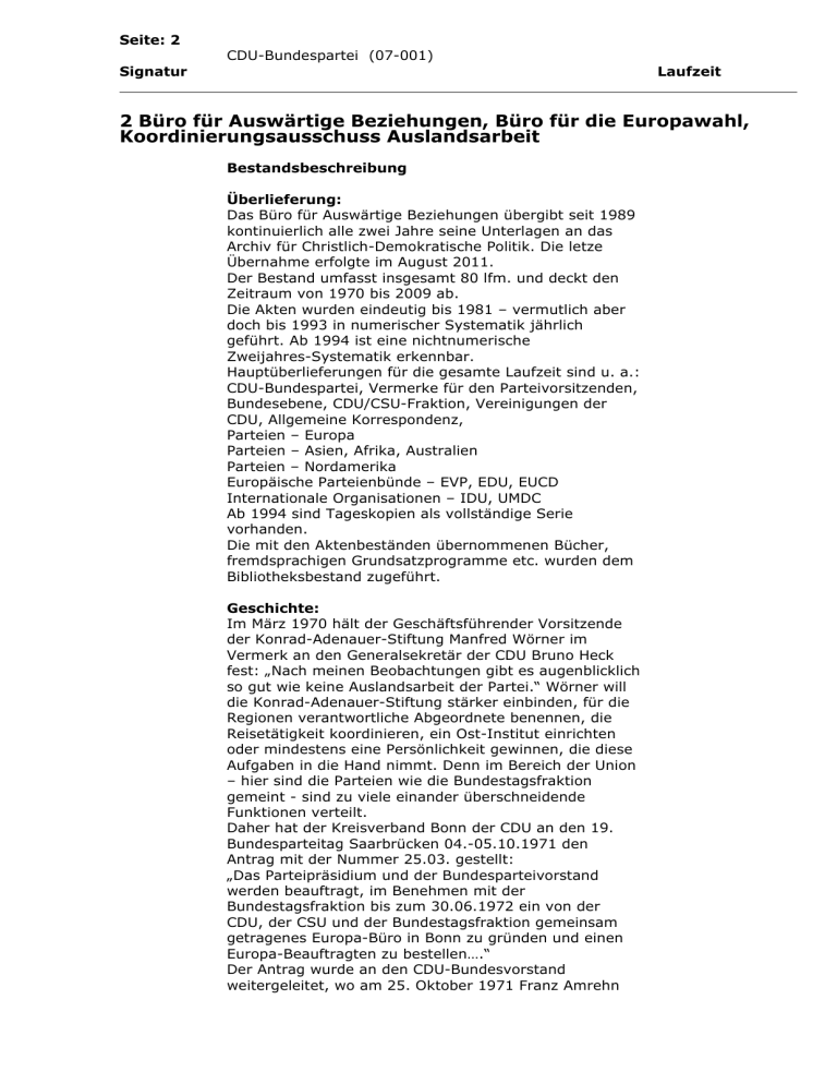 Seite: 2 CDU-Bundespartei (07-001) Signatur Laufzeit 2 Büro für Auswärtige Beziehungen, Büro für die Europawahl, Koordinierungsausschuss Auslandsarbeit Bestandsbeschreibung Überlieferung: Das Büro für Auswärtige Beziehungen übergibt seit 1989 kontinuierlich alle zwei Jahre seine Unterlagen an das Archiv für Christlich-Demokratische Politik. Die letze Übernahme erfolgte im August 2011. Der Bestand umfasst insgesamt 80 lfm. und deckt den Zeitraum von 1970 bis 2009 ab. Die Akten wurden eindeutig bis 1981 – vermutlich aber doch bis 1993 in numerischer Systematik jährlich geführt. Ab 1994 ist eine nichtnumerische Zweijahres-Systematik erkennbar. Hauptüberlieferungen für die gesamte Laufzeit sind u. a.: CDU-Bundespartei, Vermerke für den Parteivorsitzenden, Bundesebene, CDU/CSU-Fraktion, Vereinigungen der CDU, Allgemeine Korrespondenz, Parteien – Europa Parteien – Asien, Afrika, Australien Parteien – Nordamerika Europäische Parteienbünde – EVP, EDU, EUCD Internationale Organisationen – IDU, UMDC Ab 1994 sind Tageskopien als vollständige Serie vorhanden. Die mit den Aktenbeständen übernommenen Bücher, fremdsprachigen Grundsatzprogramme etc. wurden dem Bibliotheksbestand zugeführt. Geschichte: Im März 1970 hält der Geschäftsführender Vorsitzende der Konrad-Adenauer-Stiftung Manfred Wörner im Vermerk an den Generalsekretär der CDU Bruno Heck fest: „Nach meinen Beobachtungen gibt es augenblicklich so gut wie keine Auslandsarbeit der Partei.“ Wörner will die Konrad-Adenauer-Stiftung stärker einbinden, für die Regionen verantwortliche Abgeordnete benennen, die Reisetätigkeit koordinieren, ein Ost-Institut einrichten oder mindestens eine Persönlichkeit gewinnen, die diese Aufgaben in die Hand nimmt. Denn im Bereich der Union – hier sind die Parteien wie die Bundestagsfraktion gemeint - sind zu viele einander überschneidende Funktionen verteilt. Daher hat der Kreisverband Bonn der CDU an den 19. Bundesparteitag Saarbrücken 04.-05.10.1971 den Antrag mit der Nummer 25.03. gestellt: „Das Parteipräsidium und der Bundesparteivorstand werden beauftragt, im Benehmen mit der Bundestagsfraktion bis zum 30.06.1972 ein von der CDU, der CSU und der Bundestagsfraktion gemeinsam getragenes Europa-Büro in Bonn zu gründen und einen Europa-Beauftragten zu bestellen….“ Der Antrag wurde an den CDU-Bundesvorstand weitergeleitet, wo am 25. Oktober 1971 Franz Amrehn Seite: 3 CDU-Bundespartei (07-001) Signatur Laufzeit die Situation so beschreibt: „Nichts funktioniert, am allerschlechtesten aber ist die Zusammenarbeit zwischen Parteiebene und Fraktionsebene, wo jeweils ganz andere Personen Europa- und europäische CDU-Politik machen.“ Es fehlt an einer kontinuierlichen Behandlung der Europapolitik, die organisatorischen und vor allem die prärogativen Fragen waren nicht geklärt. Geplant war ohnehin ein Auslandsbüro, es sollten aber daneben keine zusätzlichen Institutionen entstehen. Bundestagspräsident Kai-Uwe von Hassel, im CDU-Präsidium zuständig für die Kontakte zu den ausländischen Parteien, wurde am 08.11.1971 im Präsidium mit der Aufgabe betraut, einen sachlichen, personellen und finanzwirtschaftlichen Vorschlag zu unterbreiten. Das Ergebnisprotokoll der Abteilungsleiterbesprechung vom 10.11.1971 vermerkt unter TOP 9. Auslandsbüro: „Mit der Auslandsarbeit ist Herr Dr. Böx beauftragt wurden. Er wird in das Konrad-Adenauer-Haus einziehen. Vorgesehen sind vier Mitarbeiter (Sekretärin, Assistent, Mitarbeiter zum IIS, Mitarbeiter für Übersetzungen).“ Botschafter a.D. Dr. Heinrich Böx war bereits im November 1970 der CDU/CSU-Fraktionsführung zugeordnet wurden, um die außenpolitische Effizienz der Arbeit der Fraktion zu stärken und zu koordinieren. Am 14.12.1971 konstituiert sich der Arbeitsausschuss Auslandsarbeit. Am 26.09.1977 tritt unter der Leitung von Heiner Geißler erstmalig der Koordinierungsausschuss Auslandsarbeit der CDU mit Kai-Uwe von Hassel, Werner Marx, Egon Klepsch und Henning Wegener zusammen. Aufgabe ist eine stärkere politische und organisatorische Koordinierung der auswärtigen Beziehungen der Partei und der ihr angeschlossenen oder nahestehenden Organisationen. Mit dem Büro für Auswärtige Beziehungen wurde 1971/72 eine eigenständige Institution für die Auslandsarbeit der CDU geschaffen. Neben der Darstellung und Verdeutlichung der Politik der CDU gegenüber dem Ausland bilden intensive Kontakte und die Zusammenarbeit mit christlich-demokratischen Parteien in aller Welt den Aufgabenschwerpunkt. Vor allem auf europäischer Ebene wird durch Zusammenschluss befreundeter Parteien die eigene Position gestärkt. Gleichzeitig werden im Büro für Auswärtige Beziehungen Informationen über die aktuelle politische Lage in verschiedenen Ländern gesammelt und ausgewertet. Mit der Betreuung ausländischer Gäste der CDU und der Verbindung zu CDU-Mitgliedern im Ausland kommen weitere Tätigkeitsfelder für das "Auswärtige Amt der CDU" hinzu. Aufgabe ist die Koordinierung der organisatorischen und politischen Zusammenarbeit der verschiedenen Gremien: CDU-Bundesgeschäftsstelle mit dem Seite: 4 CDU-Bundespartei (07-001) Signatur Laufzeit Bundesfachausschuss Außenpolitik, CDU/CSU-Bundestagsfraktion mit dem AK V für auswärtige, gesamtdeutsche, Verteidigungs- und Entwicklungspolitik bzw. der AG Außenpolitik, Konrad-Adenauer-Stiftung mit dem IIS und die Vereinigungen der CDU. Dabei ist die Zuordnung von Aufgaben für die Mitglieder des Präsidiums, die Vorsitzenden der Bundesfachausschüsse und Arbeitskreise ebenso wie die personelle Besetzung der mit Außenpolitik befassten Bundesfachausschüsse und Bundestagsausschüsse, der Arbeitskreise bzw. Arbeitsgruppen der CDU/CSU-Fraktion für Außen-, Verteidigungs- und Entwicklungspolitik von besonderer Bedeutung. Das Büro für Auswärtige Beziehungen ist der Parteiführung direkt zugeordnet, von 1994 bis 1997 war es kurzzeitig der CDU/CSU-Fraktion angegliedert. Seit 1997 ist 