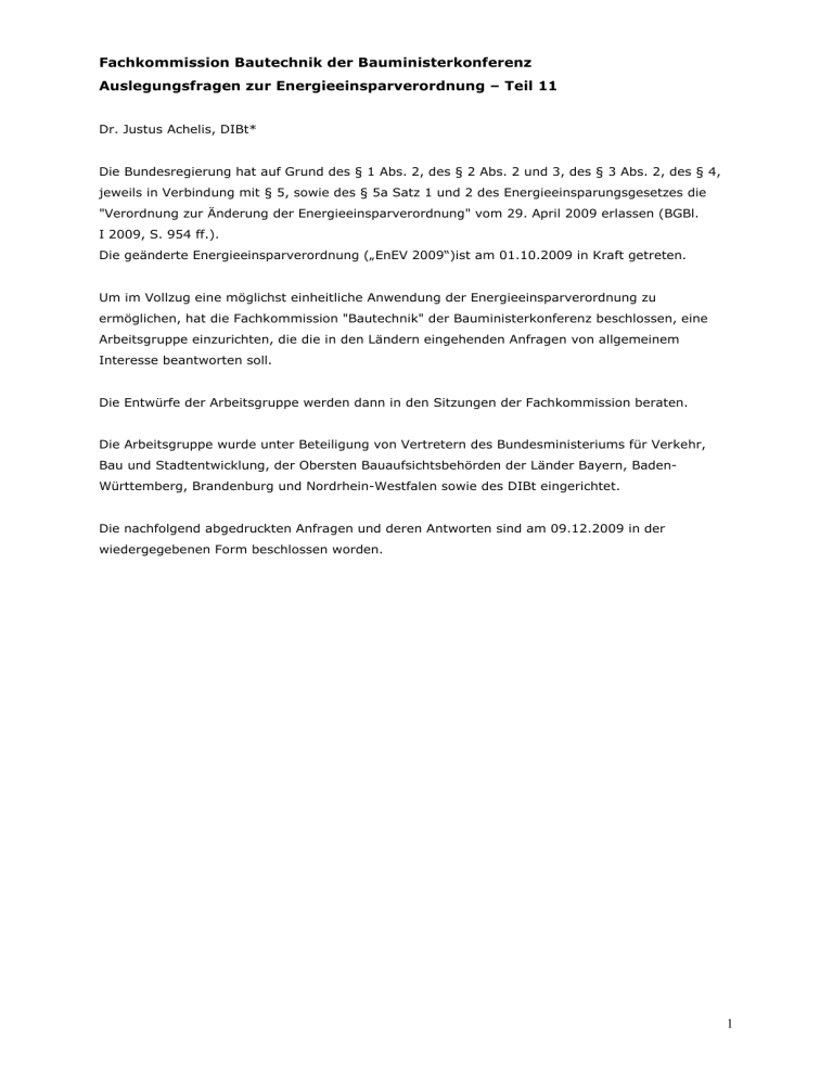 Fachkommission Bautechnik der Bauministerkonferenz Auslegungsfragen zur Energieeinsparverordnung – Teil 11 Dr. Justus Achelis, DIBt* Die Bundesregierung hat auf Grund des § 1 Abs. 2, des § 2 Abs. 2 und 3, des § 3 Abs. 2, des § 4, jeweils in Verbindung mit § 5, sowie des § 5a Satz 1 und 2 des Energieeinsparungsgesetzes die "Verordnung zur Änderung der Energieeinsparverordnung" vom 29. April 2009 erlassen (BGBl. I 2009, S. 954 ff.). Die geänderte Energieeinsparverordnung („EnEV 2009“)ist am 01.10.2009 in Kraft getreten. Um im Vollzug eine möglichst einheitliche Anwendung der Energieeinsparverordnung zu ermöglichen, hat die Fachkommission "Bautechnik" der Bauministerkonferenz beschlossen, eine Arbeitsgruppe einzurichten, die die in den Ländern eingehenden Anfragen von allgemeinem Interesse beantworten soll. Die Entwürfe der Arbeitsgruppe werden dann in den Sitzungen der Fachkommission beraten. Die Arbeitsgruppe wurde unter Beteiligung von Vertretern des Bundesministeriums für Verkehr, Bau und Stadtentwicklung, der Obersten Bauaufsichtsbehörden der Länder Bayern, BadenWürttemberg, Brandenburg und Nordrhein-Westfalen sowie des DIBt eingerichtet. Die nachfolgend abgedruckten Anfragen und deren Antworten sind am 09.12.2009 in der wiedergegebenen Form beschlossen worden. 1 Auslegungen EnEV 2009 Inhaltsverzeichnis Auslegung zu § 1 Absatz 1 EnEV 2009 .................................................................................................. 3 Auslegung zu § 3 i. V. m. Anlage 1 Nr. 2.1.2 EnEV 2009 ....................................................................... 5 Auslegung zu § 3 i. V. m. Anlage 1 Nr. 2.3 EnEV 2009 .......................................................................... 6 Auslegung zu § 3 Absatz 3 i. V. m. Anlage 1 Nr. 2.1.1 und 2.1.2 EnEV 2009 sowie zu § 4 Absatz 3 i. V. m. Anlage 2 Nr. 2.1.1 EnEV 2009 ....................................................................................................... 7 Auslegung zu § 4 Absatz 2 i. V. m. Anlage 2 Nr. 2.1.2 und 2.2.2 EnEV 2009........................................ 9 Auslegung zu § 4 Absatz 2 i. V. m. Anlage 2 Nr. 1.1.1, 2.1.1 und 2.1.2 EnEV 2009............................ 12 Auslegung zu § 4 Absatz 4 i. V. m. Anlage 2 Nummer 4 EnEV 2009 ................................................... 14 Auslegung zu § 5 EnEV 2009................................................................................................................ 16 Auslegung zu § 6 i. V. m. Anlage 4 Nr. 1 EnEV 2009 ........................................................................... 18 Auslegung zu § 6 i. V. m. Anlage 4 Nr. 2 EnEV 2009 ........................................................................... 19 Auslegung zu § 6 Abs. 1 Satz 2 i. V. m. Anlage 4 Nr. 1 EnEV 2009..................................................... 21 Auslegung zu § 9 i. V. m. Anlage 3 EnEV 2009 .................................................................................... 23 Auslegung zu § 9 Absatz 1 Satz 1 i. V. m. Anlage 3 Nr. 1 Buchstabe d) EnEV 2009 .......................... 25 Auslegung zu § 9 Absatz 1 Satz 1 i. V. m. Anlage 3 Nr. 4.2 EnEV 2009.............................................. 28 Auslegung zu § 9 Absatz 3 EnEV 2009 ................................................................................................ 30 Auslegung zu § 9 Absatz 3 EnEV 2009 ................................................................................................ 32 Auslegung zu §§ 10 und 11 EnEV 2009 ............................................................................................... 34 Auslegung zu § 10 Absatz 1 EnEV 2009 .............................................................................................. 35 Auslegung zu § 10 Absatz 1 i. V. m. § 2 Nr. 10 und 11 EnEV 2009 ..................................................... 36 Auslegung zum Begriff „nicht begehbar“ bzw. „begehbar“ im Sinne des § 10 Absatz 3 und 4 EnEV 2009....................................................................................................................................................... 38 Auslegung zu § 10 Absatz 3 und 4 EnEV 2009 .................................................................................... 40 Auslegung zu den §§ 12 und 15 EnEV 2009 ........................................................................................ 42 Auslegung zu § 14 Absatz 1 und 2 EnEV 2009 .................................................................................... 44 Auslegung zu § 14 Absatz 5 i. V. m. Anlage 5 EnEV 2009................................................................... 47 Auslegung zu § 16 Absatz 3 in Verbindung mit den §§ 28 und 29 Absatz 3 EnEV 2009 ..................... 49 Auslegung zu § 17 Absatz 3 Satz 1 EnEV 2009 ................................................................................... 51 Auslegung zu § 22 EnEV 2009.............................................................................................................. 53 Auslegung zu Anlage 1 Nr. 1.1 Tabelle 1 EnEV 2009 .......................................................................... 55 Auslegung zu Anlage 1 Nr. 1.1 EnEV 2009 .......................................................................................... 56 Auslegung zu Anlage 1 Nr. 1.1 und Anlage 2 Nr. 1.1 EnEV 2009 ........................................................ 57 Auslegung zu Anlage 3 Nr. 1 Buchstabe c) EnEV 2009 ....................................................................... 59 Auslegung zu Anlage 5 EnEV 2009 ...................................................................................................... 60 2 Auslegung zu § 1 Absatz 1 EnEV 2009 (Anwendung der Verordnung auf Tiefkühlhäuser) Frage: Wie werden Tiefkühlhäuser bei den Berechnungen nach der EnEV behandelt? Antwort: 1. Nach § 1 Abs. 1 EnEV gilt diese Verordnung „1. für Gebäude, soweit sie unter Einsatz von Energie beh