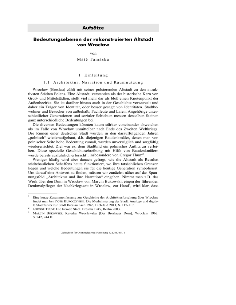 Aufsätze Bedeutungsebenen der rekonstruierten Altstadt von Wrocław von Máté Tamáska 1 Einleitung 1.1 Architektur, Narration und Raumnutzung Wrocław (Breslau) zählt mit seiner pulsierenden Altstadt zu den attraktivsten Städten Polens. Eine Altstadt, verstanden als der historische Kern von Groß- und Mittelstädten, stellt viel mehr dar als bloß einen Knotenpunkt der Außenbezirke. Sie ist darüber hinaus auch in der Geschichte verwurzelt und daher ein Träger von Identität, oder besser gesagt: von Identitäten. Stadtbewohner und Besucher von außerhalb, Fachleute und Laien, Angehörige unterschiedlicher Generationen und sozialer Schichten messen denselben Steinen ganz unterschiedliche Bedeutungen bei. Die diversen Bedeutungen könnten kaum stärker voneinander abweichen als im Falle von Wrocław unmittelbar nach Ende des Zweiten Weltkriegs. Die Ruinen einer deutschen Stadt wurden in den darauffolgenden Jahren „polnisch“ wiederaufgebaut, d.h. diejenigen Baudenkmäler, denen man von polnischer Seite hohe Bedeutung zumaß, wurden unverzüglich und sorgfältig wiedererrichtet. Ziel war es, dem Stadtbild ein polnisches Antlitz zu verleihen. Diese spezielle Geschichtsschreibung mit Hilfe von Baudenkmälern wurde bereits ausführlich erforscht1, insbesondere von Gregor Thum2. Weniger häufig wird aber danach gefragt, wie die Altstadt als Resultat städtebaulichen Schaffens heute funktioniert, wo ihre tatsächlichen Grenzen liegen und welche Bedeutungen sie für die heutige Generation symbolisiert. Um darauf eine Antwort zu finden, müssen wir zunächst näher auf das Spannungsfeld „Architektur und ihre Narration“ eingehen. Nimmt man z.B. das Werk über den Dom in Wrocław von Marcin Bukowski, einem der führenden Denkmalpfleger der Nachkriegszeit in Wrocław, zur Hand3, wird klar, dass 1 2 3 Eine kurze Zusammenfassung zur Geschichte der Architekturforschung über Wrocław findet man bei PIOTR KUROCZYŃSKI: Die Medialisierung der Stadt. Analoge und digitale Stadtführer zur Stadt Breslau nach 1945, Bielefeld 2011, S. 112-117. GREGOR THUM: Die fremde Stadt. Breslau 1945, Berlin 2003. MARCIN BUKOWSKI: Katedra Wrocławska [Der Breslauer Dom], Wrocław 1962, S. 242, 244 ff. Zeitschrift für Ostmitteleuropa-Forschung 62 (2013) H. 1 2 Máté Tamáska der Wiederaufbau auch in anderer Weise interpretiert werden kann. Der historischen Bedeutung des Sakralbaus widmet der Autor nur einige Zeilen, die innovative Eisenbetonkonstruktion des Dachstuhls behandelt er hingegen sehr ausführlich. Ebenso zeigen Bukowskis Literaturhinweise, in der hauptsächlich Werke zu Fragen der historischen Bau- und Rekonstruktionstechnologie aufgeführt werden, dass er nicht auf die Diskussion über die Identität der Architektur eingehen, sondern sich der internationalen Gemeinschaft der Denkmalpfleger präsentieren möchte. Dieses Beispiel zeigt, dass man die beiden Bereiche „Technologie“ und „Identitätskraft des Wiederaufbaus“ auch voneinander getrennt darstellen kann. Nicht jedes Architekturerbe ist nämlich automatisch ein Kulturerbe, und eine Rekonstruktion selbst ist nicht unbedingt ein symbolisches, politisches oder ideologisches Werk, sondern oft eine rein technische Herausforderung. Wenn man die symbolische Kraft des Wiederaufbaus überbetont, verfälscht man die soziologische Rolle der Architekten und läuft Gefahr, deren politische Macht zu überschätzen. Gerade wenn man über den Wiederaufbau spricht, sollte man die ideologische Komponente nur behutsam ins Spiel bringen. Der Wiederaufbau nach dem Zweiten Weltkrieg war vor allem eine technische Herausforderung, bei der die Architekten effektive Lösungen umsetzen mussten (wie die Eisenbetonkonstruktion in dem Dachstuhl). Insbesondere beim Wohnungsbau standen symbolische oder politische Zwecke erst an zweiter Stelle.4 Ein von Ideologie geprägtes Schaffen der Architekten wird auch dadurch erschwert, dass die Denkmalpflege selbst oft gar keine Möglichkeit hat, sich für oder gegen ein politisches Regime zu entscheiden, und daher gezwungen ist, mit der Politik zu kollaborieren. Sie musste und muss sich daher bis heute einer Sprache bedienen, die es ihr erlaubt, den Machthabern Finanzmittel zu entlocken.5 Hierbei ist auch zu beachten, dass sich die Narrationen in der Denkmalpflege viel schneller verändern als die morphologischen Elemente selbst. Ein typisches Beispiel hierfür ist die Stadt Poznań (Posen) in den 1920er Jahren. Obwohl die polnischen Behörden anfangs den Abriss der preußischen Prestigebauten angestrebt hatten, blieben diese Gebäude erhalten. Sie bekamen neue Funktionen, so verwandelten sich z.B. die früheren Verwaltungsgebäude in einen Campus. Neue Baudenkmäler wurden gezielt so platziert, dass sie die 4 5 WERNER DURTH: Utopia im Niemandsland: Stadtplanung als Vernichtung, in: DIETER BINGEN, HANS-MARTIN HINZ (Hrsg.): Die Schleifung. Zerstörung und Wiederaufbau historischer Bauten in Deutschland und Polen, Wiesbaden 2005, S. 47-65, hier S. 47 f. Ein typisches Beispiel dafür ist die Germanisierung des Wawels in Kraków (Krakau) seitens deutscher Denkmalpfleger während der nationalsozialistischen Besatzung, wodurch das Baudenkmal und sein Kulturerbe die Kriegszeiten überstehen konnten. SANDRA SCHLICHT: Zwischen Aneignung und Ablehnung. Deutsche Besetzung Polens und der Umgang mit Architektur und Kunst, in: ANDREA LANGER (Hrsg.): Der Umgang mit dem kulturellen Erbe in Deutschland und Polen im 20. Jahrhundert. Beiträge der 9. Tagung des Arbeitskreises in Leipzig, 26.-29. September 2002, Warszawa 2004, S. 131140, hier S. 140. Bedeutungsebenen der rekonstruierten Altstadt von Wrocław 3 preußischen Prestigebauten aus dem Stadtbild ausblendeten.6 Das Kulturerbe, also die Narration einer Stadtlandschaft, ist mehr oder weniger unabhängig von der städtebaulichen Morphologie.7 Es wird zwar durch Gebäude inspiriert, stellt aber im Grunde genommen ein Kommunikationsfeld dar. Ohne eine Gruppe, die es pflegt und bewahren will,