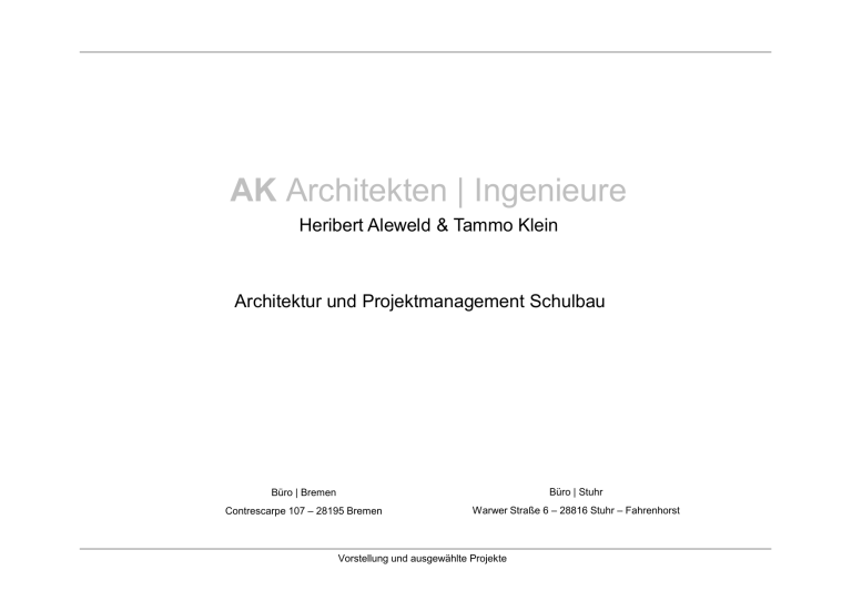 AK Architekten | Ingenieure Heribert Aleweld & Tammo Klein Architektur und Projektmanagement Schulbau Büro | Bremen Büro | Stuhr Contrescarpe 107 – 28195 Bremen Warwer Straße 6 – 28816 Stuhr – Fahrenhorst Vorstellung und ausgewählte Projekte Büro | Bremen – Contrescarpe 107 – 28195 Bremen – 0421-1652737 „Der Steuermann “ Es ist gut, jemanden zu haben, der die Ziele kennt. Es ist gut, jemanden zu haben, der die Zeiten kennt. Es ist gut, jemanden zu haben, der die Verordnungen kennt. Es ist gut, jemanden zu haben, der die Zeichen setzt. Es ist gut, jemanden zu haben, der das Steuer hält Der Steuermann, der sich für Sie auszahlt Nach Abschluss eines Betonbaupraktikums und dem Studium von Raumplanung und Bauwesen, begann meine berufliche Tätigkeit in Bremen mit Wohnungs-, Verwaltungs- und Krankenhausbau. Mit frühem Sprung in die Selbstständigkeit, bin ich seitdem in Freier Mitarbeit in Architekturbüros und namhaften Bauunternehmen in Bremen und Umgebung mit Schwerpunkt Bauleitung Krankenhaus- und Verwaltungsbau tätig. Hinzu kommen nun mehr als 10 Jahre Erfahrung in der Projektsteuerung AHO und Bauherrenvertretung für die Stadt Bremen mit dem Focus auf Sanierung und Umbau von Schulund Sozialbauten. Persönliches aus dem Büro | Bremen Heribert Aleweld Diplomingenieur *1952, Gelsenkirchen, verh. Seit 2012 Seit 2002 Seit 1980 1978-1980 1973-1978 1972 Partnerschaft mit Tammo Klein – AK Architekten |Ingenieure Gesellschaft Bremer Immobilien (Immobilien Bremen AöR Projektsteuerung in freier Mitarbeit) Freischaffender Architekt - Bremen Tätigkeit in Bauunternehmen als Bauleiter / Ausführungsplaner – Bremen Studium Raumplanung und Bauwesen – Universität Dortmund Praktikum Betonbauer – Essen Büro | Stuhr – Warwer Straße 6 – 28816 Stuhr-Fahrenhorst – 04206-30550-0 „Der Allesversteher“ Es ist gut, jemanden zu haben, der die Bauherren versteht. Es ist gut, jemanden zu haben, der die Lehrer/-innen versteht. Es ist, gut jemanden zu haben, der die Kinder versteht. Es ist gut, jemanden zu haben, der was vom Bauen versteht. Es ist gut, jemanden zu haben, der die Bauordnung versteht. Es ist gut, jemanden zu haben, der die Zahlen versteht. Sachverstand, der sich für Sie auszahlt Nach Abschluss einer Tischlerlehre und dem Studium der Architektur in Hildesheim, begann meine berufliche Tätigkeit in Braunschweig mit dem Schwerpunkt Schulen und Kindergärten: Neubau, Anbau und Bauen im Bestand. Meine Aufgaben bis zur Selbstständigkeit, umfassten Planung für große Verwaltungsgebäude, Planung und Bauleitung im Altenheim- sowie Krankenhausbau. Mit Beginn der freischaffenden Tätigkeit liegt der Schwerpunkt im Bereich von Bildungsbauten, Ganztagsschulen, Schulum- und Erweiterungsbauten, Schulsanierungen sowie dem Bau / Umbau von Kindertagesstätten. Leistungsbild von Phase 0 bis 9 der HOAI Persönliches aus dem Büro | Stuhr Tammo Klein Dipl.-Ing (FH) Architekt *1965, Bremen, Verh., 4 Kinder Seit 2012 Seit 2004 2003-2004 1995-2002 1993-1995 1991-1993 1987-1991 1981-1984 Partnerschaft mit Heribert Aleweld – AK Architekten | Ingenieure Freischaffender Architekt Gesellschaft Bremer Immobilien (Immobilien Bremen AöR Projektsteuerung in freier Mitarbeit) Planungsgruppe Gestering-de Vries-Wurster, Bremen Struhk & Partner, Braunschweig Galda & Kaiser, Braunschweig Architekturstudium an der Fachhochschule in Hildesheim Tischlerlehre Oberschule Findorff – Neubau eines Mensagebäudes, Sanierung Fenster Altbau – Bremen Neubau eines Mensagebäudes Neubau eines Mensagebäudes mit Vollküche und Fachräumen im Obergeschoss. Projektsteuerung AHO § 204 und Bauherrenvertretung für die Stadt Bremen Gesamtkosten KGR 200-700 1,7 Mio. € Status: Fertigstellung 2011 Dieses Gebäude wurde als Solitär auf dem Schulhof errichtet, da es keine Ausbaureserve bzw. Anbaumöglichkeit im Bestand gab. Im Obergeschoss befinden sich Musikräume, die mit mechanischer Lüftung und Schallschutzfenstern versehen sind. Fassade WDVS mit Spaltklinkern, Fenster HolzAlu AK Architekten | Ingenieure – Büro | Bremen Sanierung und innere Umbauten Hermann-Böse-Gymnasium – Bremen Hermann-Böse-Gymnasium Energetische Sanierung Dächer und Fenster – 2002-2005. Natursteinsanierung Fassaden – 2002-2005. Einrichtung zur Ganztagsschule – 2010-2011. Sanierung Brandschutz und Akustik – 2011-2012. Veranstaltungstechnik Aula – 2012. Projektsteuerung AHO § 204 und Bauherrenvertretung für die Stadt Bremen AK Architekten | Ingenieure – Büro | Bremen Gesamtkosten KGR 200-700 4,0 Mio. € Sanierung und innere Umbauten Hermann-Böse-Gymnasium – Bremen Gebäude Bj. 1904. Nach Sanierung der Gebäudehülle, mehrere interne Umbauten, Raumoptimierungen und Sanierungen (Brandschutz, Akustik, Naturwissenschaftsräume, Aula). Einbau einer Mensa mit Küche (120 Sitzplätze, mit Erweiterungsoption) im ehemaligen Kohlenkeller. AK Architekten | Ingenieure – Büro | Bremen Sanierung Technisches Berufsbildungszentrum Mitte – Bremen Techn. Berufsbildungszentrum Mitte Das Berufsschulgebäude für Elektrotechnik (Bj. 1973), mit Fassaden aus Waschbetonplatten und PCBhaltigen Fugenversiegelungen wurde nach der Gesamtsanierung dank der fast perfekt kubischen Form zeitweise zur energiegünstigsten Schule Bremens Energetische Sanierung Dächer, Fenster und Fassaden, PCB-Sanierung und innere Umbauten 2006 – 2007 Projektsteuerung AHO § 204 und Bauherrenvertretung für die Stadt Bremen Gesamtkosten KGR 200-700 2,2 Mio. € AK Architekten | Ingenieure – Büro | Bremen Sanierung GS Curiestraße – Bremen GS Curiestraße Die PCB-Belastung dieser Grundschule erforderte den Rückbau fast bis auf den Rohbau; der Putz musste vollständig entfernt werden, was unter anderem die völlige Erneuerung der Elt.Installation nach sich zog. Fassade, Holzfenster und WSVS mit MF und mineralischem Putz. Das alte Kaltdach wurde zu einem Warmdach umfunktioniert. Einbau eines zweiten Fluchtwegs über die neue Außentreppe rechts 