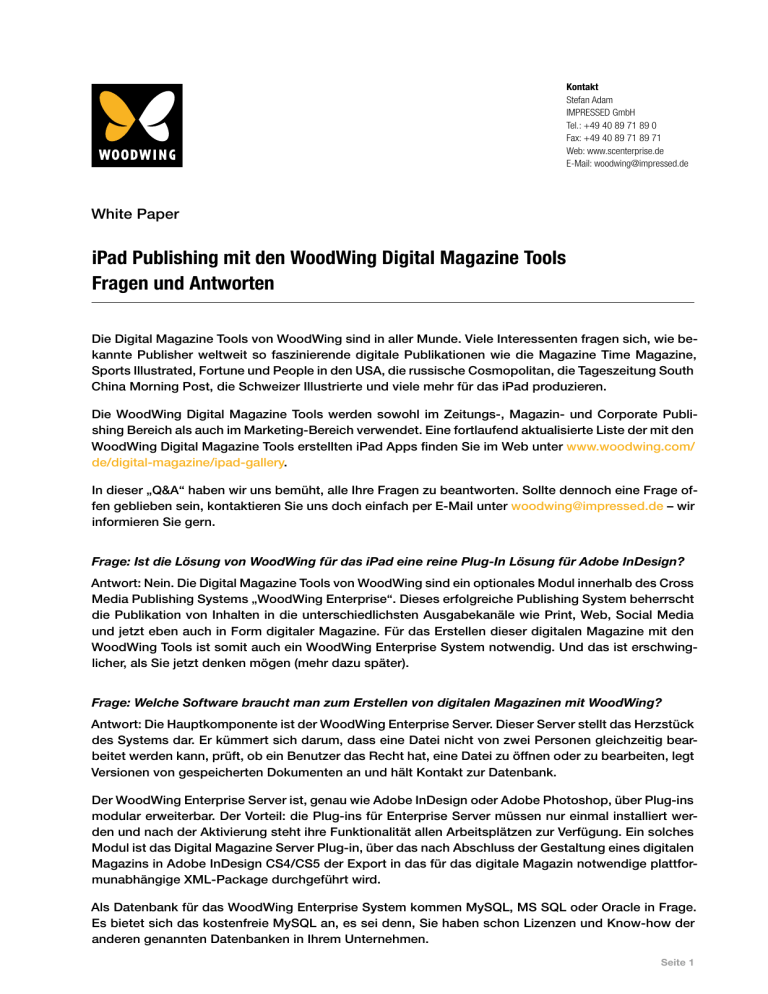 Kontakt Stefan Adam IMPRESSED GmbH Tel.: +49 40 89 71 89 0 Fax: +49 40 89 71 89 71 Web: www.scenterprise.de E-Mail: [email protected] White Paper iPad Publishing mit den WoodWing Digital Magazine Tools Fragen und Antworten Die Digital Magazine Tools von WoodWing sind in aller Munde. Viele Interessenten fragen sich, wie bekannte Publisher weltweit so faszinierende digitale Publikationen wie die Magazine Time Magazine, Sports Illustrated, Fortune und People in den USA, die russische Cosmopolitan, die Tageszeitung South China Morning Post, die Schweizer Illustrierte und viele mehr für das iPad produzieren. Die WoodWing Digital Magazine Tools werden sowohl im Zeitungs-, Magazin- und Corporate Publishing Bereich als auch im Marketing-Bereich verwendet. Eine fortlaufend aktualisierte Liste der mit den WoodWing Digital Magazine Tools erstellten iPad Apps finden Sie im Web unter www.woodwing.com/ de/digital-magazine/ipad-gallery. In dieser „Q&A“ haben wir uns bemüht, alle Ihre Fragen zu beantworten. Sollte dennoch eine Frage offen geblieben sein, kontaktieren Sie uns doch einfach per E-Mail unter [email protected] – wir informieren Sie gern. Frage: Ist die Lösung von WoodWing für das iPad eine reine Plug-In Lösung für Adobe InDesign? Antwort: Nein. Die Digital Magazine Tools von WoodWing sind ein optionales Modul innerhalb des Cross Media Publishing Systems „WoodWing Enterprise“. Dieses erfolgreiche Publishing System beherrscht die Publikation von Inhalten in die unterschiedlichsten Ausgabekanäle wie Print, Web, Social Media und jetzt eben auch in Form digitaler Magazine. Für das Erstellen dieser digitalen Magazine mit den WoodWing Tools ist somit auch ein WoodWing Enterprise System notwendig. Und das ist erschwinglicher, als Sie jetzt denken mögen (mehr dazu später). Frage: Welche Software braucht man zum Erstellen von digitalen Magazinen mit WoodWing? Antwort: Die Hauptkomponente ist der WoodWing Enterprise Server. Dieser Server stellt das Herzstück des Systems dar. Er kümmert sich darum, dass eine Datei nicht von zwei Personen gleichzeitig bearbeitet werden kann, prüft, ob ein Benutzer das Recht hat, eine Datei zu öffnen oder zu bearbeiten, legt Versionen von gespeicherten Dokumenten an und hält Kontakt zur Datenbank. Der WoodWing Enterprise Server ist, genau wie Adobe InDesign oder Adobe Photoshop, über Plug-ins modular erweiterbar. Der Vorteil: die Plug-ins für Enterprise Server müssen nur einmal installiert werden und nach der Aktivierung steht ihre Funktionalität allen Arbeitsplätzen zur Verfügung. Ein solches Modul ist das Digital Magazine Server Plug-in, über das nach Abschluss der Gestaltung eines digitalen Magazins in Adobe InDesign CS4/CS5 der Export in das für das digitale Magazin notwendige plattformunabhängige XML-Package durchgeführt wird. Als Datenbank für das WoodWing Enterprise System kommen MySQL, MS SQL oder Oracle in Frage. Es bietet sich das kostenfreie MySQL an, es sei denn, Sie haben schon Lizenzen und Know-how der anderen genannten Datenbanken in Ihrem Unternehmen. Seite 1 Zudem benötigen Sie Komponenten, die auf den Arbeitsplätzen installiert werden. Dazu zählen Smart Connection und die Digital Magazine Tools. Beides sind Plug-ins für Adobe InDesign CS4/CS5. Smart Connection stellt die Verbindung zum WoodWing Enterprise Server her und zeigt Ihnen die im System gespeicherten Dokumente an. Mit den Digital Magazine Tools erhalten Sie in Adobe InDesign CS4/CS5 zusätzliche Paletten, mit denen Sie interaktive Elemente wie Slideshows, Videos, Hyperlinks, Hotspots, automatische Inhaltsverzeichnisse und mehr in Ihr layoutetes InDesign-Dokument einbringen können. Wie diese Tools genau funktionieren, können Sie unter www.woodwing.com/en/flash/webinar-digitalmagazines-14 sehen. Damit Ihre Arbeitsstationen mit dem WoodWing Enterprise Server Kontakt aufnehmen können, sind zudem sogenannte Enterprise Server Connections notwendig. Diese Connections werden auf dem Enterprise Server als ‚Concurrent Connections’ lizenziert. Die Anzahl der erworbenen Connections legt die maximale Anzahl der Nutzer fest, die gleichzeitig auf den WoodWing Enterprise Server zugreifen können. Content Station Pro dient der Organisation innerhalb des Workflows. Mit Content Station können Sie Inhalte sortieren, bearbeiten, suchen, verwalten und vieles mehr. Content Station ist genau wie die Enterprise Server Connections, die Smart Connections sowie die Digital Magazine Tools als ‚Concurrent Lizenz’ erhältlich. Das hat den Vorteil, dass Sie diese Komponenten auf beliebig vielen Arbeitsplätzen installieren können. Die maximale Anzahl der Nutzer, die gleichzeitig diese Module nutzen können, hängt ausschließlich von der Zahl der erworbenen Lizenzen ab. Smart Connection, die Digital Magazine Tools und die Content Station Pro gibt es als kostengünstiges Bundle. Frage: Wo kann ich die WoodWing Lösung kaufen? Antwort: Da die Cross Media Publishing-Plattform WoodWing Enterprise kein Boxprodukt ist, dass sich per ‚Doppelklick’ installieren lässt, vertreiben wir das System ausschließlich über von uns autorisierte Systemintegratoren, die auch die Installation, Schulung, Produktionsbegleitung etc. durchführen. Eine Liste aller Systemintegratoren in Deutschland, Österreich und der Schweiz finden Sie unter www.scenterprise.de/scewebsite/partner/partner.htm Frage: Und was kostet ein WoodWing Enterprise System zur Produktion von digitalen Magazinen? Antwort: Das hängt von verschiedenen Variablen ab. Die reinen Softwarekosten für ein kleines „Rundumsorglos-System“ für zwei InDesign-Arbeitsplätze bestehend aus dem WoodWing Enterprise Server, zwei Digital Magazin Tools-Lizenzen, zwei Smart Connection-Lizenzen, zwei Content Station Pro sowie zwei Server-Connections liegt, ohne Adobe InDesign, bei etwa 7.200 Euro netto. Sie erhalten damit übrigens das gleiche vollwertige Publishing-System, mit dem unter anderem Titel wie Stern, Brigitte, GEO, Gala, SportB