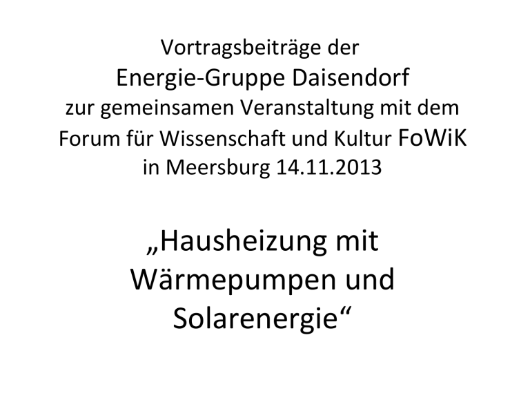 Vortragsbeiträge der Energie-Gruppe Daisendorf zur gemeinsamen Veranstaltung mit dem Forum für Wissenschaft und Kultur FoWiK in Meersburg 14.11.2013 „Hausheizung mit Wärmepumpen und Solarenergie“ Hausheizung mit Wärmepumpen Funktionsweise und Kosten von elektrisch angetriebenen Kompressoranlagen mit Beispiel und Anhang Dr. H. Henseler Prinzip der Wärmepumpen • Wärmepumpe befördert Wärme von einer niedrigeren auf eine höhere Temperatur – Sie nimmt Energie aus einer Wärmequelle, – führt ihr Arbeit (mechanische Energie) zu und – liefert die gesamte Energie an einen Verbraucher. Verfahren wie beim Kühlschrank (Wärmequelle ist das Kühlgut, geheizt wird die Küche) 3 Schema einer Kompressoranlage Antriebsenergie, Strom oder Gas Mechanische Arbeit Umweltenergie Heizenergie Verdichter Luft Erde Wasser Verdampfer Verflüssiger Entspannungsventil Wärmequelle Transportmedium (Wasser, Sole) Arbeitskreis Arbeitsmittel (Propan, CO2) Verbraucher Wärmeträger (Wasser, evtl. Luft) 4 Bauarten der Kompressoranlage Strom für Elektromotor Gas für Gasmotor Solarkollektor und Wärmespeicher liefern Wärme Umweltenergie Außenluft Abluft Antriebsenergie Heizenergie Verdichter Luft Kollektor (flach) Erdsonde (tief) Erde Wasser Förder- und Schluckbrunnen, Abwasser Verdampfer Verflüssiger Entspannungsventil Wärmequelle Arbeitskreis Vertauschung Klimaanlage Verbraucher Fußbodenheizung, Flächenheizung 5 Luftheizung Leistungsziffer der Wärmepumpe Leistungsziffer (LZ) = Heizenergie Antriebsenergie Heizenergie = Umweltenergie + Antriebsenergie Andere Bezeichnungen: Leistungszahl, Coefficient of Performance (COP) Arbeitszahl; für das ganze Jahr: Jahresarbeitszahl 6 Temperaturbereiche der Wärmequellen Leistungsziffer fällt mit sinkender Temperatur der Wärmequelle Temperatur -25°C -5°C 0°C 5°C 10°C 15°C 7 Kosten* der Wärmepumpen • Wärmepumpe mit Warmwasserbereitung für Einfamilienhaus mit 8-9 kW Heizleistung – Wärmepumpenanlage ohne Erschließung der Wärmequelle 8 500 - 12 000 € • Wärmequellenerschließung für 8-9 kW Heizleistung – – – – Luft- Wärmetauscher mit Ventilator Erdkollektoren (fach) mit Umwälzpumpe Grundwasser (Förder- und Schluckbrunnen) Erdwärmesonden (tief) mit Umwälzpumpe 200 - 600 € 2 000 - 2 700 € 4 500 - 5 500 € 5 200 - 8 500 € Erschließung macht 3 – 50 % der Gesamtkosten aus. * Richtwerte, abhängig von örtlichen und geologischen Bedingungen Quelle: Verbraucherportal Erdwärmepumpe.de 8 Anhang zum Vortrag „Hausheizung mit Wärmepumpen“ 9 Arbeitsschritte der Kompressorwärmepumpe 1. Transportmittel bringt per Pumpe Umwelt-Wärme von der Wärmequelle zum Verdampfer (ggf. auch Solarwärme) 2. Arbeitsmittel verdampft bei geringen Druck im Verdampfer 3. Arbeitsmittel wird im Verdichter unter Zufuhr der Antriebsenergie komprimiert und strömt zum Verflüssiger 4. Arbeitsmittel kondensiert bei hohem Druck im Verflüssiger 5. Arbeitsmittel strömt zum Verdampfer und reduziert seinen Druck im Entspannungsventil 6. Wärmeträger bringt per Pumpe die Umweltwärme plus Antriebsenergie vom Verflüssiger zur Heizung 7. Fußbodenheizung verteilt die Wärme im Haus 10 Betriebsarten der Wärmepumpen • Monovalent Heizung nur mit Wärmepumpe, (keine andere Energiebereitstellung) • Bivalent ein zusätzlicher Energielieferant (z. B. Gastherme für Spitzenlast) • Multivalent Mehrere Energielieferanten (z.B. Gastherme und Kaminfeuer/ Elektroheizstab) 11 Bezeichnungen von Wärmepumpenanlagen • Nach der Wärmequelle – Luft-WP – Erdwärme-WP • Nach dem Transportmedium der Wärme – Sole-WP – Sole/Wasser-WP • Nach der Antriebsenergie für den Kompressor – Elektro-WP – Gasmotor-WP – Es gibt auch Gas-getriebene WP (sog. Absorber-WP) • Nach der Wärmequelle und Wärmeverteilung – Wasser/Wasser-WP – Wasser/Luft –WP (in Deutschland selten) 12 Wärmepumpe als Klimaanlage • Nach Vertauschung bzw. Umschaltung von Verdampfer und Verflüssiger kann der Energiefluss umgekehrt werden, so dass die Wärmepumpe die warme Seite abkühlt und die kalte Seite aufheizt. • Das System arbeitet dann als Klimaanlage. • Die Funktion und die Effizienz der Anlage hängt von den thermodynamischen Eigenschaften des Arbeitsmittels ab. • Anlagen, bei denen die Wärmequelle und der Arbeitskreis an verschiedenen Orten untergebracht sind, bezeichnet man als Split- Anlagen. 13 Grundsätze der Auslegung von Wärmepumpen • • • • • Wärmequelle mögl. hoher Temperatur nutzen Niedertemperaturheizung verwenden Wärmebedarf genau ermitteln Wärmebedarf-Schwankung gering halten Anlagenkomponenten sorgfältig abstimmen (Zu große oder zu kleine Dimensionierung der Komponenten beeinträchtigt die Jahresarbeitszahl bzw. Wirtschaftlichkeit) 14 Hausheizung mit Solarenergie Heizungsunterstützung durch Solarthermie und Solarstrom mit Beispielen und Anhang E. Kienscherf Dr. P. Boese 15 Heizungsunterstützung durch Nutzung der Solareinstrahlung in Form von: • Solarthermie - bei Öl- / Gas- /(ggfs. Elektro-) Heizungsanlagen - bei Wärmepumpenanlagen • Solarstrom - bei Elektroheizungsanlagen - bei Wärmepumpenanlagen Solarthermische Energieerträge Beispiel einer Kollektoranlage mit Vakuumröhren Monatlicher Verlauf der Solarerträge in kWh pro Jahr und qm Aperturfläche (Vakuumröhren 3,75 qm) gemessene Jahreserträge über 10 Jahre: Mittel 688 kWh/J*qm Minimal 598 kWh/J*qm Maximal 812 kWh/J*qm Monatsertrag zu mittl. Jahresertrag 0,18 0,16 Mittel Min 0,14 Max 0,12 0,1 0,08 0,06 0,04 0,02 0 1 2 3 4 5 6 Monat 7 8 9 10 11 12 Warmwasseraufbereitung durch Solarthermie Solarkollektoren (Flach oder Röhren) mit SolarWarmwasserspeicher und Umwälzpumpe Solarer Wärmeertrag reicht im Sommerhalbjahr zu 80 - 100% für den normalen Warmwasserbedarf Über das ganze Jahr kann bis zu 70% des Energiebedarfs eingespart werden Heizungsbetrieb mit schlechten Wirkungsgrad im Sommer wird vermieden (ggfs. Nachheizen mit Elektroheizstab) Mit einer Kollektorfl