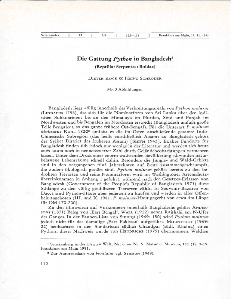 Salamandra 17 3/4 112-118 Frank furt am Mai n, 15. 12. 198 1 Die Gattung Python in Bangladesh1 (Reptilia: Serpentes: Boidae) DIETER KocK & HEINZ SCHRÖDER Mit 3 Abbildungen Bangladesh liegt völlig innerhalb des Verbreitungsareals von Python molurns (LINNAEUS 1758), das sich für die Nominatform von Sri Lanka über den indischen Subkontinent bis an den Himalaya im Norden, Sind und Punjab im Nordwesten und bis Bengalen im Nordosten erstreckt (Bangladesh umfaßt große Teile Bengalens, so das ganze frühere Ost-Bengal). Für die Unterart P. molurus bivittatus KuHL 18202 umfaßt es die im Osten anschließende gesamte IndoChinesische Subregion ( das heißt einschließlich Assam; zu Bangladesh gehört der Sylhet District des früheren Assam) [SMITH 1943]. Exakte Fundorte für Bangladesh finden sich jedoch nur wenige in der Literatur und werden sich heute auch kaum noch in nennenswerter Zahl durch Geländebeobachtungen vermehren lassen. Unter dem Druck einer enorm wachsenden Bevölkerung schwinden naturbelassene Lebensräume schnell dahin. Besonders die Jungle- und Wald-Gebiete sind in den vergangenen fünf Jahrzehnten auf Reste zusammengeschrumpft, die zudem ökologisch gestört sind. Python molurus gehört bereits zu den bedrohten Tierarten und seine Nominatform wird im Washingtoner Artenschutzübereinkommen in Anhang 1 geführt, während nach den Gesetzes-Erlassen von Bangladesh (Government of the People's Republic of Bangladesh 1973) diese Schlange zu den völlig geschützten Tierarten zählt. In Souvenir-Bazaren von Dacca sind Python-Häute aber jederzeit zu kaufen und werden in aller Offenheit angeboten (III. und X . 1981: P. molurus-Haut gegerbt von etwa 4m Länge für DM 170-200). Zu den Hinweisen auf Vorkommen innerhalb Bangladeshs gehört ANDERSONs (1871) Beleg von ,East Bengal'; WALL (1912) nennt Rajshahi am N-Ufer des Ganges. In der Faunen-Liste von SrnorQr (1969: 150) wird Python molurus jedoch nicht für das damalige ,East Pakistan' aufgeführt. MouNTFORT (1969: 22) beobachtete in den Sundarbans südlich Chandpai (südl. Khulna) einen Python; dieser Nachweis wurde von HENDRICHS (19 75) übernommen. Welchen 1 Senckenberg in der Dritten Welt, N r. 6. Nr. 5: N atur u. Museum, 111 (1): 9-1 9. Frankfurt am Main 1981. 2 Zur Autorenschaft von bivittatus vgl. STIMSON (1969). 112 Teil der Sunderbuns (= Sundarbans) HICKIEs (1931) Angabe von Pythons betrifft, ist nicht feststellbar, aber für den in Bangladesh liegenden Teil der Mangroven-Wälder wird Python molurus verschiedentlich genannt (HusAIN 1974, Anonymus 1977, AHMAD 1981). Für die hügeligen und noch bewaldeten Teile der Distrikte Sylhet, Mymensingh, Chittagong und Chittagong Hill Tracts gibt HusAIN (1974) das Vorkommen an, ohne aber im einzelnen genauere Fundorte zu nennen. MoNTAQUIM & al. (1980) führen in ihrer Check-Liste für Bangladesh unter 28 Schlangen ebenfalls P. molurus auf, geben aber für ihr Material, das insgesamt Schlangen aus den Distrikten Chittagong, Chittagong Hill Tracts, Dacca, Faridpur, Jamalpur, Jessore, Kushtia, Pabna, Rajshahi, Sylhet und Tangail betrifft, auch keine exakten Fundpunkte an. Für den Madhupur Jungle im Tangail District waren keine Angaben zu erhalten (D. K., 16.-21. III. 1981). Funde aus benachbarten Regionen müssen das Verbreitungsbild abrunden (Abb. 1) . Aus dem indischen Teil der Sundarbans nennen MurrnERJEE & GUPTA (1964) Python molurus für den ,Basirhat Reserve Forest' entlang der Grenze zu Bangladesh. Die Art wurde außerdem nachgewiesen in Calcutta (SMITH 1943: 106, fide RussEL 1796), im Nepal Terai (WALL 1907), im Tondu Forest und in Baradighi (ca. 35 km nw. Jalpaiguri) im Jalpaiguri District (INGLIS & al. 1920), ebenfalls im Jalpaiguri District von AHMAD (1981), in Cooch Behar (WALL 1912: zuvor als Python reticulatus [SCHNEIDER 1801] fehldeterminiert; AHMAD 1981), in den Buxa Duars (WALL 1912), speziell bei Rajabhatkhaw a (AHMAD 1981) sowie in Cachar (ANDERSON 1871). MouNTFORT (1968: 1261 , 1969: 115) beschreibt den Fang eines Python im November 1966 am Shishak River beim Gonacheri-Rasthaus oberhalb Pablakhali in den nordöstlichen Chittagong Hill Tracts, nahe der Grenze zur indischen Provinz Mizoram (Assam). Nach dem Fotografieren (MoUNTFORT 1968: 1255, 1969: Taf. 23a-b) wurde das Exemplar freigelassen, später an H and der Bilder als Python reticulatus (SCHNEIDER 1801) identifiziert (JERRY WooDANDERSON det.) und als Erstnachweis der Art für Bangladesh angeführt. Im Jahre 1968 soll P. reticulatus auch im Ukhia Jungle südöstlich von Cox's Bazar (Chittagong District) durch ToM ROBERTS aufgefunden worden sein (MouNTFORT 1969: 116); leider wurde von diesem Python keine Abbildung publiziert. In SmDIQis (1969: 150) Faunenliste wird P. reticulatus nicht geführt, obgleich ihm die Berichte der World Wildlife Fund-Expedition (MouNTFORT 1968, 1969) bekannt waren. Wenn MoNTAQUIM & al. (1980) angeben, daß eine Anzahl für Bangladesh bekannter Schlangen bislang nicht gesammelt werden konnten, zum Beispiel der Netz-Python, so bezieht sich dies wahrscheinlich auf die Beobachtungen MouNTFORTs, deren Veröffentlichungen den Autoren bekannt sind. MouNTFORTs Abbildungen seines „Python reticulatus" vom Shishak River zeigen aber eindeutig einen Python molurus (LINNAEUS 1758) . Die Form des Kopfes und seine typischen Zeichnungs-Elemente erlauben ebenso wie das Fleckenmuster des Körpers zweifelsfrei die richtige Zuordnung der fotografierten Schlange, was nicht zuletzt auch durch die entsprechenden Abbildungen etwa bei WALL (1912 : Taf. 17) und bei SMITH (1943 : Fig. 33) zu belegen ist. Die ausgeprägte schwarze Kopfzeichnung in Form einer Speerspitze (P. reticulatus zeigt auf dem Kopf nur einen schwarzen Längsstreifen von der Schnauze bis 113 88° ,6. ,6. 90 89° \\'EST BE.'-GAL 1 L,'D!A l,6. 91° ASSAM ( IXDlA 1 92 93° BANGLADESH ·-· - ·- ·- · 11'.'TER.'IATIOX..\I. BOl 'XDARY 1 -- ----- D!STRICT 80\.'XDARY ................... SL13Dl\1SIOX BOl-:\'DARY g:j] XATIOXAL C.APITAL G 0 26 DISTR